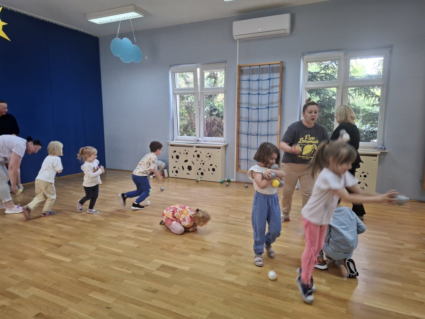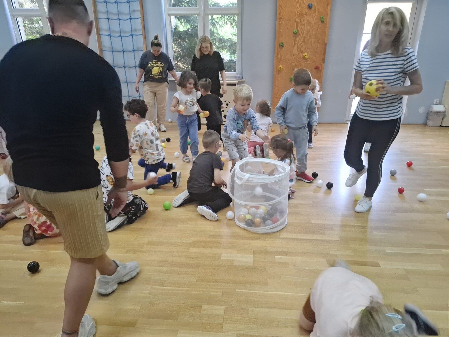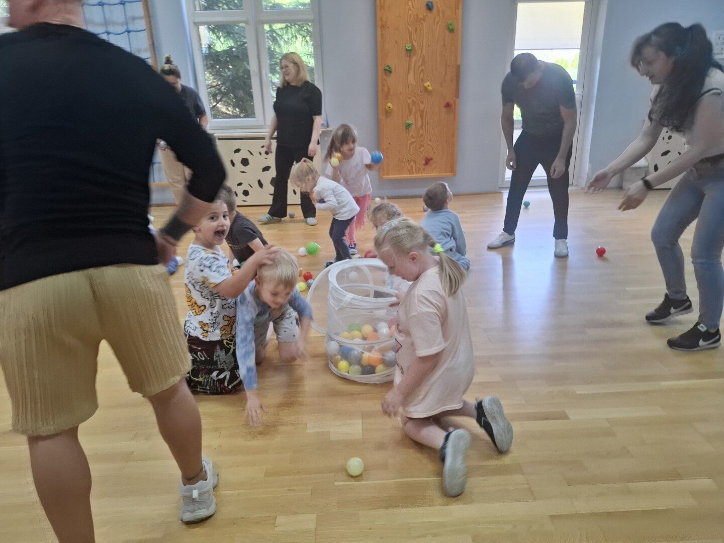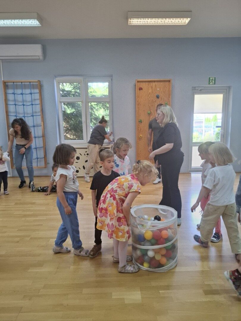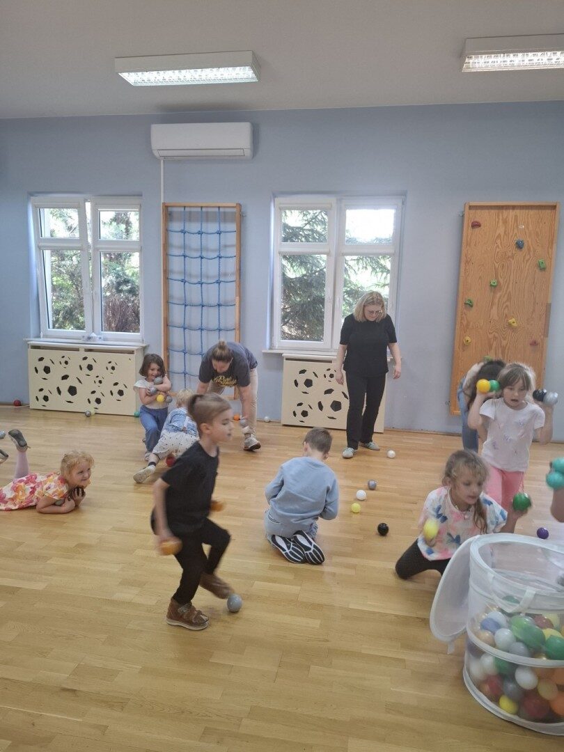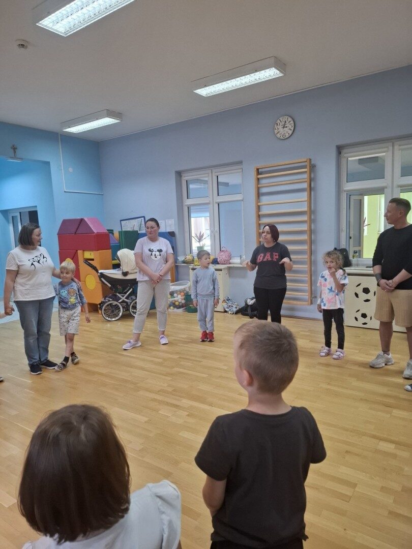 Dnia 12.06.2025r. w grupie „ŻABKI” odbyło się spotkanie integracyjne rodziców i dzieci. Podczas warsztatów przedszkolaki z rodzicami miały możliwość spędzenia wspólnie czasu doskonale bawiąc się podczas zabaw muzyczno- ruchowych. Spotkanie rozpoczęliśmy od zaśpiewania piosenki pt „Hej witam Was” , która towarzyszy nam zawsze przed rozpoczęciem zajęć. Następnie wykonaliśmy rozgrzewkę wykorzystując znane dzieciom zabawy muzyczno-ruchowe takie jak „Body Perfection” czy „A ram zam zam”. Następnie bawiliśmy się z wykorzystaniem Sigumy, woreczków gimnastycznych oraz obręczy. Kolejną aktywnością była joga prowadzona w ramach innowacji pedagogicznej. Dzieci wspólnie z rodzicami wykonały rozgrzewkę, następnie pokazały dzieciom ich ulubione asany takie jak: drzewo, kobra, lew, krzesło, żaba bocian, kwiat lotosu, pies z głową w górze, pies z głową w dół, kwiat lotosu itp. Na zakończenie rodzice wykonali masaż dzieciom wykorzystując w tym celu piłki sensoryczne po czym nastąpiła zamiana i to dzieci robiły masaż swoim rodzicom. Podczas warsztatów zarówno rodzice jak i dzieci wykazali się twórczą kreatywnością. Na koniec wykonaliśmy ćwiczenia relaksacyjne. Tego typu spotkanie dało możliwość twórczego spędzenia czasu z dziećmi. Spotkanie przebiegało w miłej i serdecznej atmosferze.