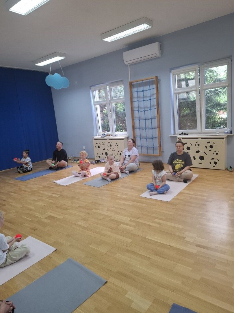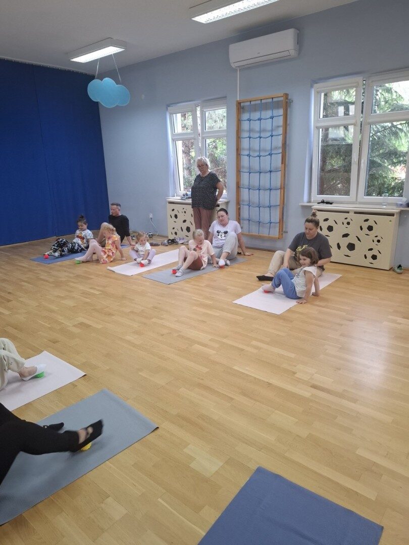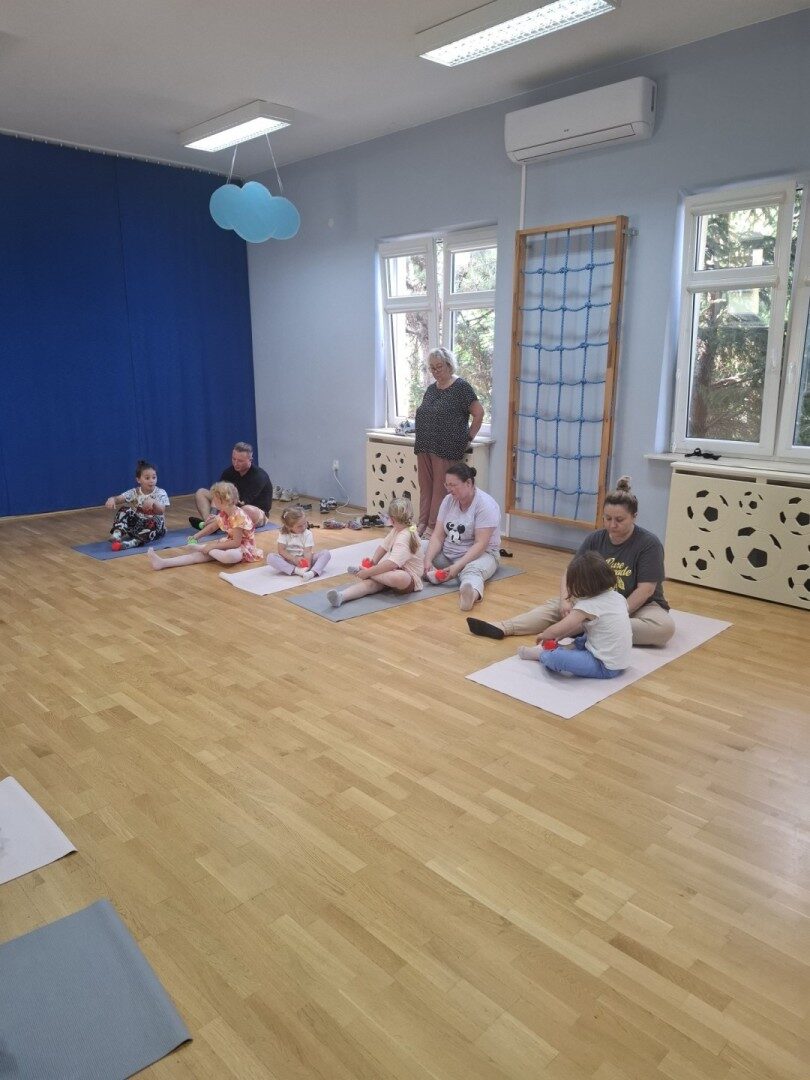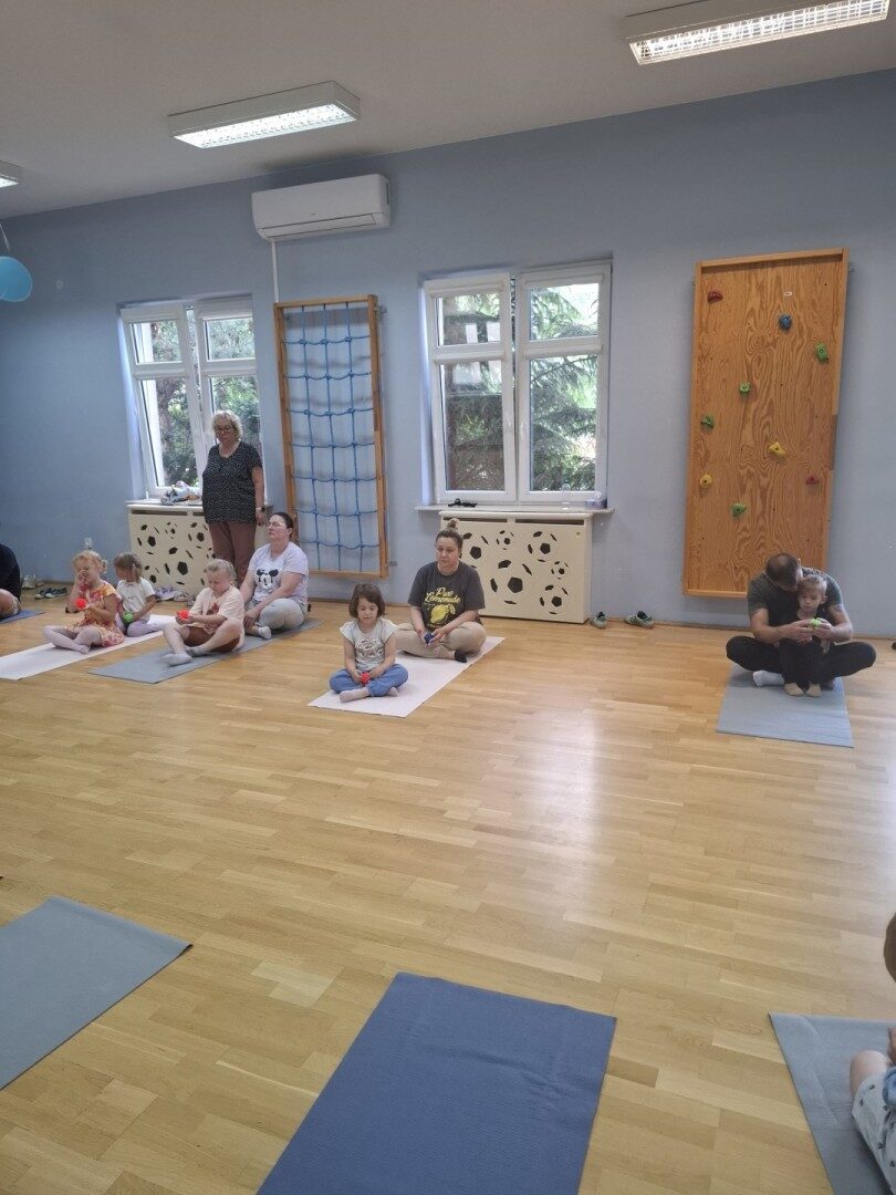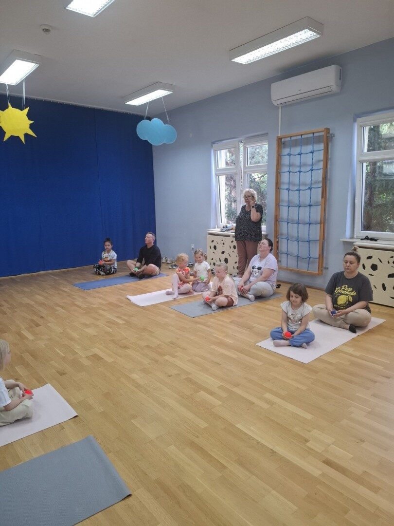 Dnia 12.06.2025r. w grupie „ŻABKI” odbyło się spotkanie integracyjne rodziców i dzieci. Podczas warsztatów przedszkolaki z rodzicami  miały możliwość spędzenia wspólnie czasu doskonale bawiąc się podczas zabaw muzyczno- ruchowych. Spotkanie rozpoczęliśmy od zaśpiewania piosenki pt „Hej witam Was” , która towarzyszy nam zawsze przed rozpoczęciem zajęć. Następnie wykonaliśmy rozgrzewkę wykorzystując znane dzieciom zabawy muzyczno-ruchowe takie jak „Body Perfection” czy „A ram zam zam”. Następnie bawiliśmy się z wykorzystaniem  Sigumy, woreczków gimnastycznych oraz obręczy. Kolejną aktywnością była joga prowadzona w ramach innowacji pedagogicznej. Dzieci wspólnie z rodzicami wykonały rozgrzewkę, następnie pokazały dzieciom ich ulubione asany  takie jak: drzewo, kobra, lew, krzesło, żaba bocian, kwiat lotosu, pies z głową w górze, pies z głową w dół, kwiat lotosu itp. Na zakończenie rodzice wykonali masaż dzieciom wykorzystując w tym celu piłki sensoryczne po czym nastąpiła zamiana i to dzieci robiły masaż swoim rodzicom. Podczas warsztatów zarówno rodzice jak i dzieci wykazali się twórczą kreatywnością. Na koniec wykonaliśmy ćwiczenia relaksacyjne. Tego typu spotkanie dało możliwość twórczego spędzenia czasu z dziećmi. Spotkanie przebiegało w miłej i serdecznej atmosferze.