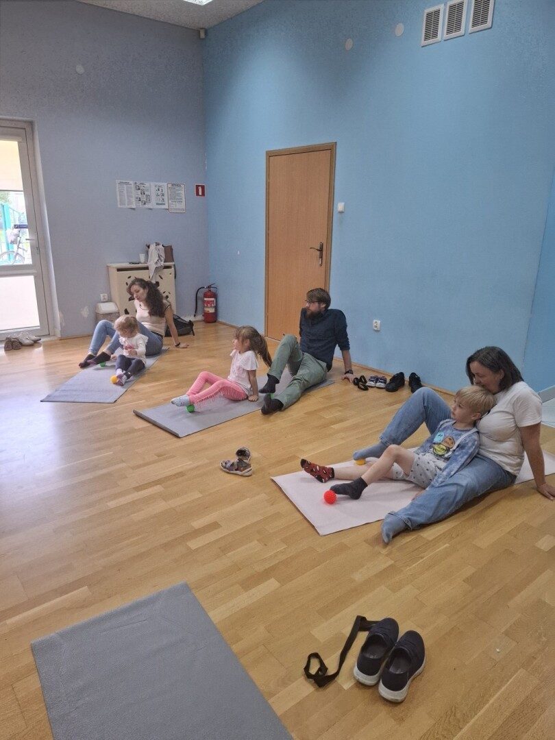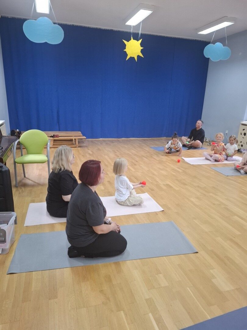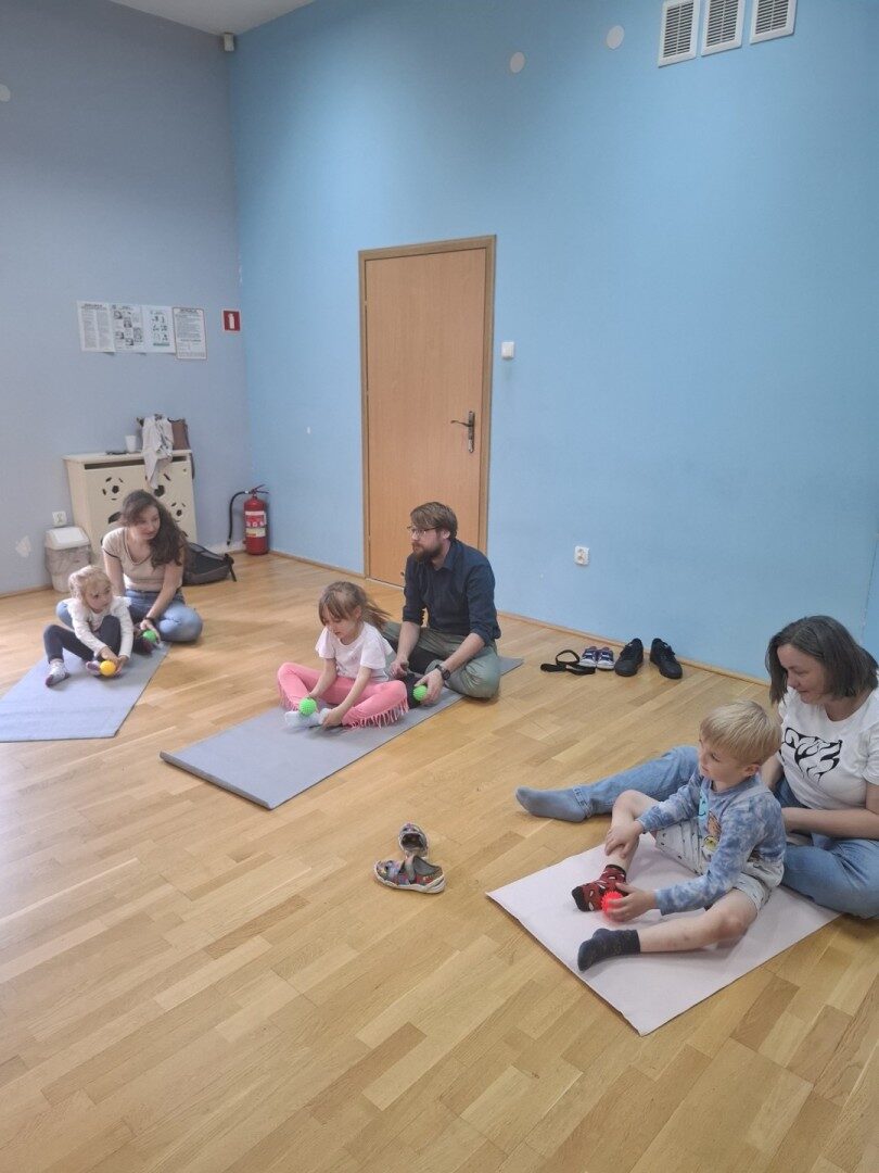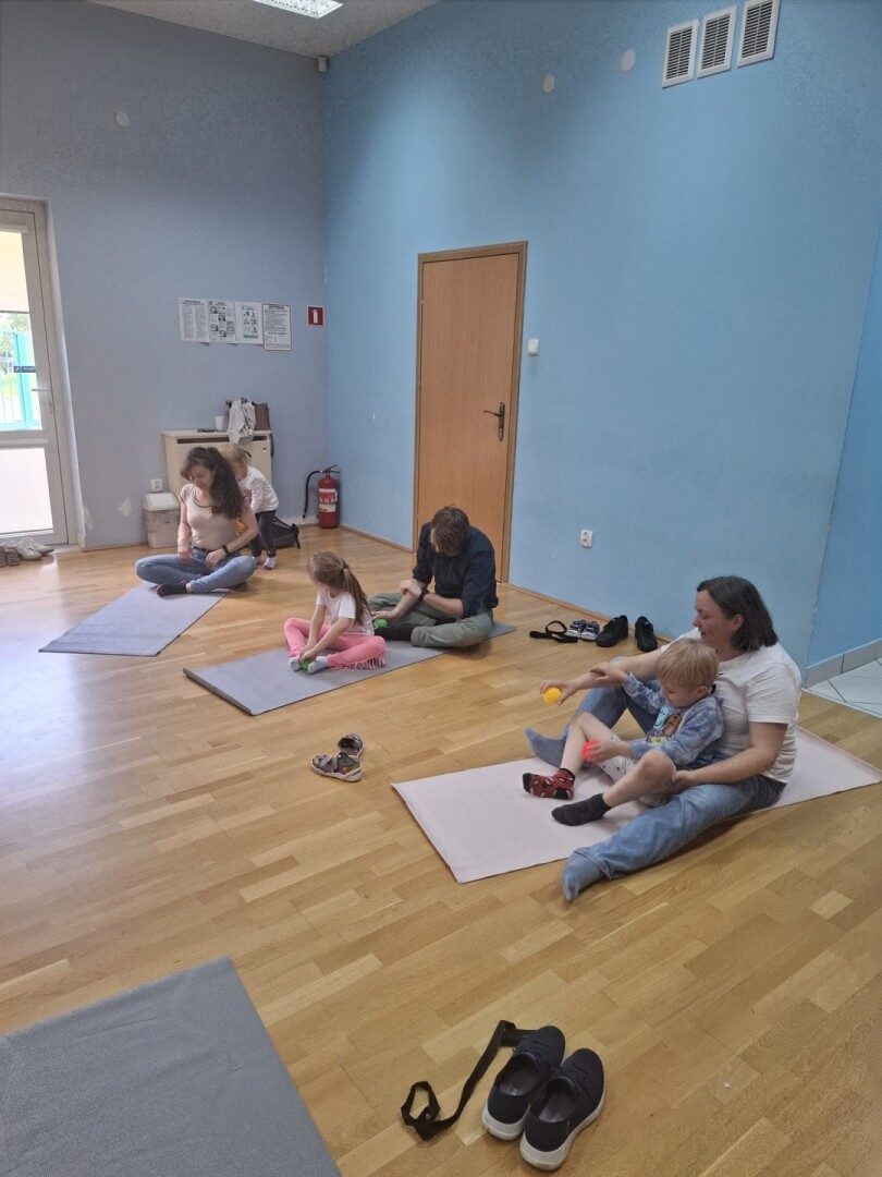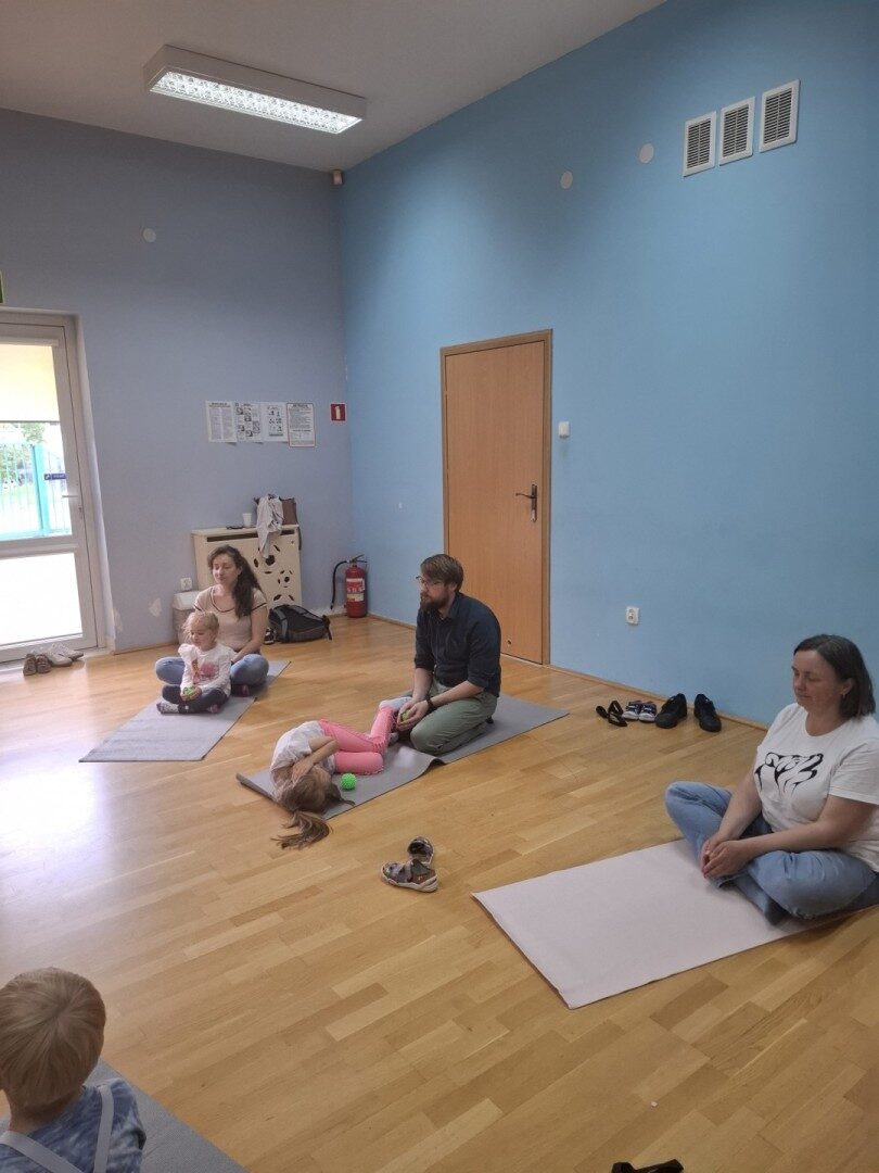 Dnia 12.06.2025r. w grupie „ŻABKI” odbyło się spotkanie integracyjne rodziców i dzieci. Podczas warsztatów przedszkolaki z rodzicami  miały możliwość spędzenia wspólnie czasu doskonale bawiąc się podczas zabaw muzyczno- ruchowych. Spotkanie rozpoczęliśmy od zaśpiewania piosenki pt „Hej witam Was” , która towarzyszy nam zawsze przed rozpoczęciem zajęć. Następnie wykonaliśmy rozgrzewkę wykorzystując znane dzieciom zabawy muzyczno-ruchowe takie jak „Body Perfection” czy „A ram zam zam”. Następnie bawiliśmy się z wykorzystaniem  Sigumy, woreczków gimnastycznych oraz obręczy. Kolejną aktywnością była joga prowadzona w ramach innowacji pedagogicznej. Dzieci wspólnie z rodzicami wykonały rozgrzewkę, następnie pokazały dzieciom ich ulubione asany  takie jak: drzewo, kobra, lew, krzesło, żaba bocian, kwiat lotosu, pies z głową w górze, pies z głową w dół, kwiat lotosu itp. Na zakończenie rodzice wykonali masaż dzieciom wykorzystując w tym celu piłki sensoryczne po czym nastąpiła zamiana i to dzieci robiły masaż swoim rodzicom. Podczas warsztatów zarówno rodzice jak i dzieci wykazali się twórczą kreatywnością. Na koniec wykonaliśmy ćwiczenia relaksacyjne. Tego typu spotkanie dało możliwość twórczego spędzenia czasu z dziećmi. Spotkanie przebiegało w miłej i serdecznej atmosferze.