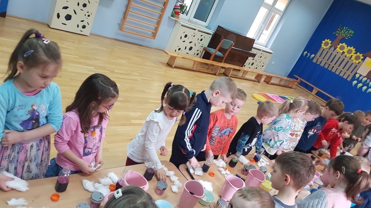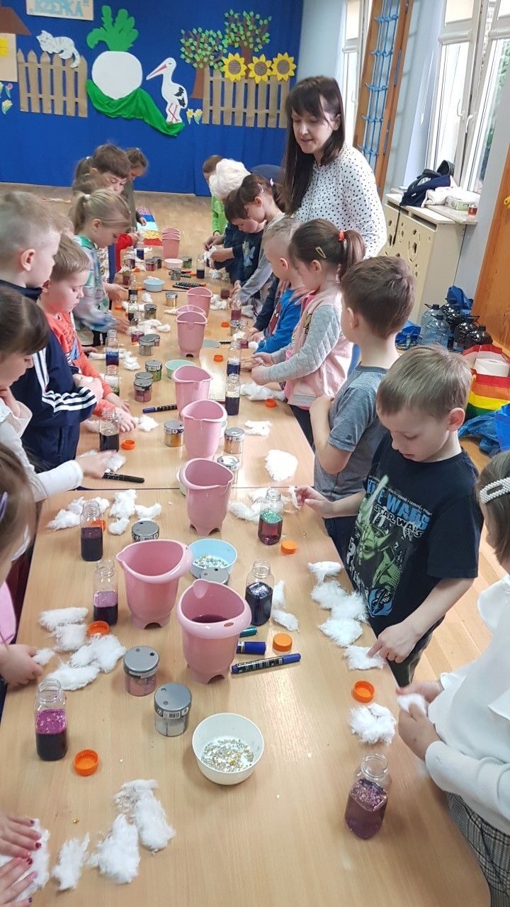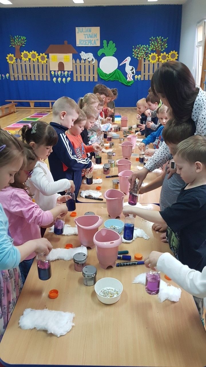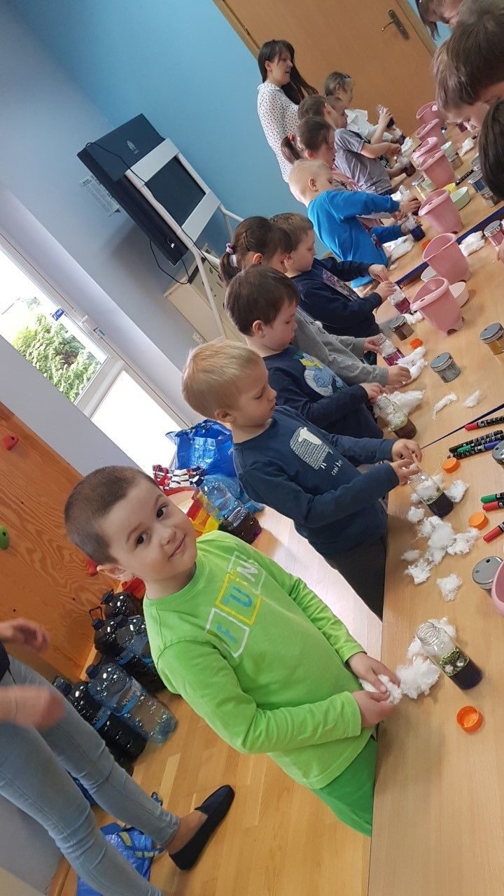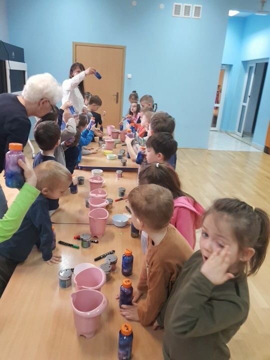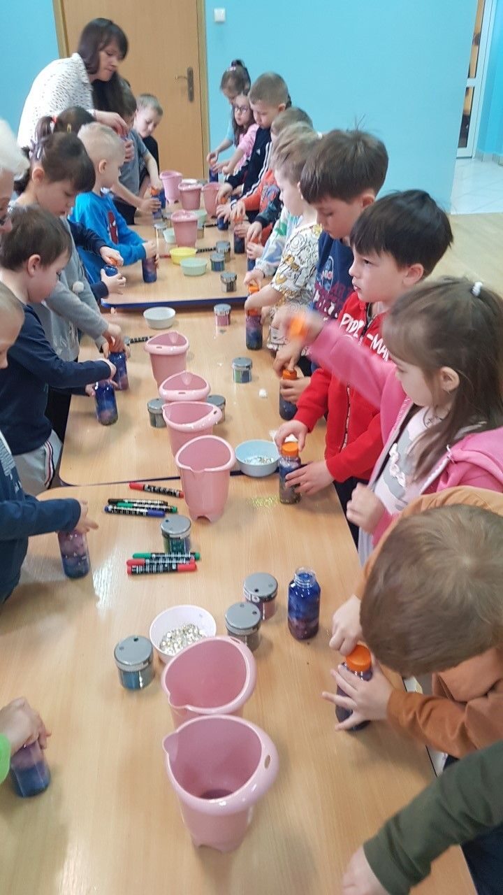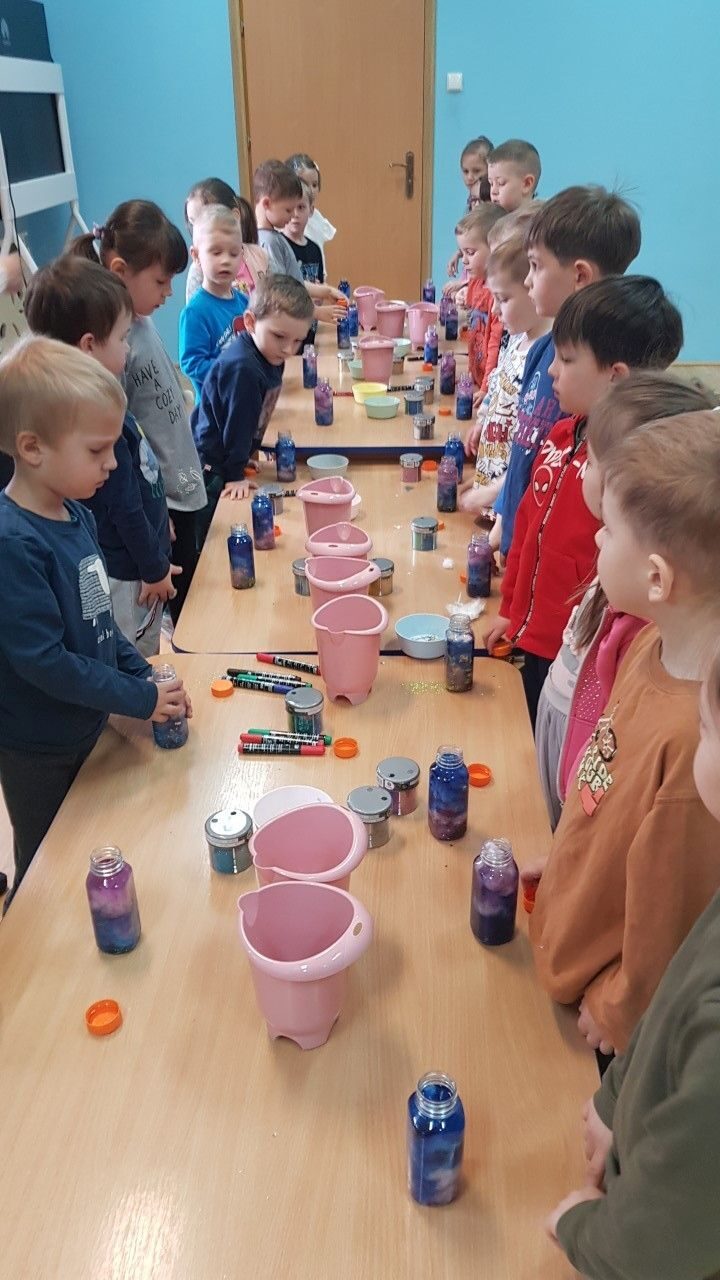 Dnia 12.04.2023 r w naszym przedszkolu odbyły się warsztaty sensoryczne w czasie,których przedszkolaki wybrały się w kosmos. Podczas proponowanych aktywności dzieci miały możliwość przejścia stopami po kosmicznej ścieżce sensorycznej, przy okazji utrwalając sobie nazwy planet układu słonecznego, by następnie wykonać swój własny kosmos w butelce wykorzystując w tym celu: watę, cekinowe gwiazdki, brokat oraz wodę w kolorze niebieskim i fioletowym. Zabawy sensoryczne dostarczyły dzieciom różnorodnych bodźców do rozwoju zmysłów a także poszerzyły ich świat doznań.