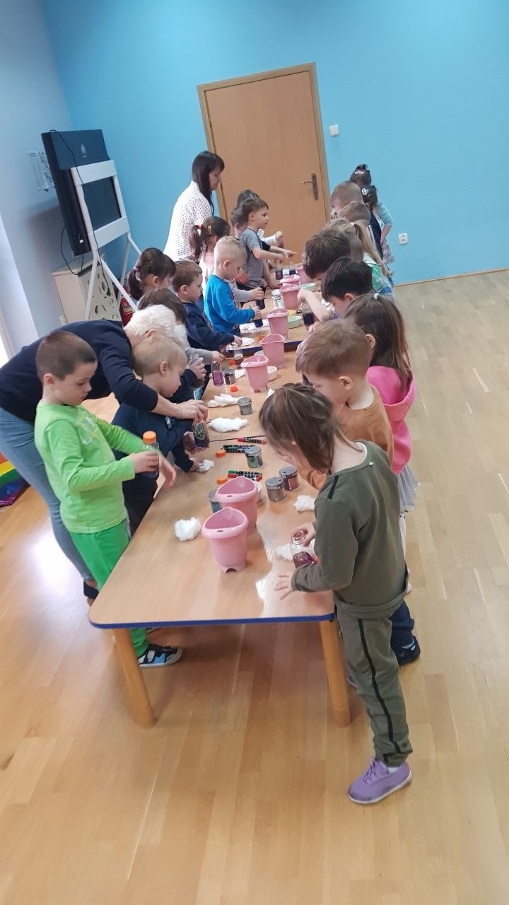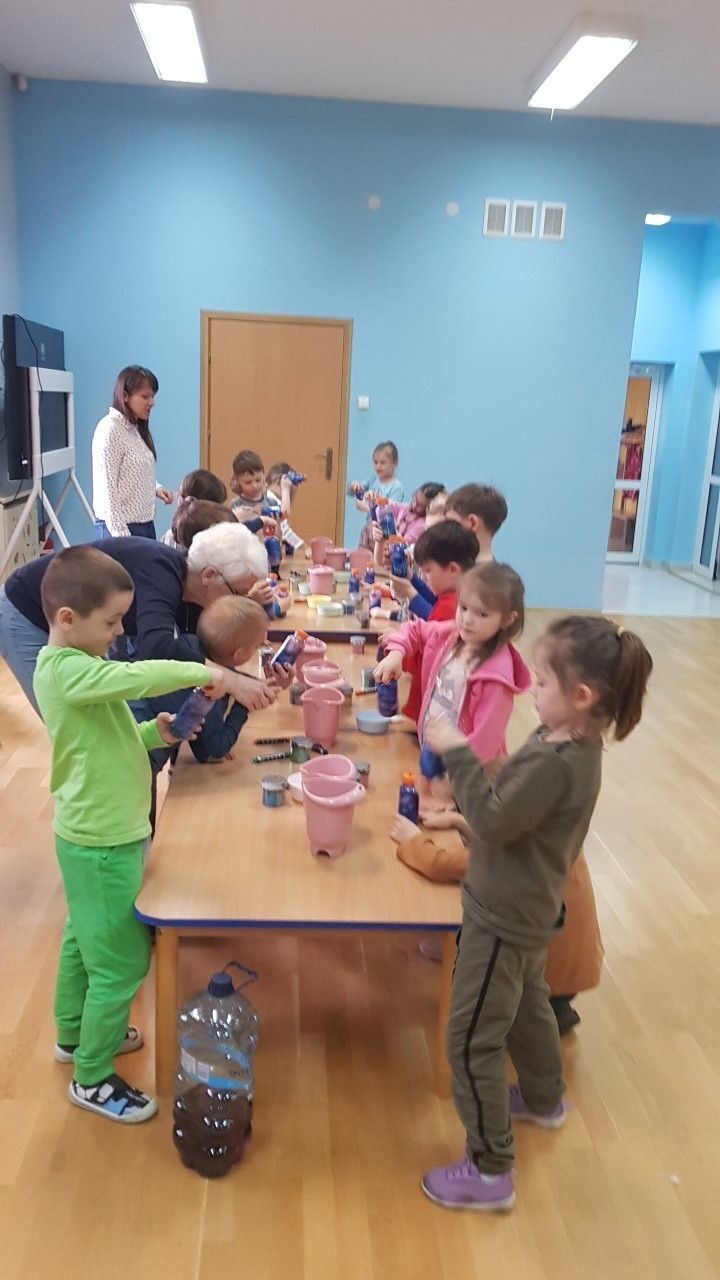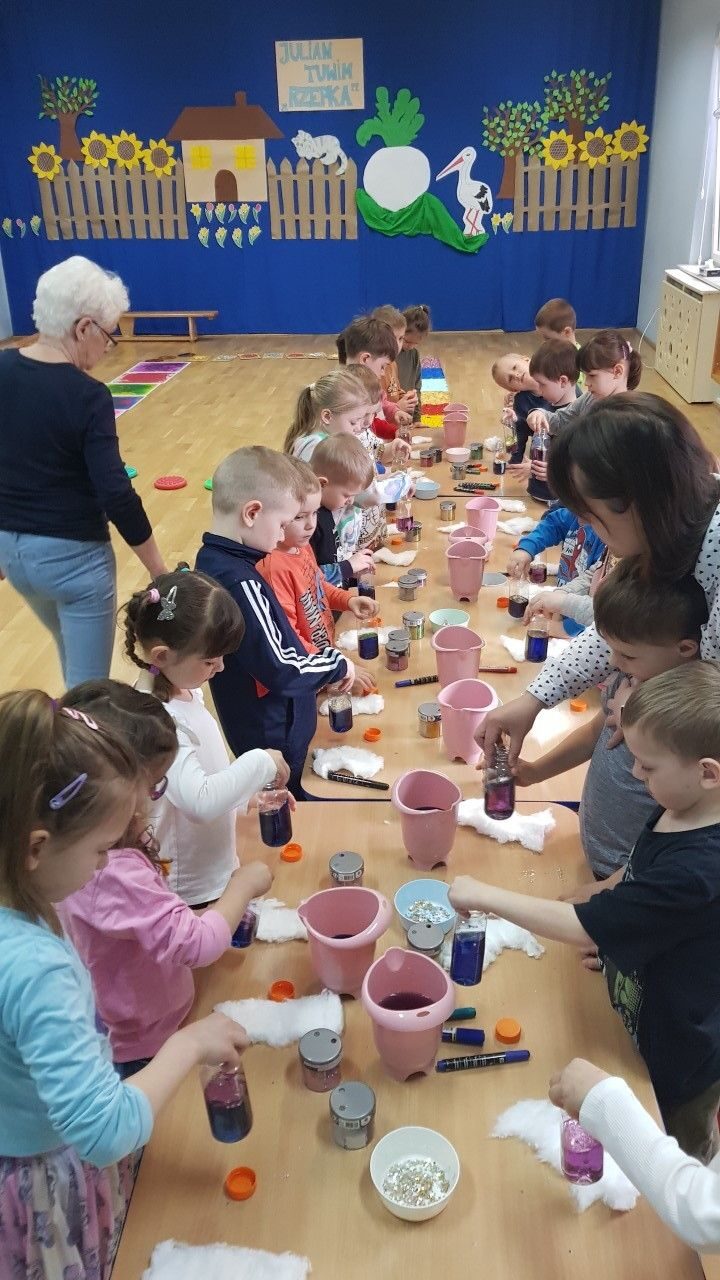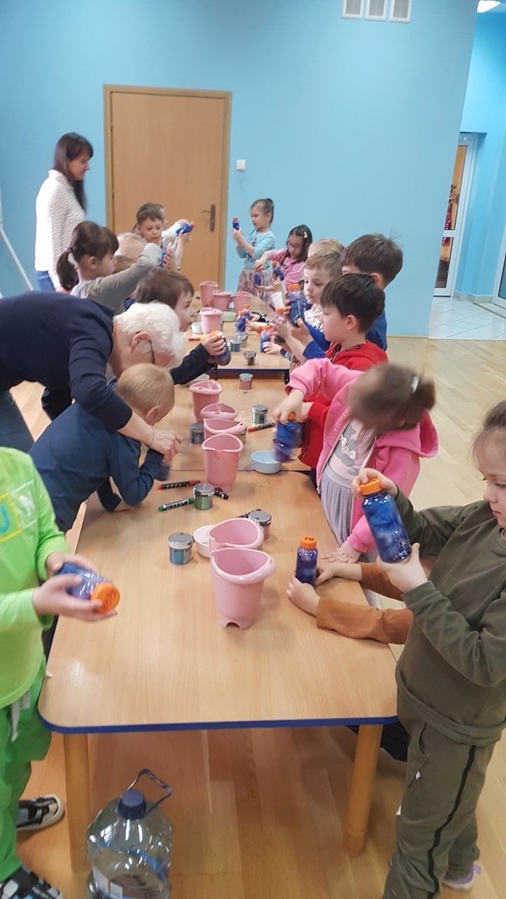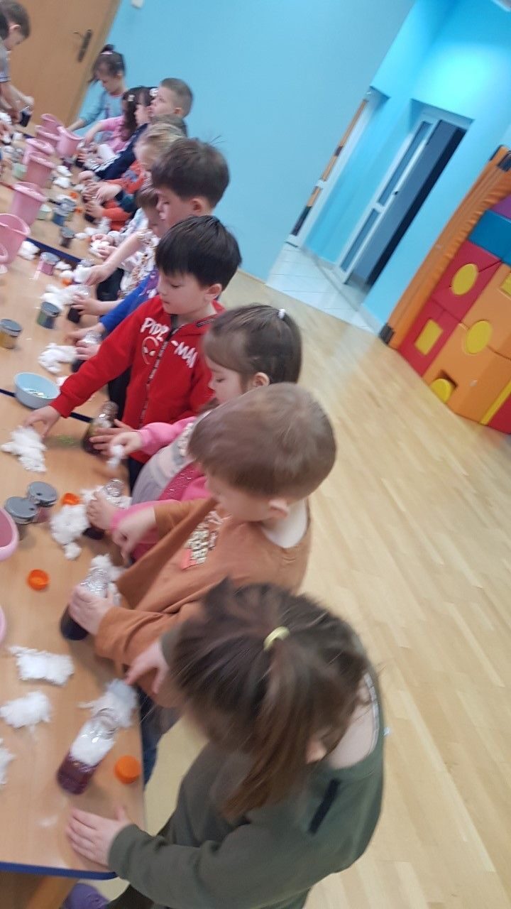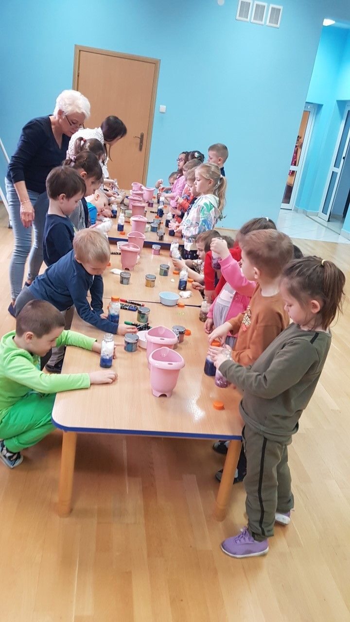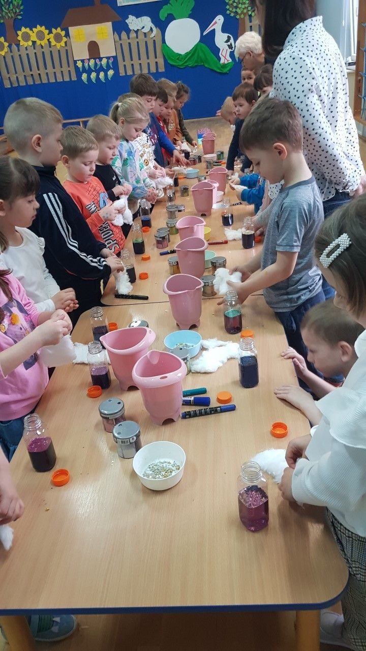Dnia 12.04.2023 r w naszym przedszkolu odbyły się warsztaty sensoryczne w czasie,których przedszkolaki wybrały się w kosmos. Podczas proponowanych aktywności dzieci miały możliwość przejścia stopami po kosmicznej ścieżce sensorycznej, przy okazji utrwalając sobie nazwy planet układu słonecznego, by następnie wykonać swój własny kosmos w butelce wykorzystując w tym celu: watę, cekinowe gwiazdki, brokat oraz wodę w kolorze niebieskim i fioletowym. Zabawy sensoryczne dostarczyły dzieciom różnorodnych bodźców do rozwoju zmysłów a także poszerzyły ich świat doznań.