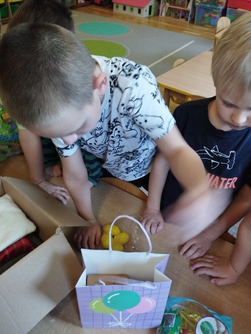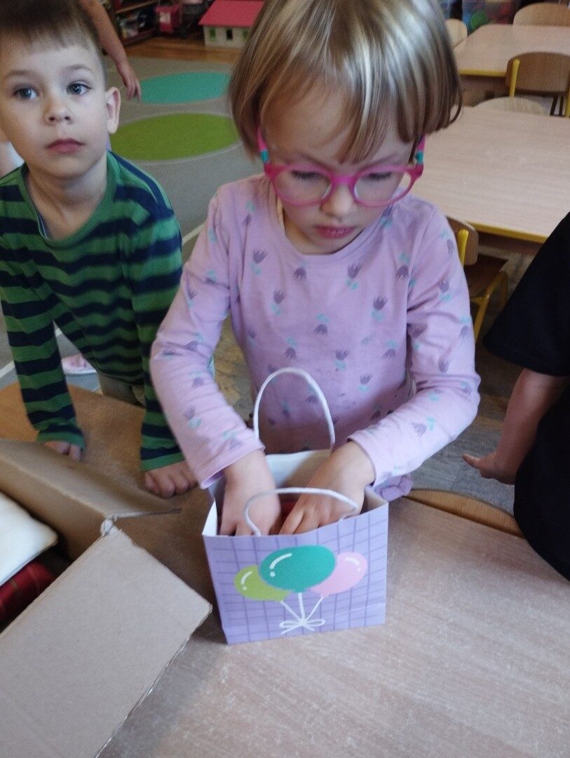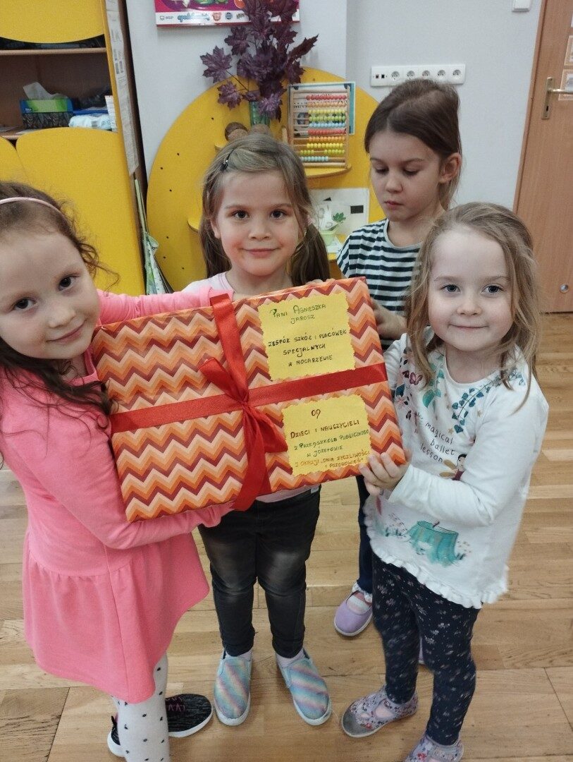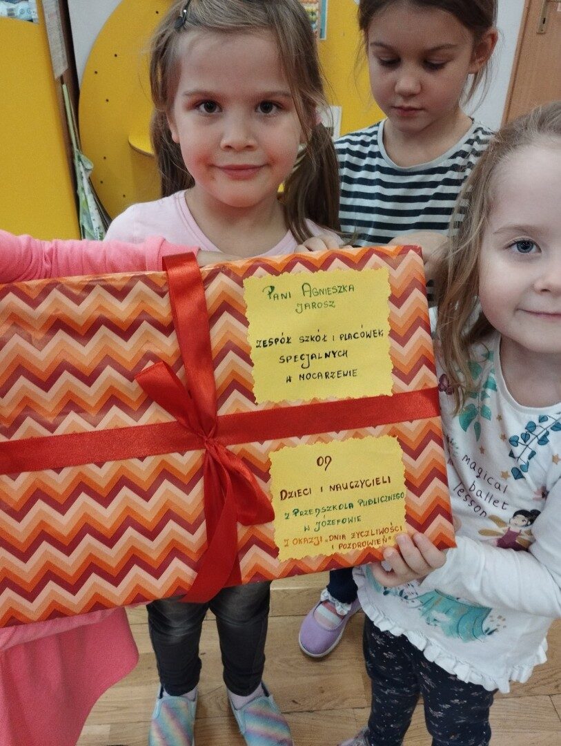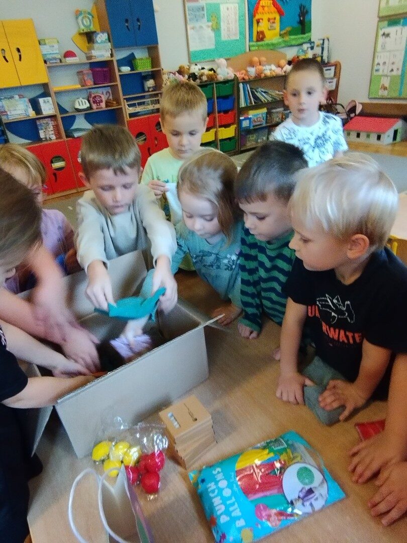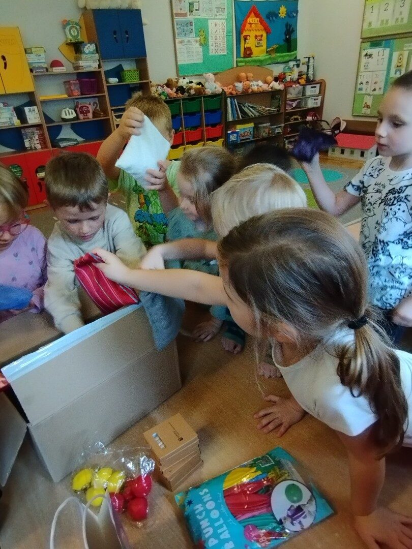 W listopadzie z okazji zbliżającego się Światowego Dnia Życzliwości i Pozdrowień przedszkolaki z grupy „Żabki” podczas zajęć sensorycznych wykonały woreczki dla nowych przyjaciół z Mocarzewa. Dużo radości sprawiło dzieciom wypełnienie woreczków różnorodnymi materiałami np.: kaszą gryczaną, ryżem, makaronem, żołędziami, grochem, fasolą. Podczas przygotowywania paczki, dzieci dołożyły balony, breloki z owocami, kredki z symbolem Gminy Ożarowa Mazowieckiego. Ponadto dołączono laurkę z życzeniami z okazji obchodzonego święta. Paczkę przekazano na ręce Pani Agnieszki – wychowawczyni z Ośrodka w Mocarzewie.