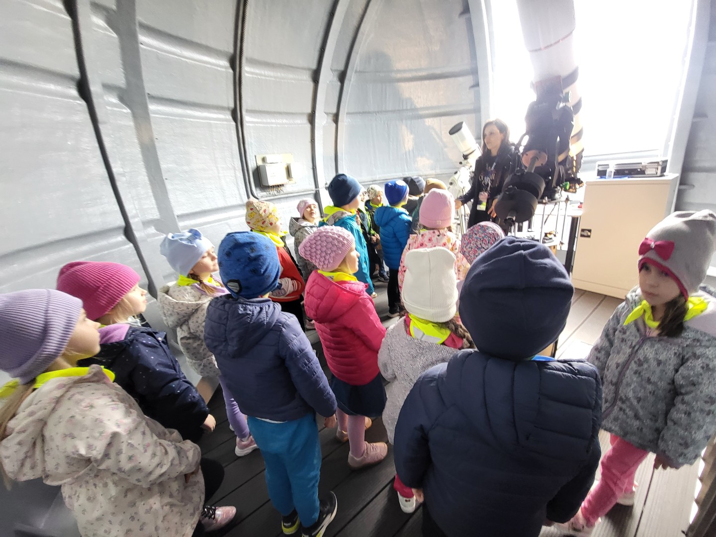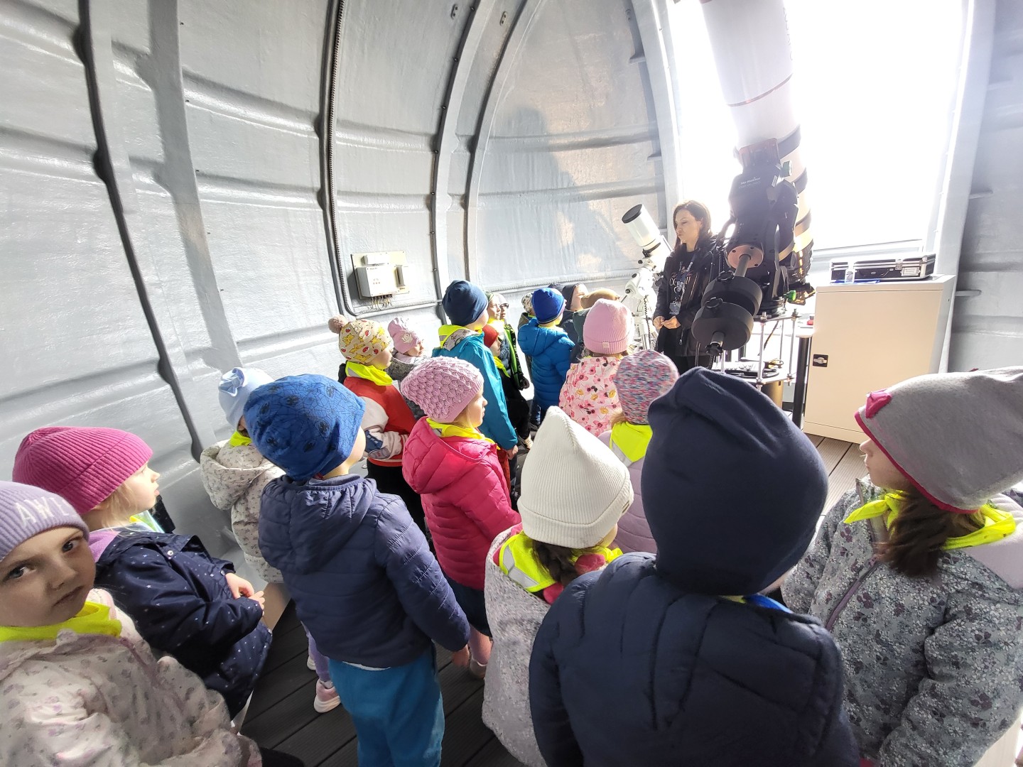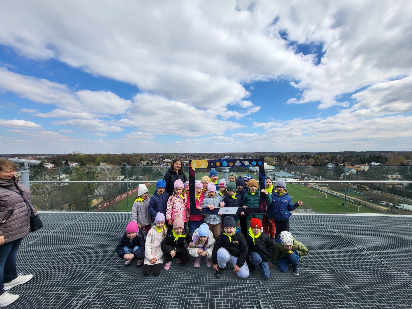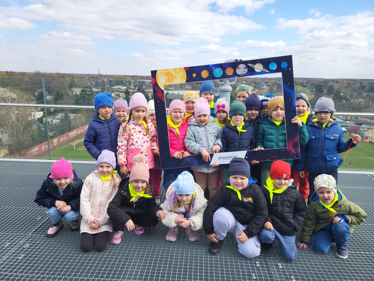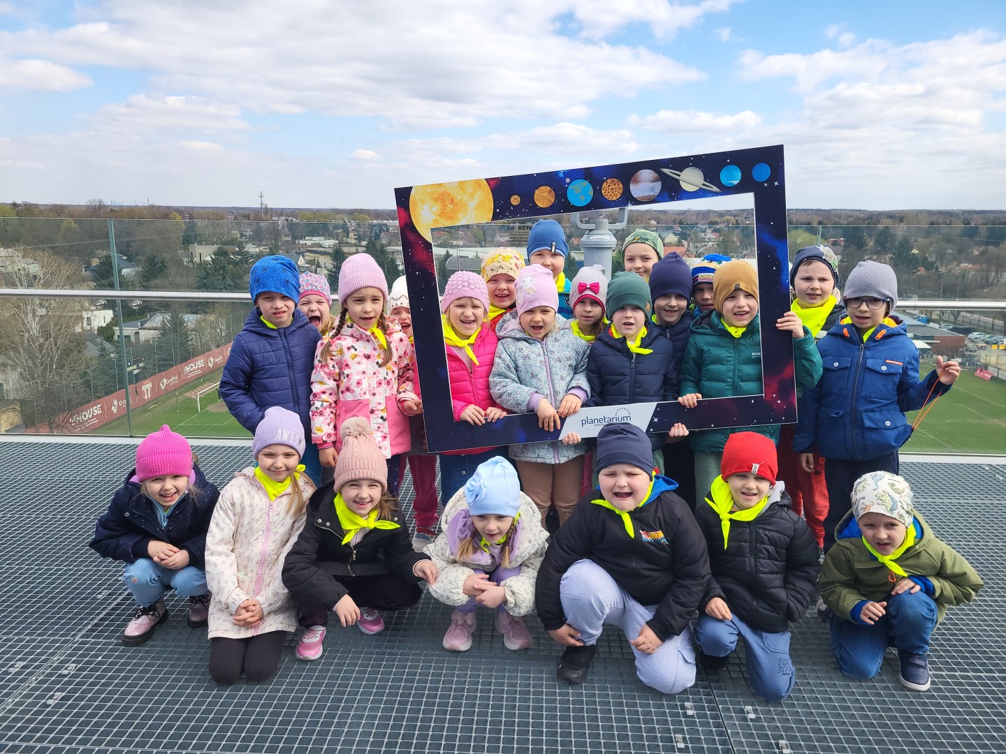 Dnia 10 kwietnia dzieci z grupy „ Żabki” i „ Zajączki”, wyruszyły autokarem na wycieczkę pełną niespodzianek i atrakcji, jakie oferowało Planetarium w Grodzisku. Przedszkolaki na samym wstępie obejrzały film w kinie sferycznym 3D zatytułowanym „ Stalarsi – misja ratowania lasu”. Efekty filmu wywołały w dzieciach mnóstwo radości, zaskoczenia, euforii. Kolejnym działaniem, które było niesamowitym przeżyciem i pełnym niespodzianek, to symulator podróży kosmicznej 5D. ponadto, kolejna atrakcją były warsztaty plastyczne w sali Mikołaja Kopernika. Przedszkolaki wykonały rakietę kosmiczną. Dużą niespodzianką było również oglądanie kopuły, z której za pomocą teleskopu można oglądać słonce- nam się nieudało tego dokonać, gdyż pogoda była pochmurna. Za to obejrzeliśmy panoramę Grodziska Mazowieckiego z tarasu widokowego, który znajduje się na 28 piętrze. Bardzo nam się podobała wycieczka, wróciliśmy przeszczęśliwi, pełni wrażeń i emocji.