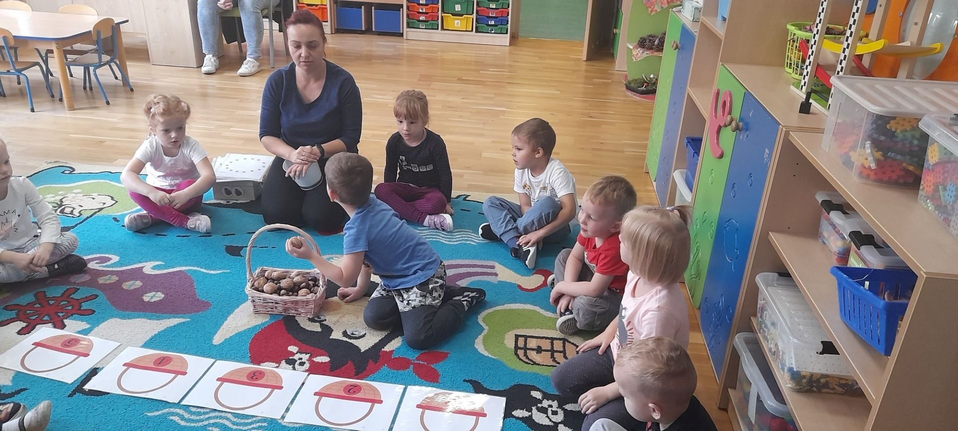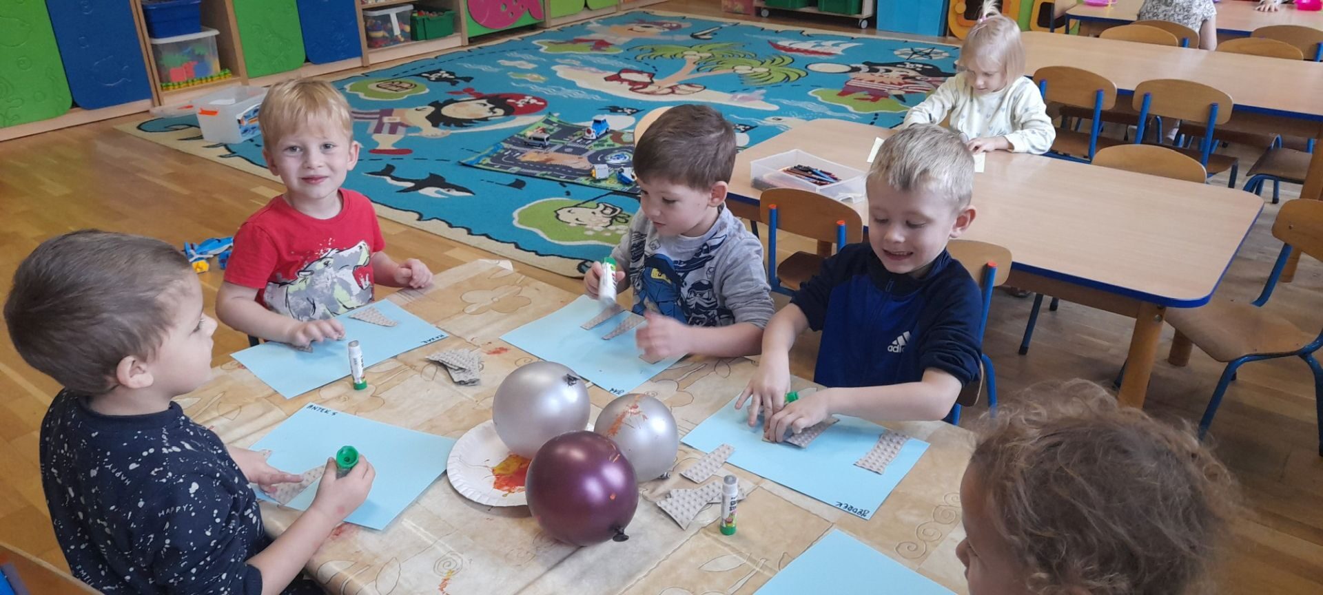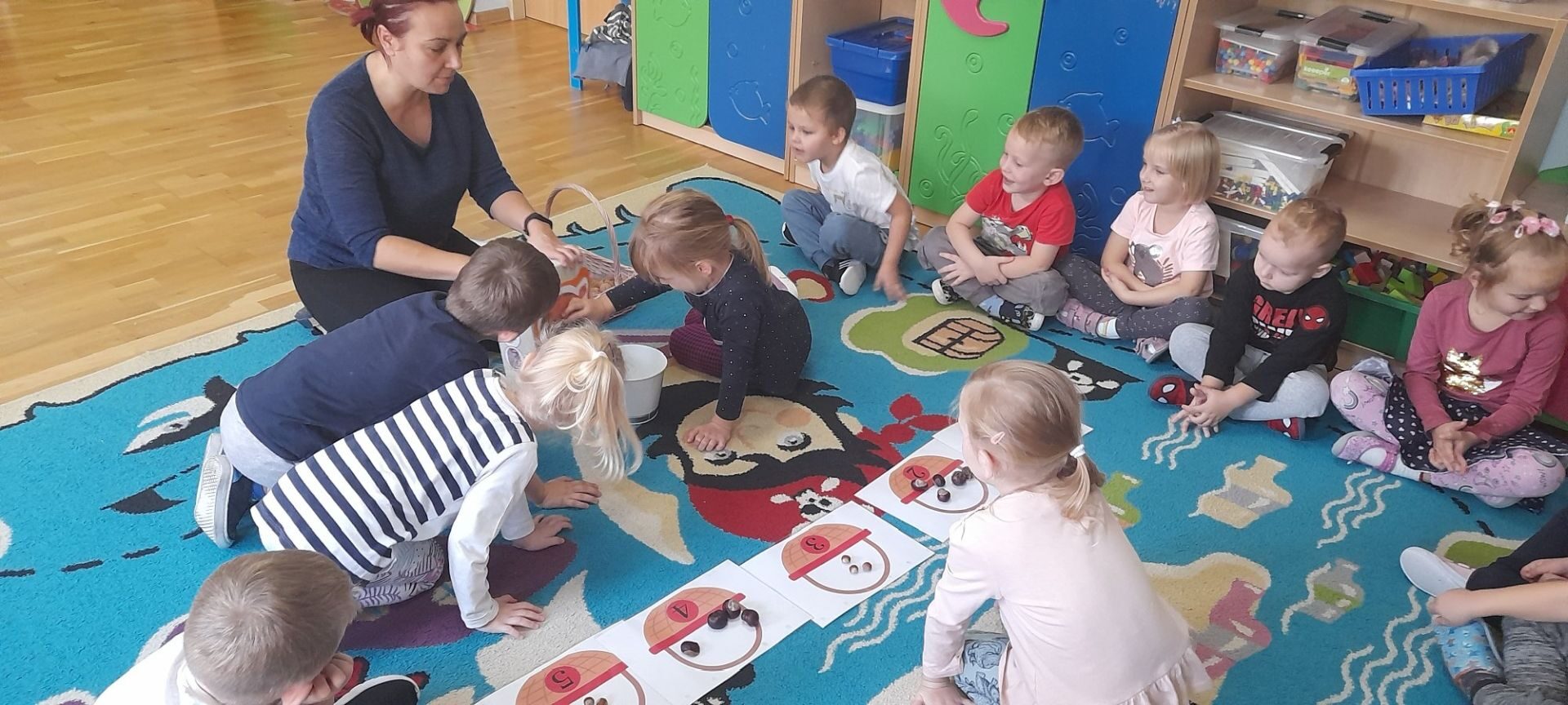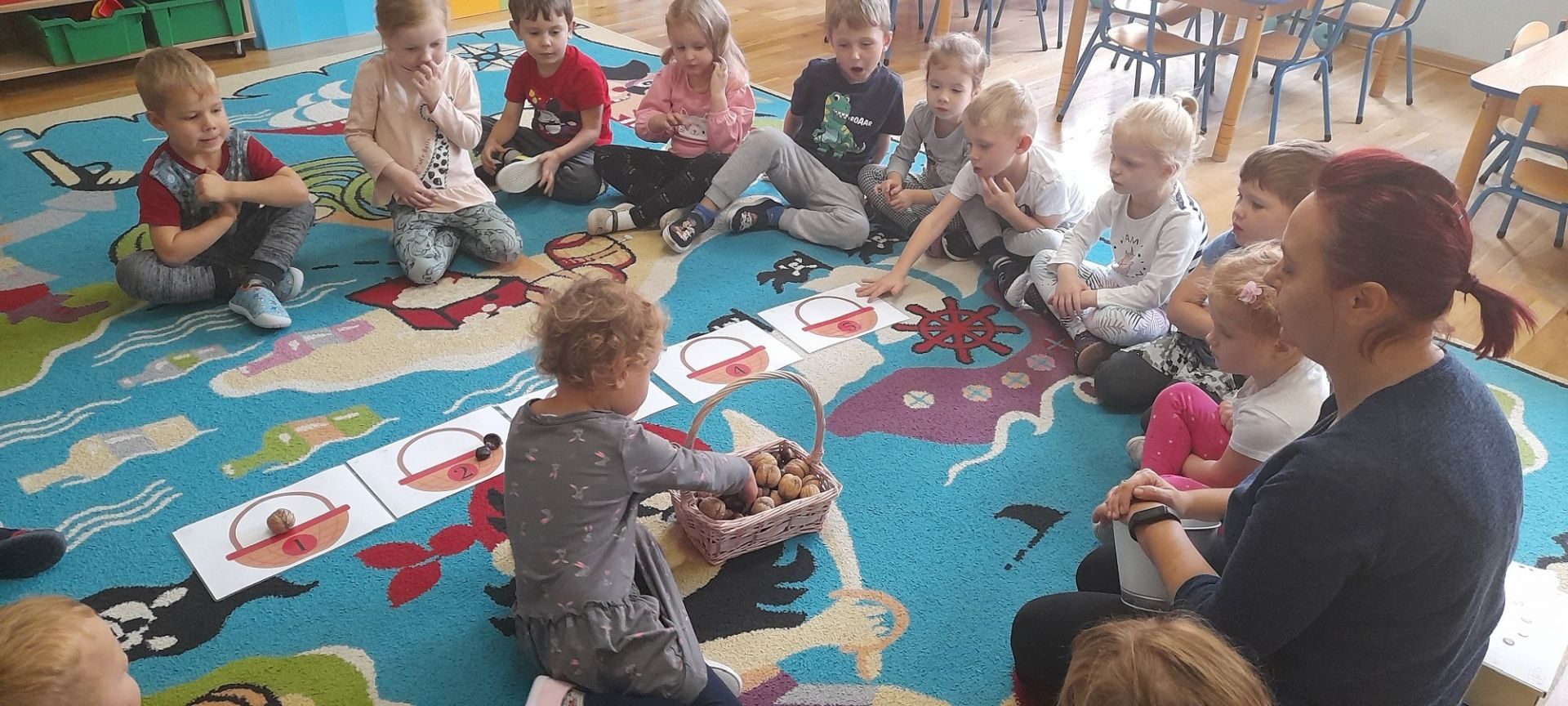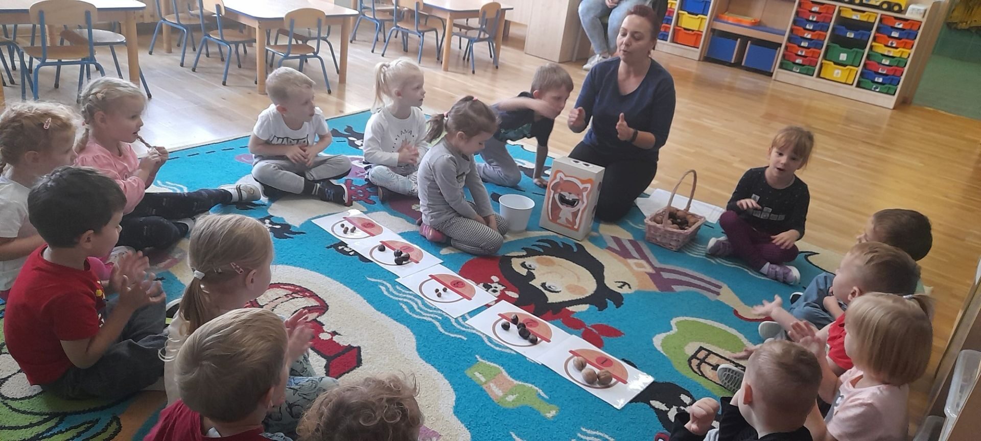 Jesień to jedna z najbardziej różnorodnych pór roku, obfitująca w materiał przyrodniczy, który posłużył dzieciom z grupy Rybki do liczenia. Przedszkolaki wkładały odpowiednią ilość kasztanów lub orzechów do koszyka z odpowiednią cyfrą. Następnie dzieci układały figury geometryczne wykorzystując zebrane dary jesieni. Kolejna zabawa polegała na policzeniu ile kasztanów bądź orzechów wpadło do metalowego wiaderka a następnie nakarmienie niezwykle żarłocznej wiewiórki, śmiechu było przy tym co nie miara. Na koniec wspólnie zaśpiewaliśmy piosenkę „Wiewióreczka mała po lesie biegała…”i malowaliśmy przy użyciu balonów „Jesień w lesie”.