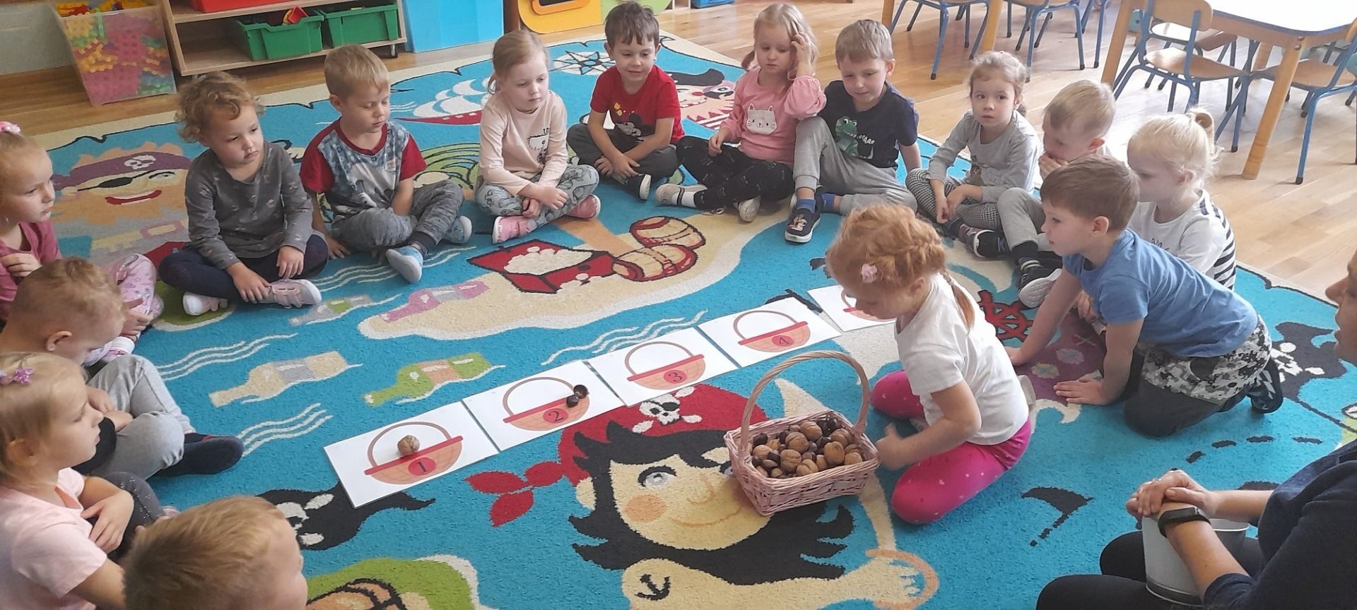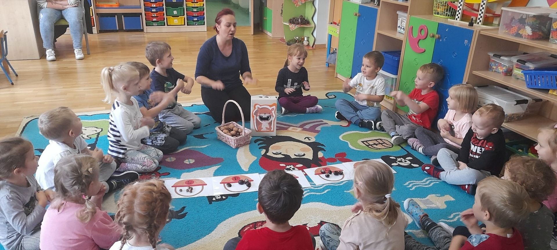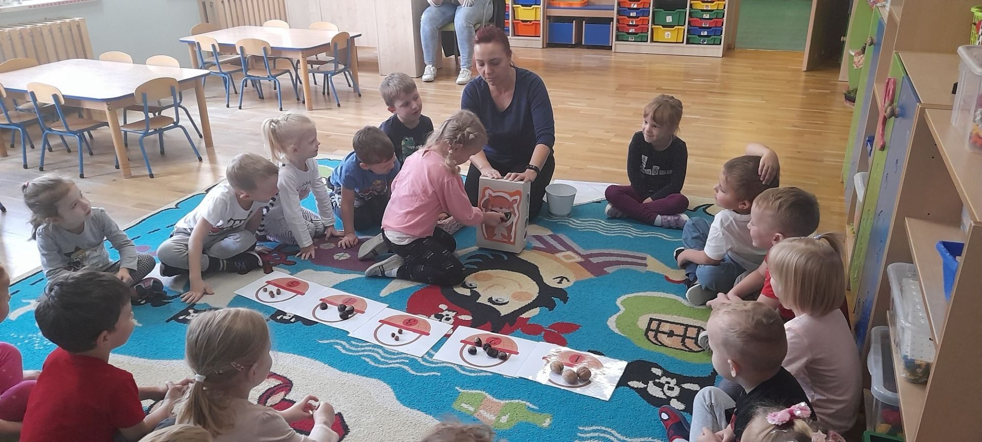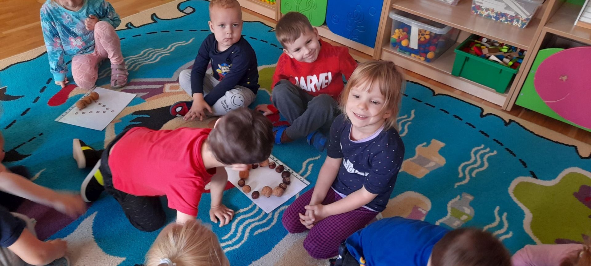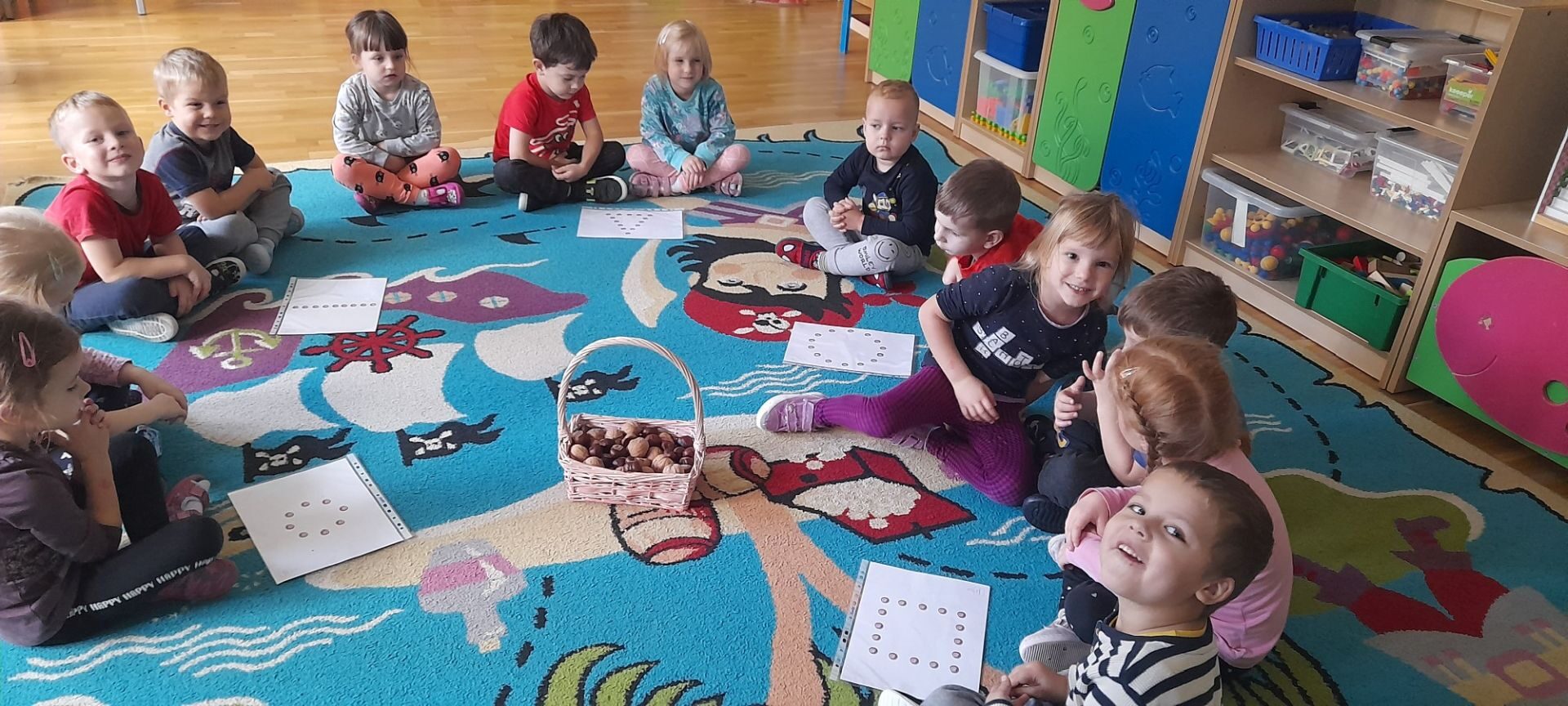 Jesień to jedna z najbardziej różnorodnych pór roku, obfitująca w materiał przyrodniczy, który posłużył dzieciom z grupy Rybki do liczenia. Przedszkolaki wkładały odpowiednią ilość kasztanów lub orzechów do koszyka z odpowiednią cyfrą. Następnie dzieci układały figury geometryczne wykorzystując zebrane dary jesieni. Kolejna zabawa polegała na policzeniu ile kasztanów bądź orzechów wpadło do metalowego wiaderka a następnie nakarmienie niezwykle żarłocznej wiewiórki, śmiechu było przy tym co nie miara. Na koniec wspólnie zaśpiewaliśmy piosenkę „Wiewióreczka mała po lesie biegała…”i malowaliśmy przy użyciu balonów „Jesień w lesie”.