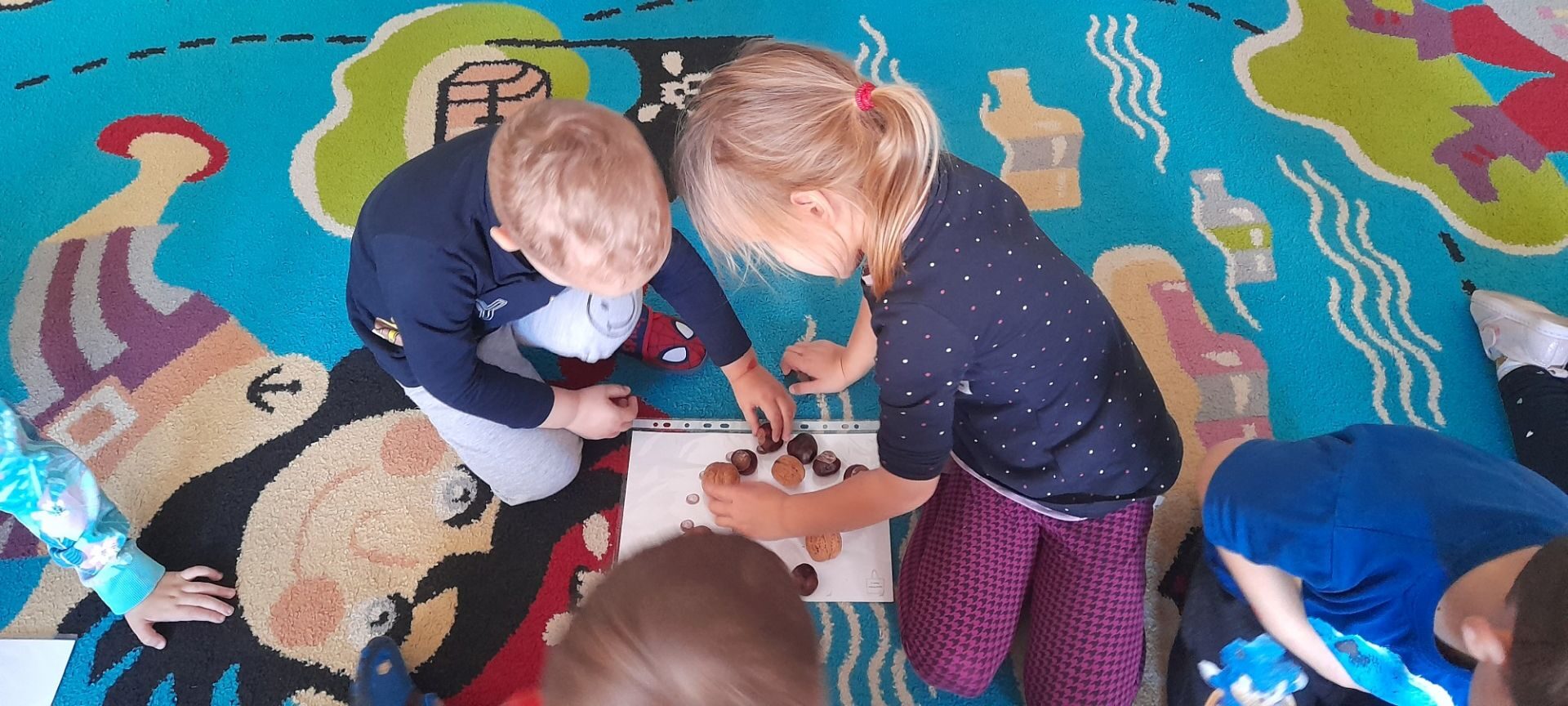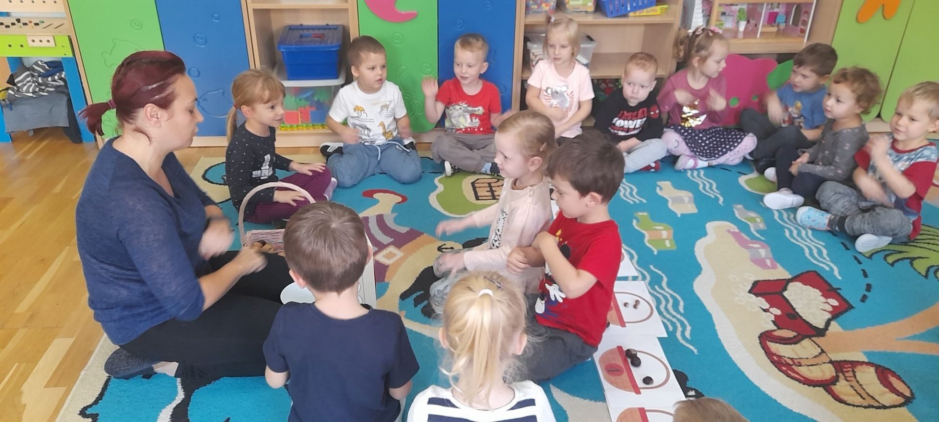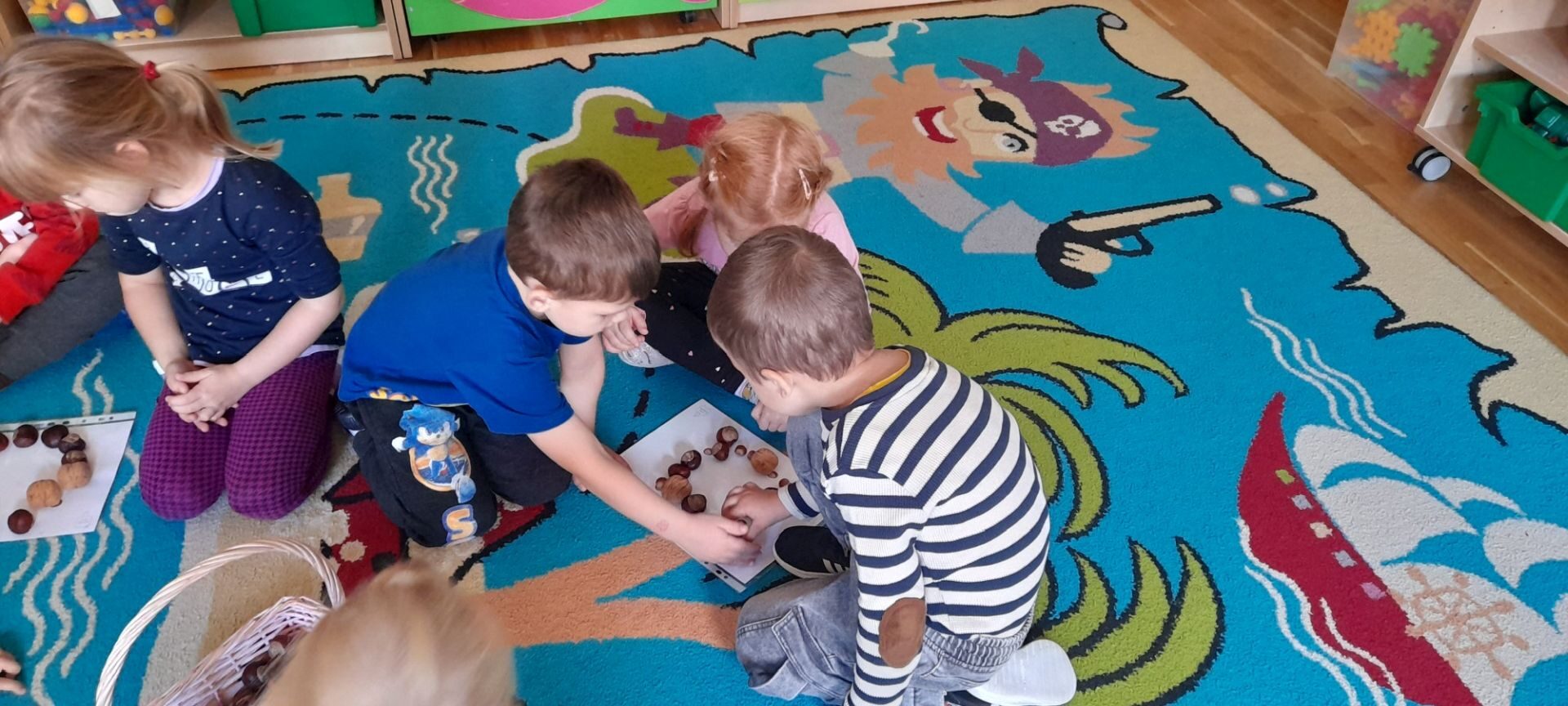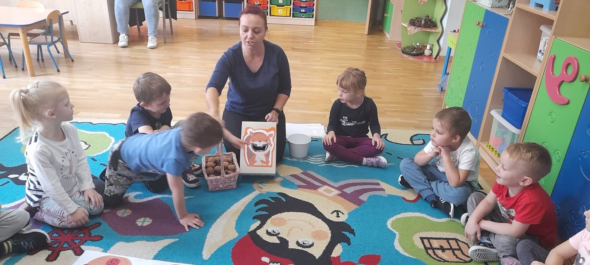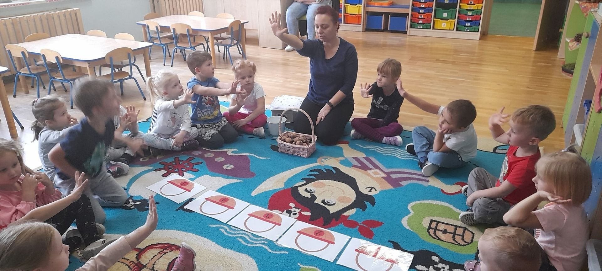 Jesień to jedna z najbardziej różnorodnych pór roku, obfitująca w materiał przyrodniczy, który posłużył dzieciom z grupy Rybki do liczenia. Przedszkolaki wkładały odpowiednią ilość kasztanów lub orzechów do koszyka z odpowiednią cyfrą. Następnie dzieci układały figury geometryczne wykorzystując zebrane dary jesieni. Kolejna zabawa polegała na policzeniu ile kasztanów bądź orzechów wpadło do metalowego wiaderka a następnie nakarmienie niezwykle żarłocznej wiewiórki, śmiechu było przy tym co nie miara. Na koniec wspólnie zaśpiewaliśmy piosenkę „Wiewióreczka mała po lesie biegała…”i malowaliśmy przy użyciu balonów „Jesień w lesie”.