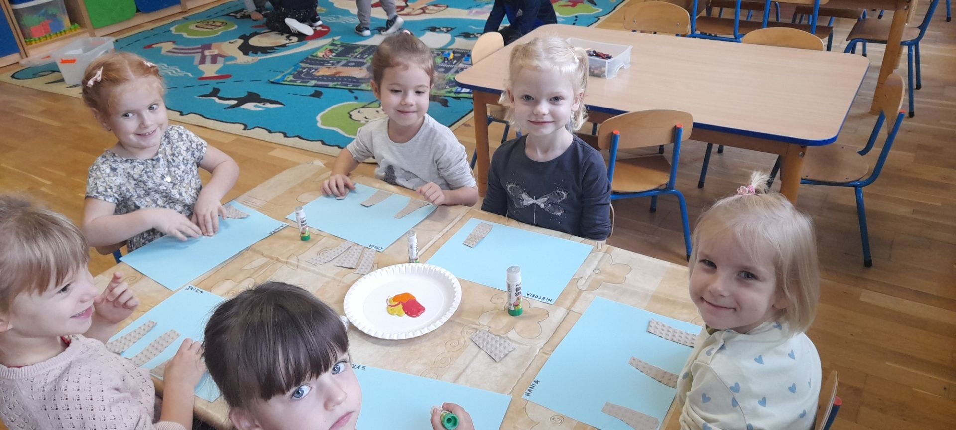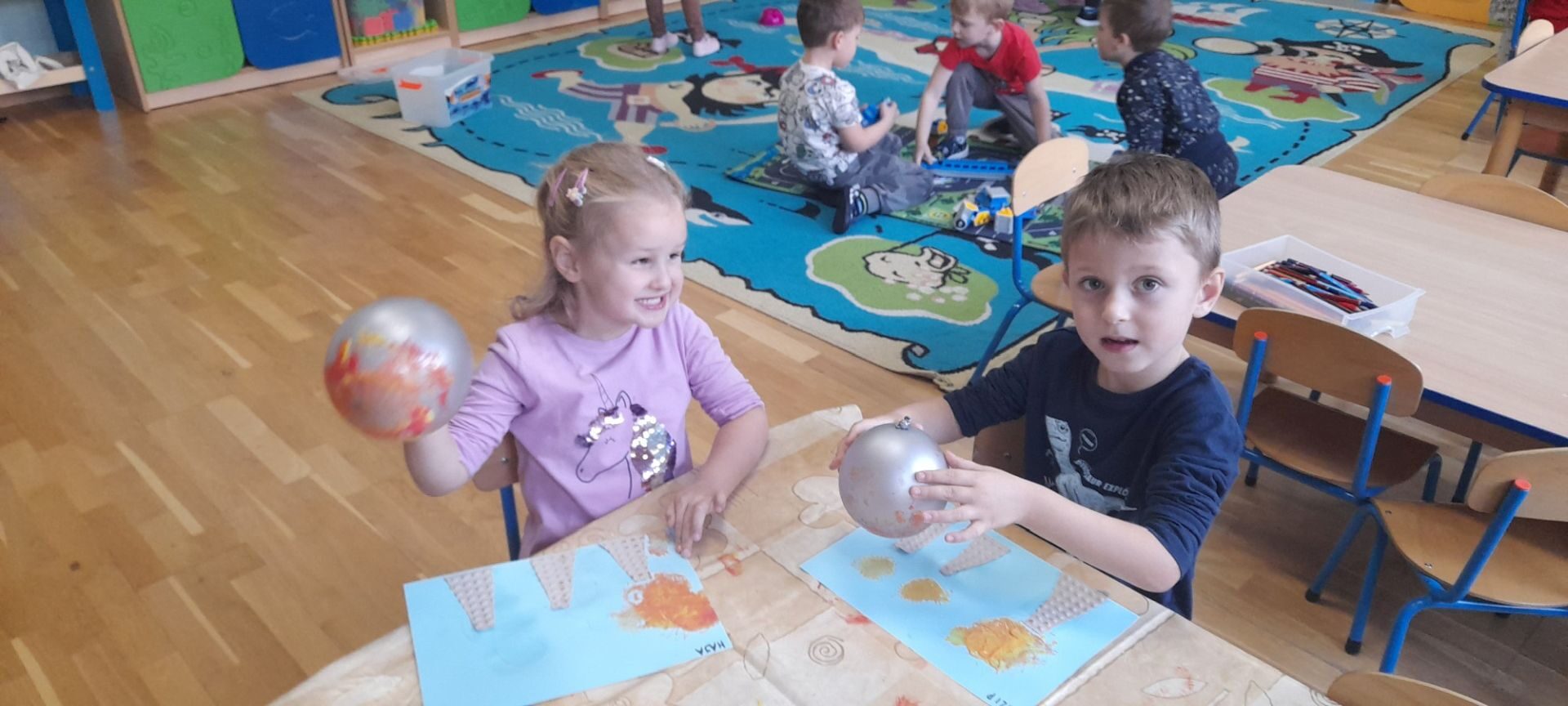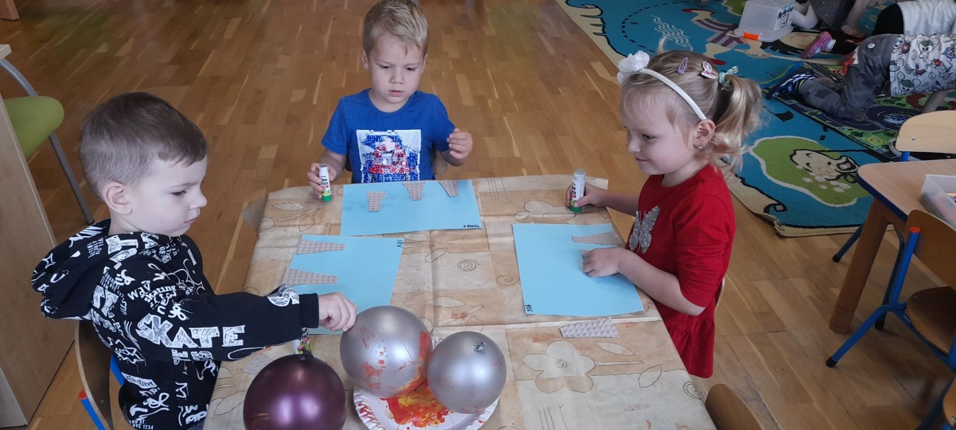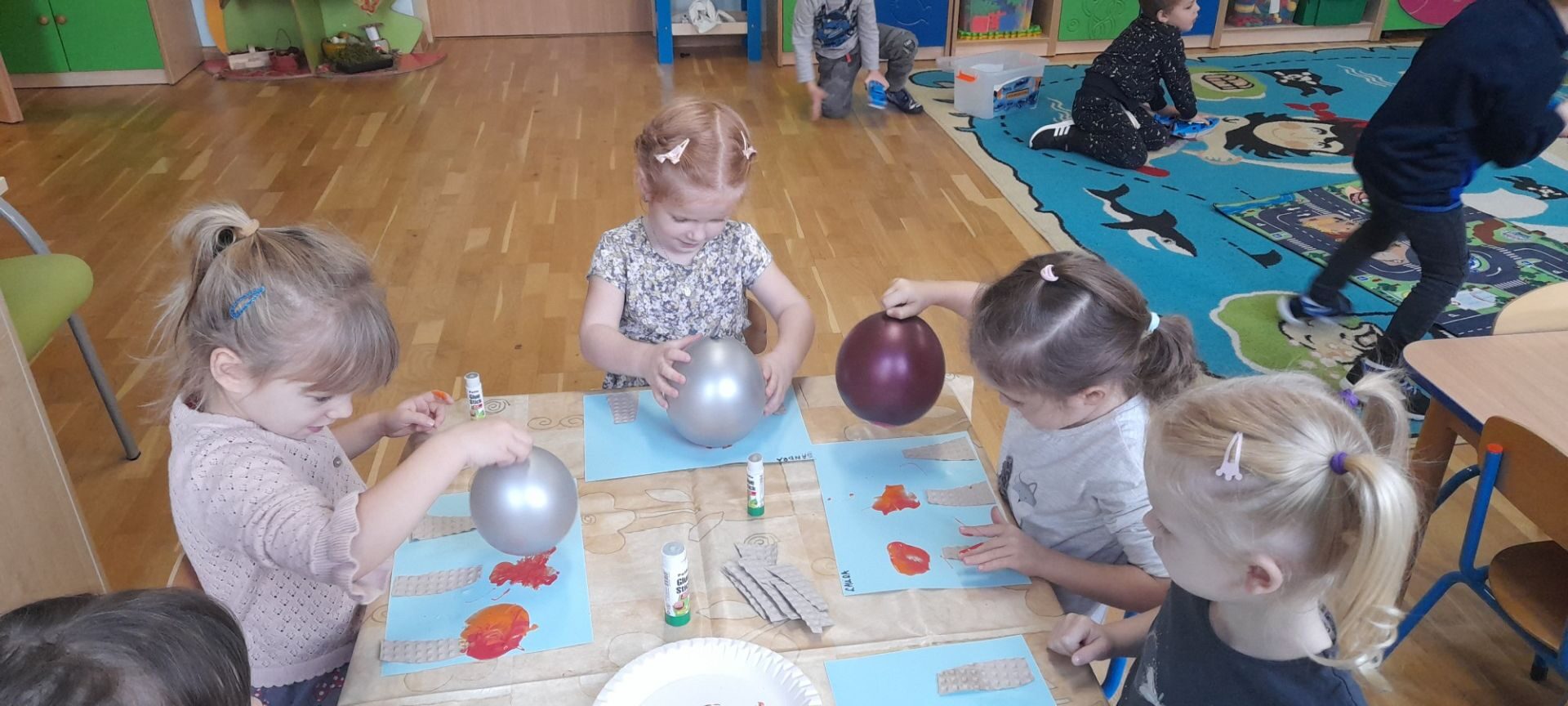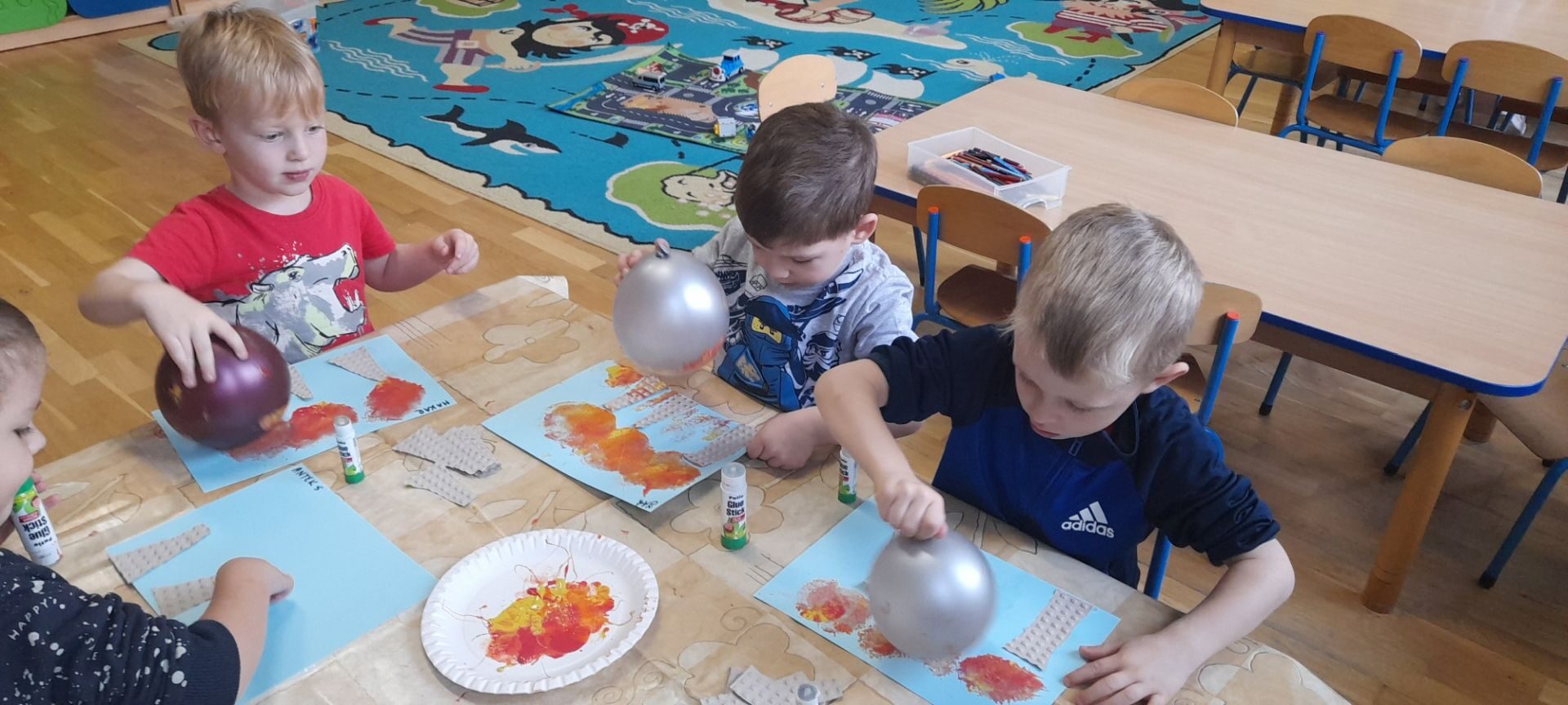 Jesień to jedna z najbardziej różnorodnych pór roku, obfitująca w materiał przyrodniczy, który posłużył dzieciom z grupy Rybki do liczenia. Przedszkolaki wkładały odpowiednią ilość kasztanów lub orzechów do koszyka z odpowiednią cyfrą. Następnie dzieci układały figury geometryczne wykorzystując zebrane dary jesieni. Kolejna zabawa polegała na policzeniu ile kasztanów bądź orzechów wpadło do metalowego wiaderka a następnie nakarmienie niezwykle żarłocznej wiewiórki, śmiechu było przy tym co nie miara. Na koniec wspólnie zaśpiewaliśmy piosenkę „Wiewióreczka mała po lesie biegała…”i malowaliśmy przy użyciu balonów „Jesień w lesie”.