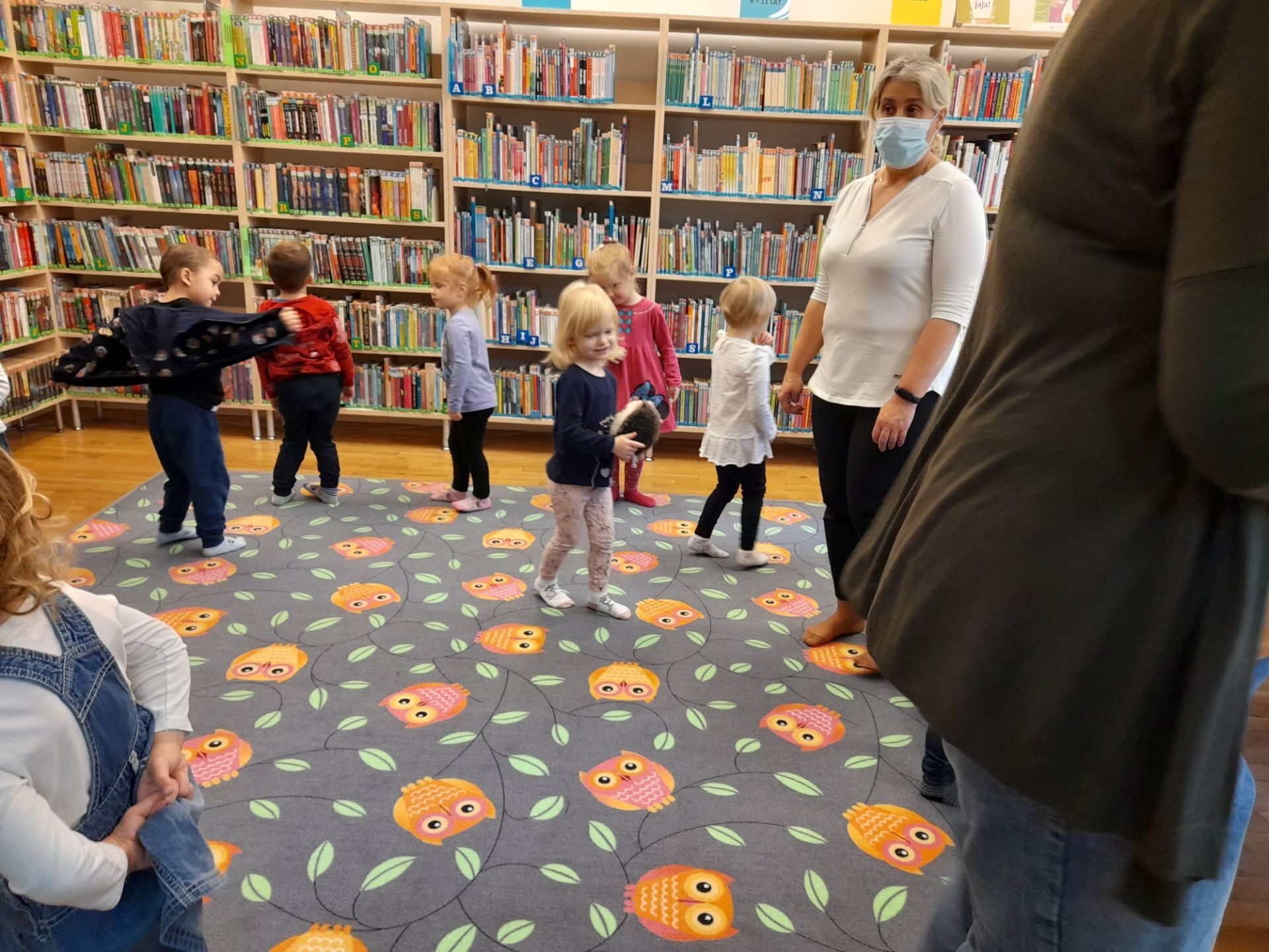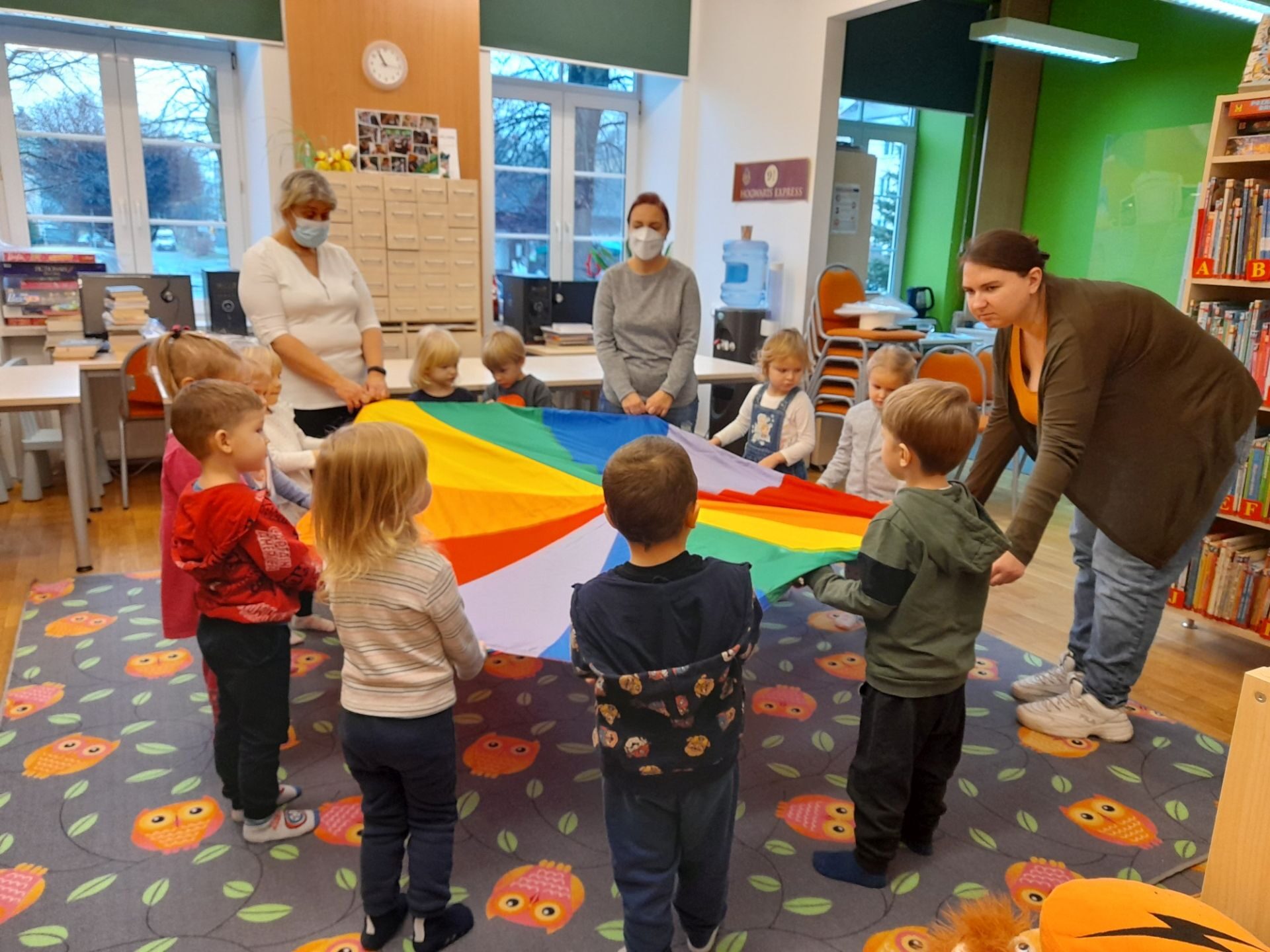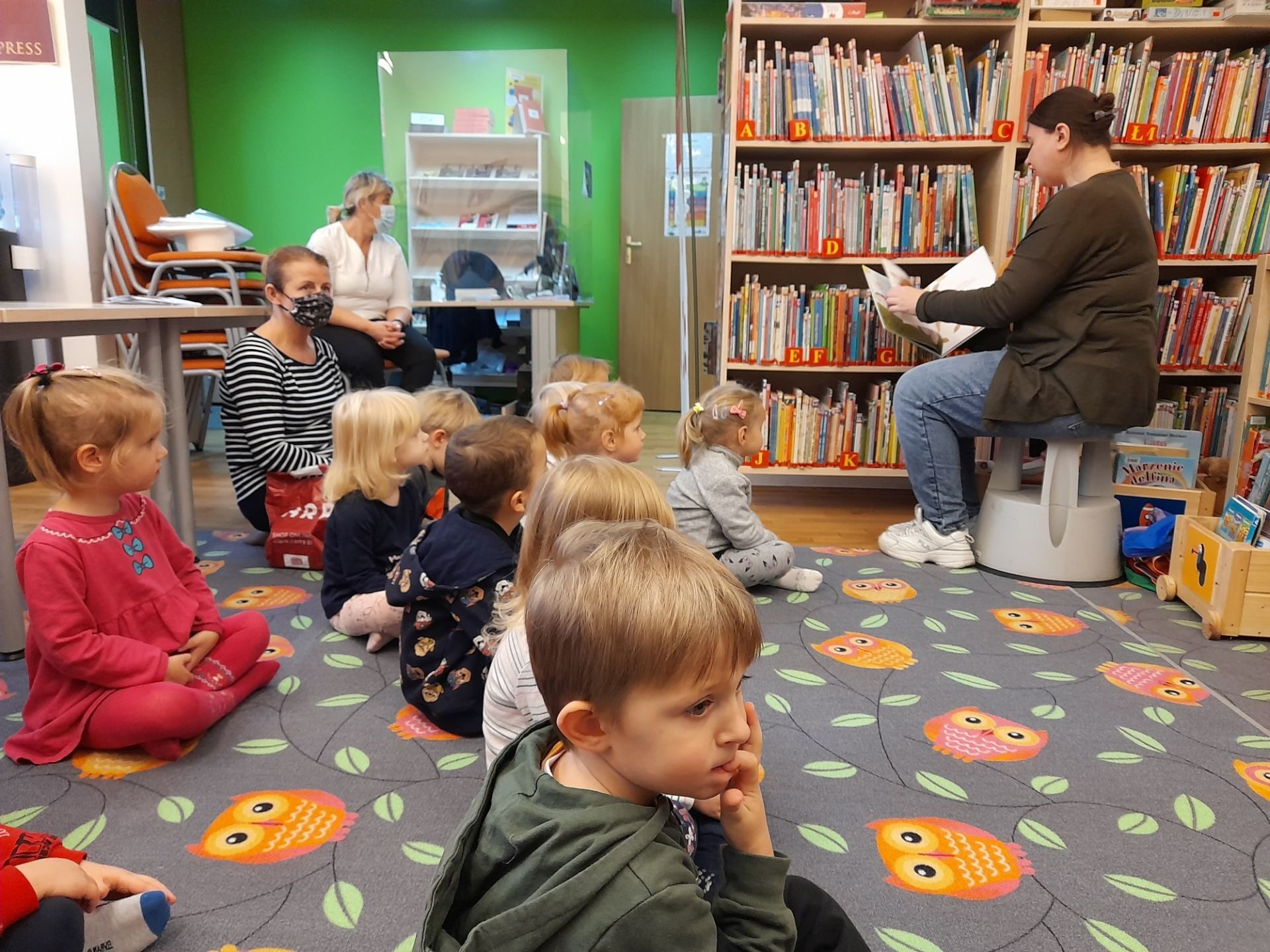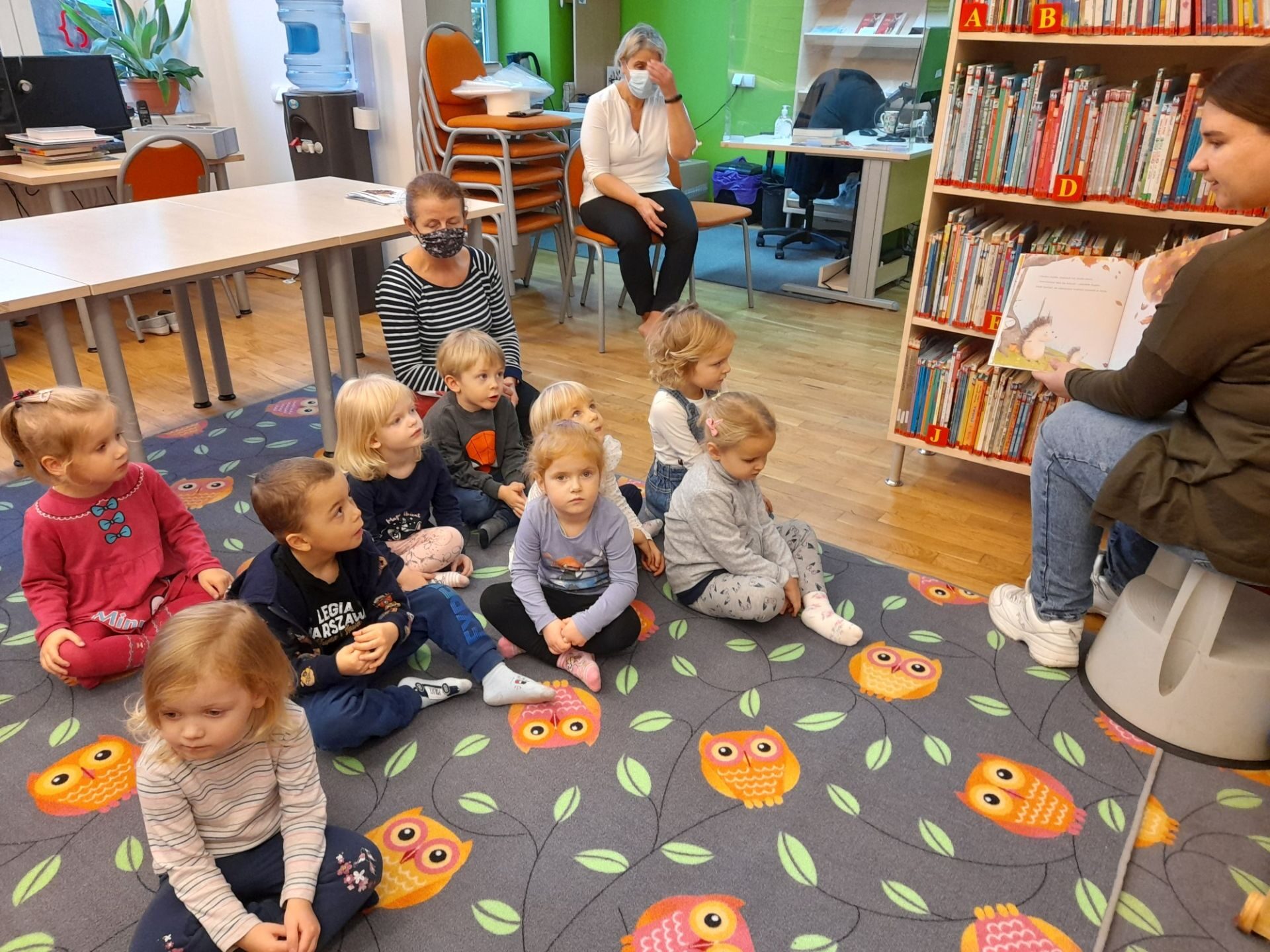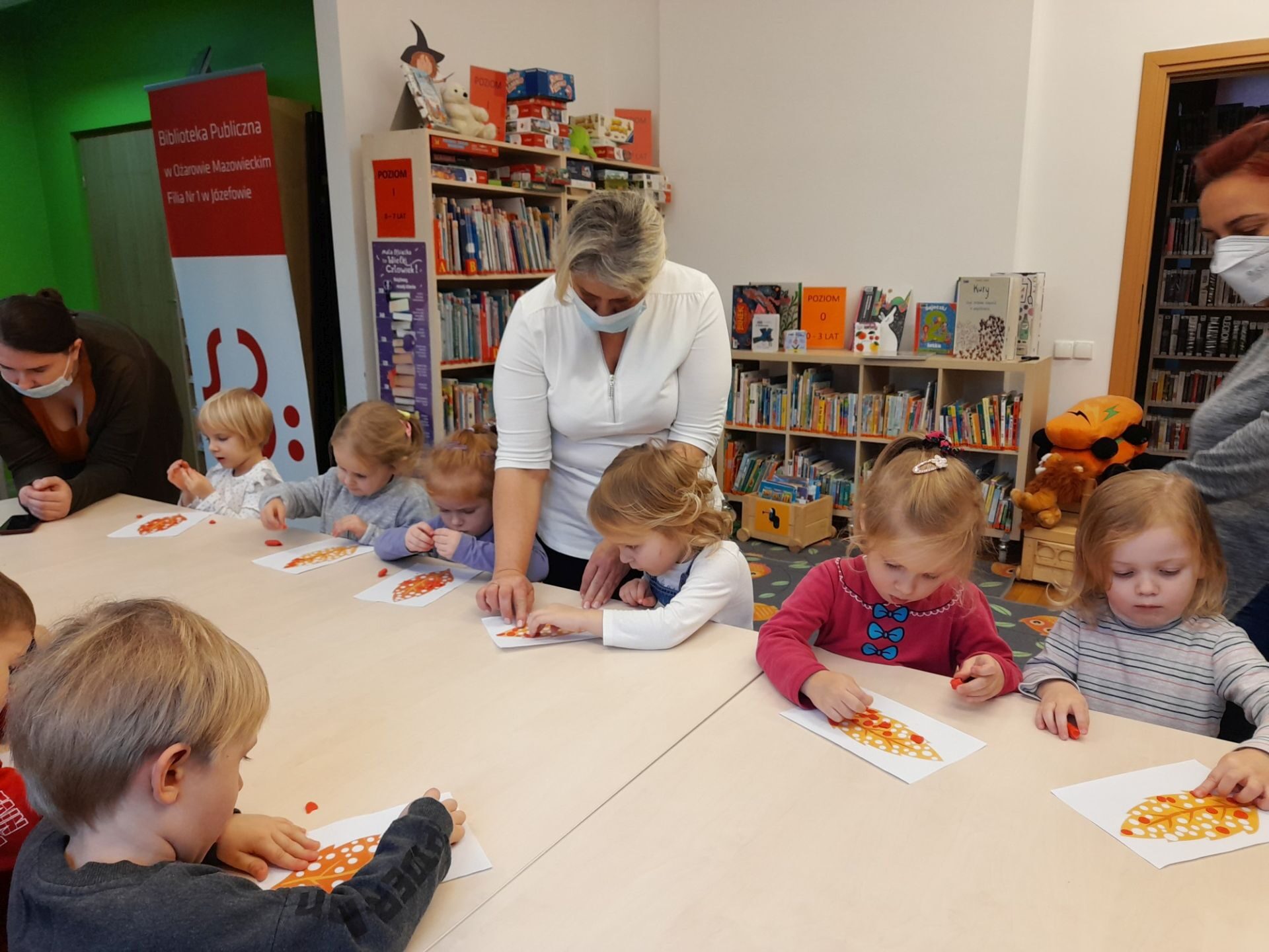 Dnia 19.11.2021 dzieci z grupy Kotki odwiedziły Bibliotekę w Józefowie. Panie bibliotekarki poprowadziły ciekawe zajęcia. Przedszkolaki wysłuchały opowiadania pt. „ Przygody małego Jeżyka”. Rozwiązywały zagadki o jesieni i zwierzętach leśnych. Bawiły się z chustą animacyjną – były to zabawy ruchowe o tematyce jesiennej. Zwieńczeniem zajęć było wylepianie plasteliną liścia i oglądanie książek dla dzieci.