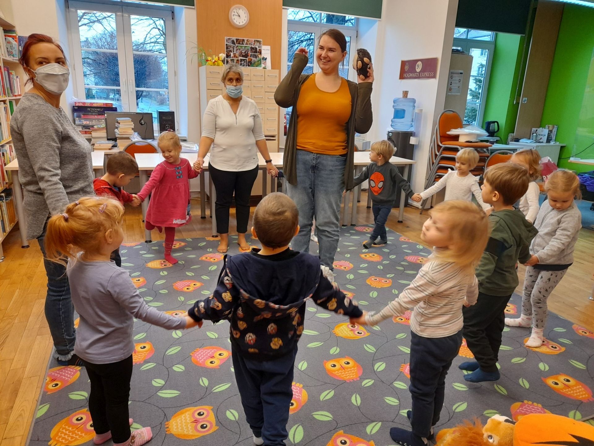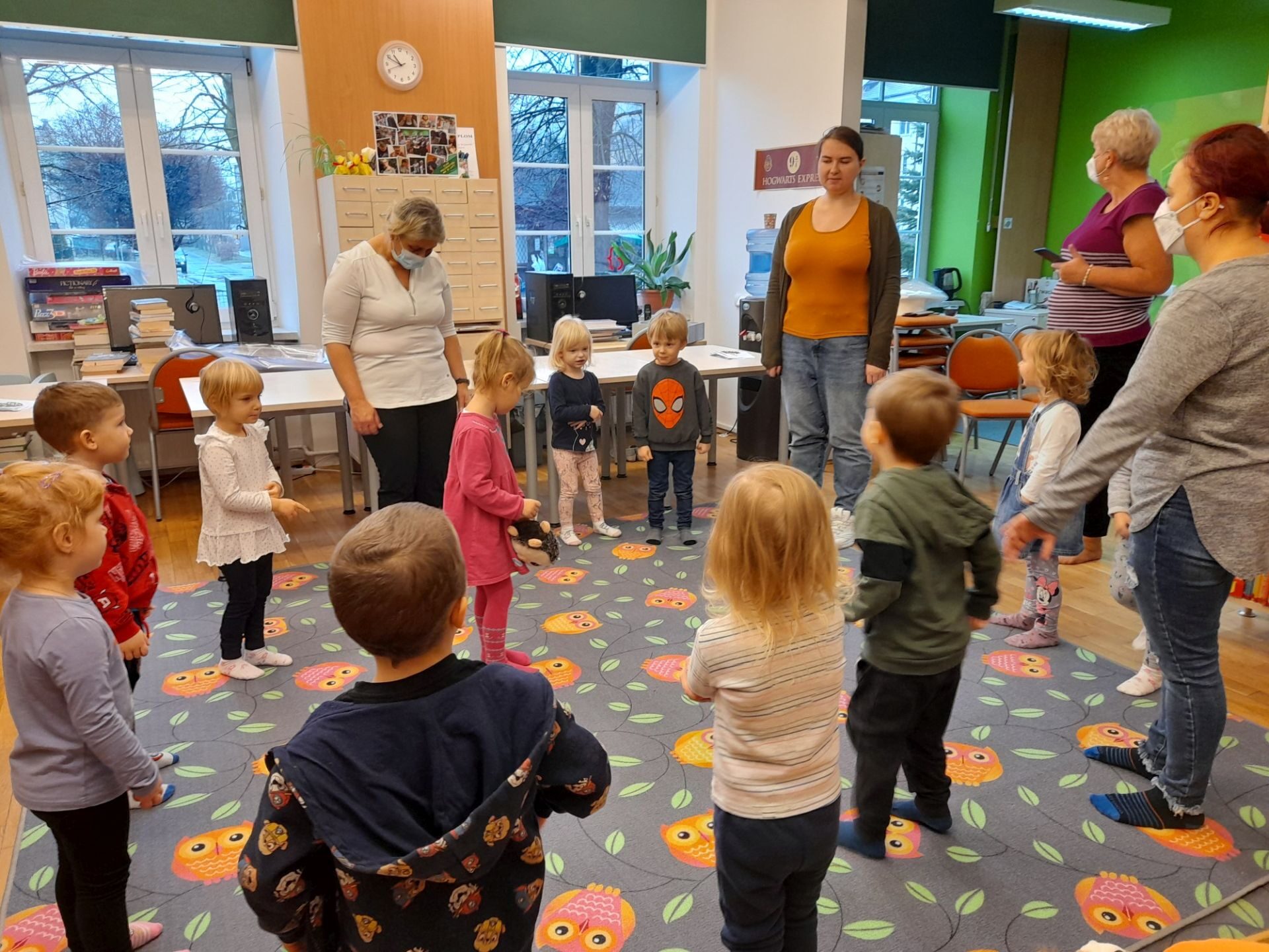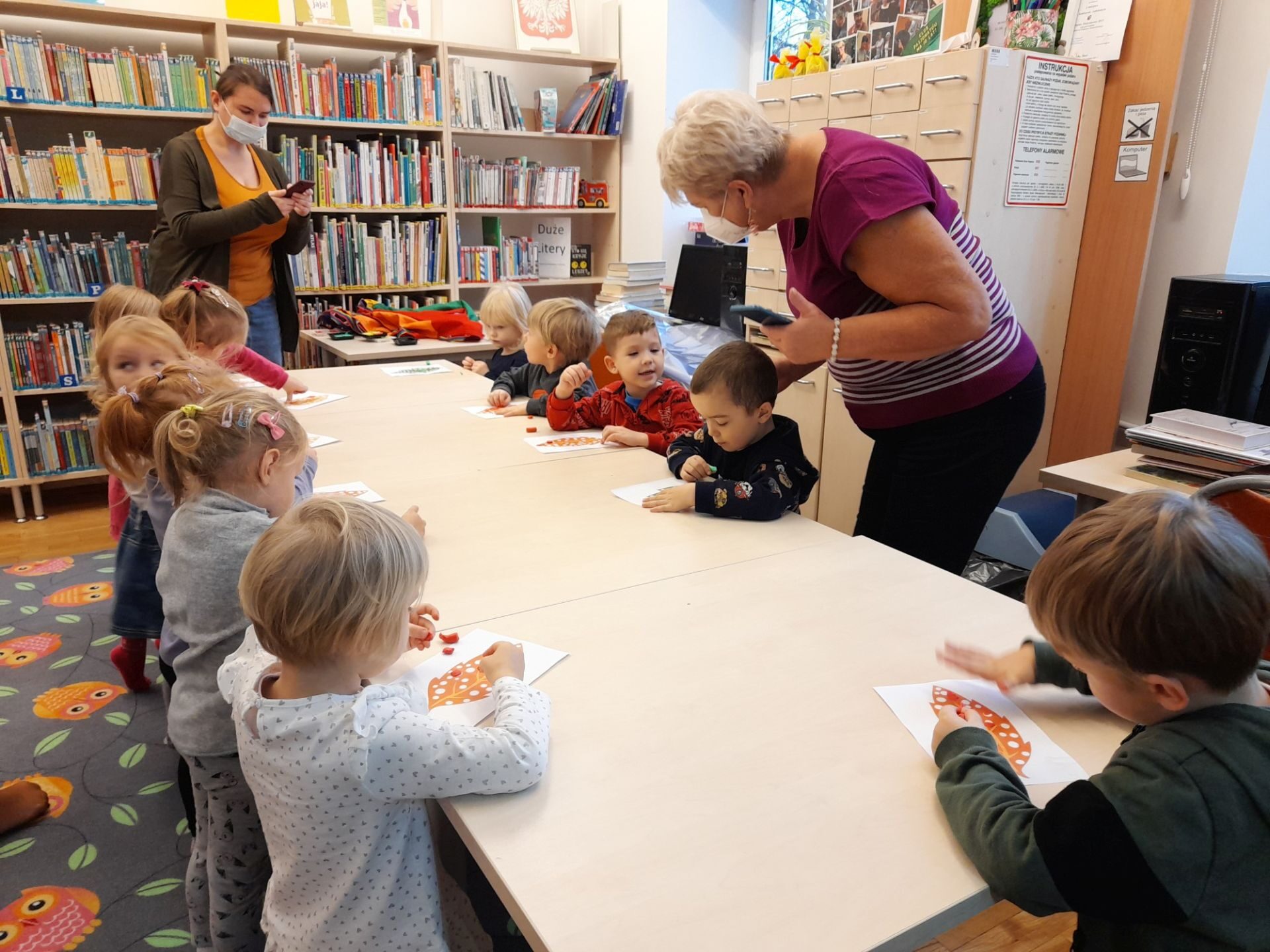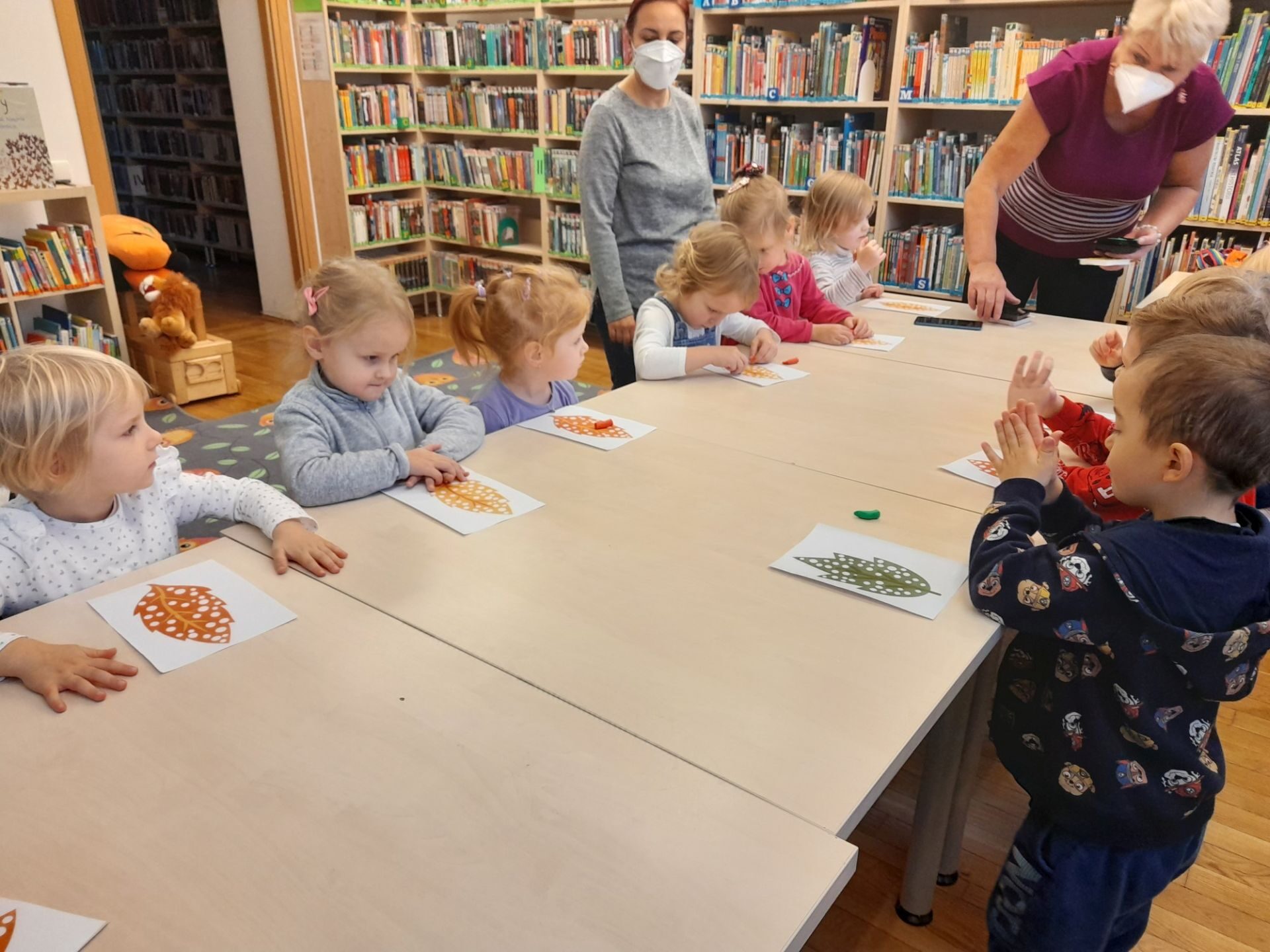 Dnia 19.11.2021 dzieci z grupy Kotki odwiedziły Bibliotekę w Józefowie. Panie bibliotekarki poprowadziły ciekawe zajęcia. Przedszkolaki wysłuchały opowiadania pt. „ Przygody małego Jeżyka”. Rozwiązywały zagadki o jesieni i zwierzętach leśnych. Bawiły się z chustą animacyjną – były to zabawy ruchowe o tematyce jesiennej. Zwieńczeniem zajęć było wylepianie plasteliną liścia i oglądanie książek dla dzieci.
