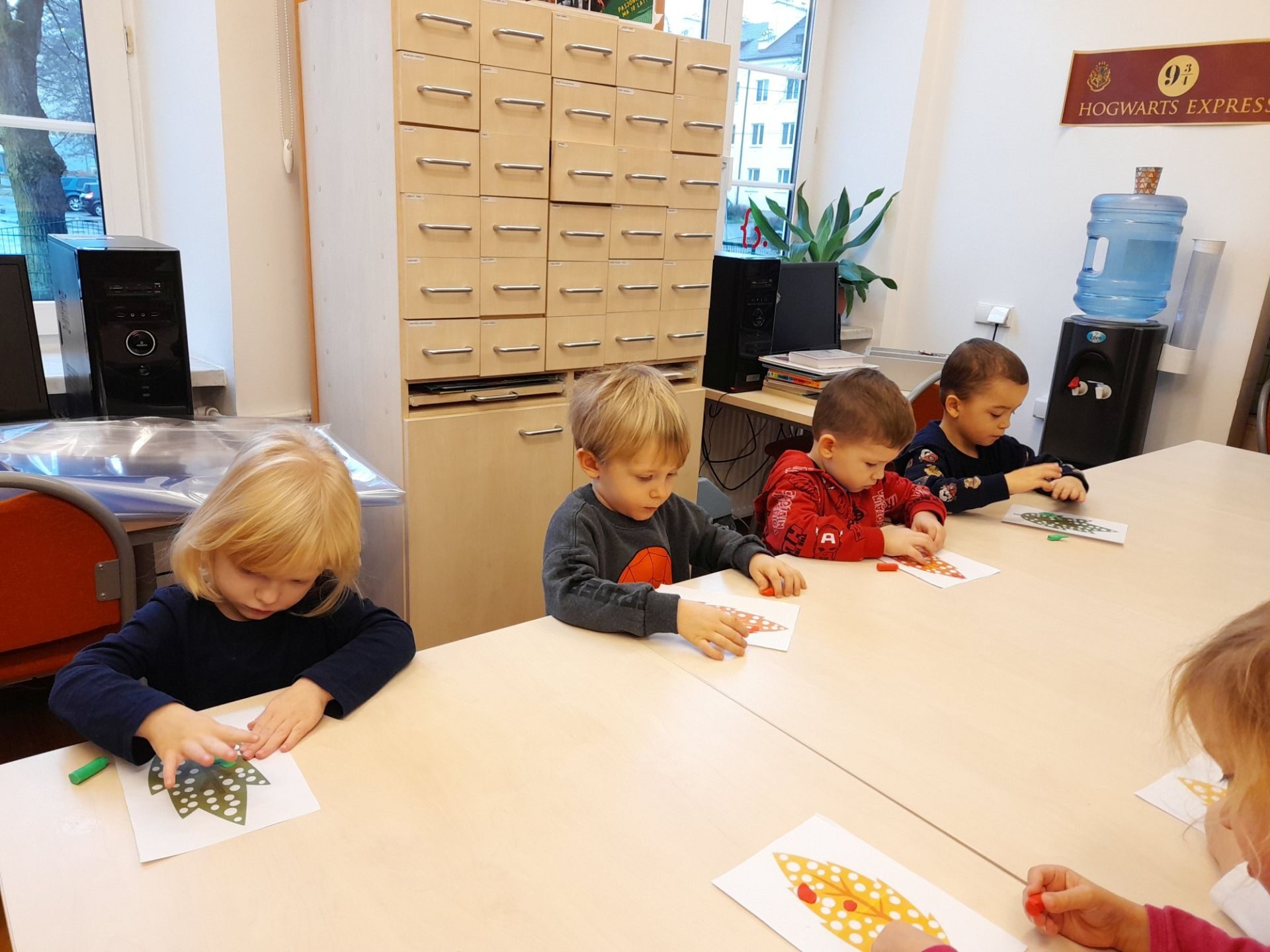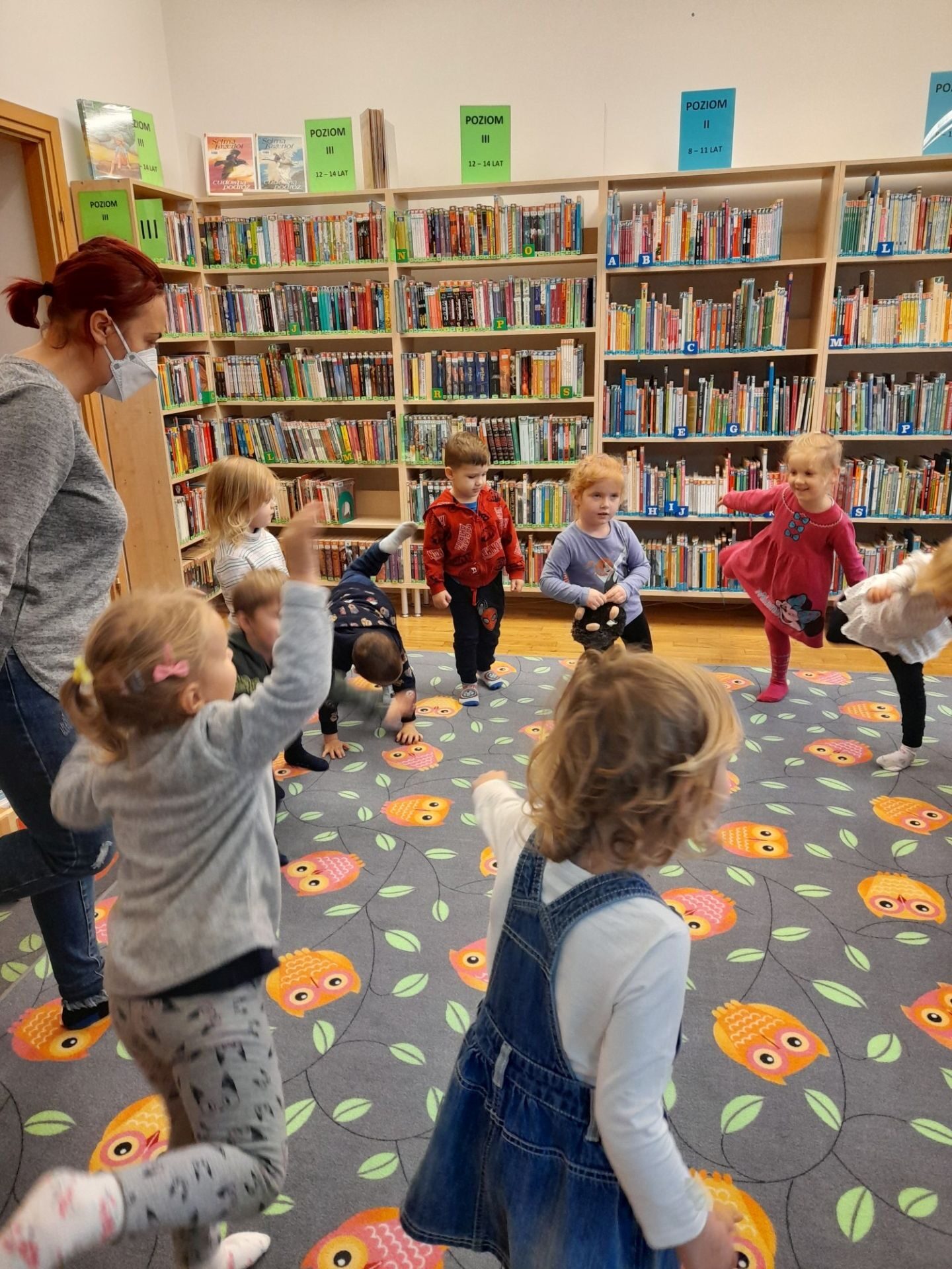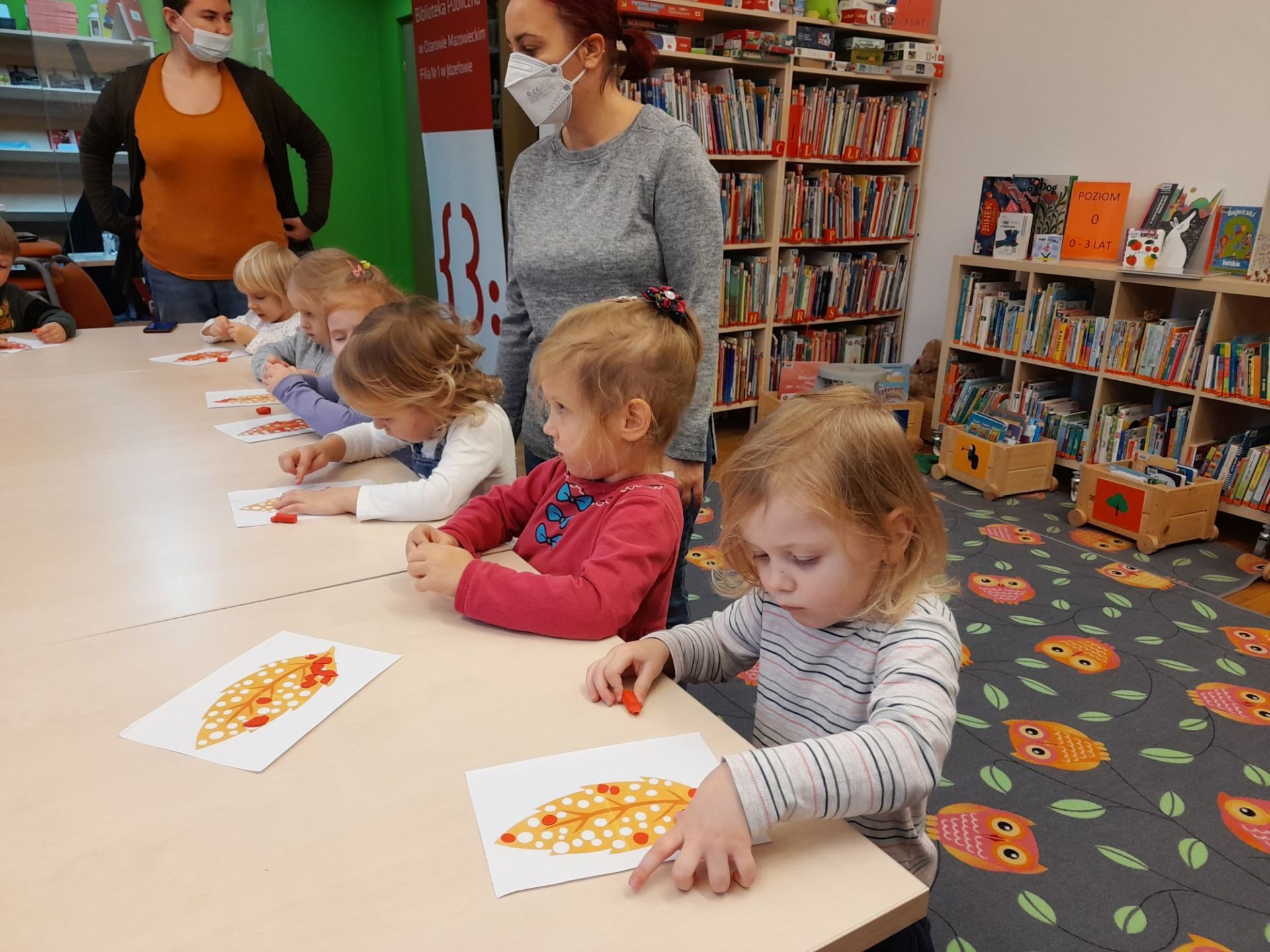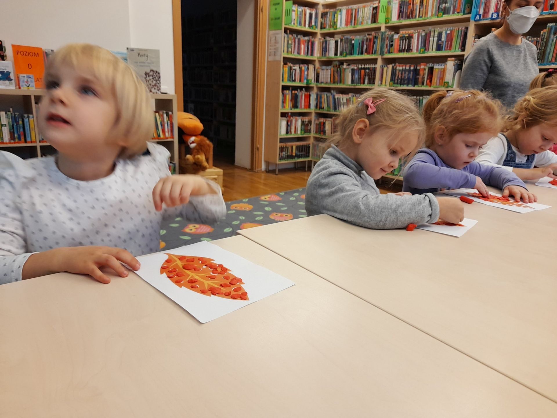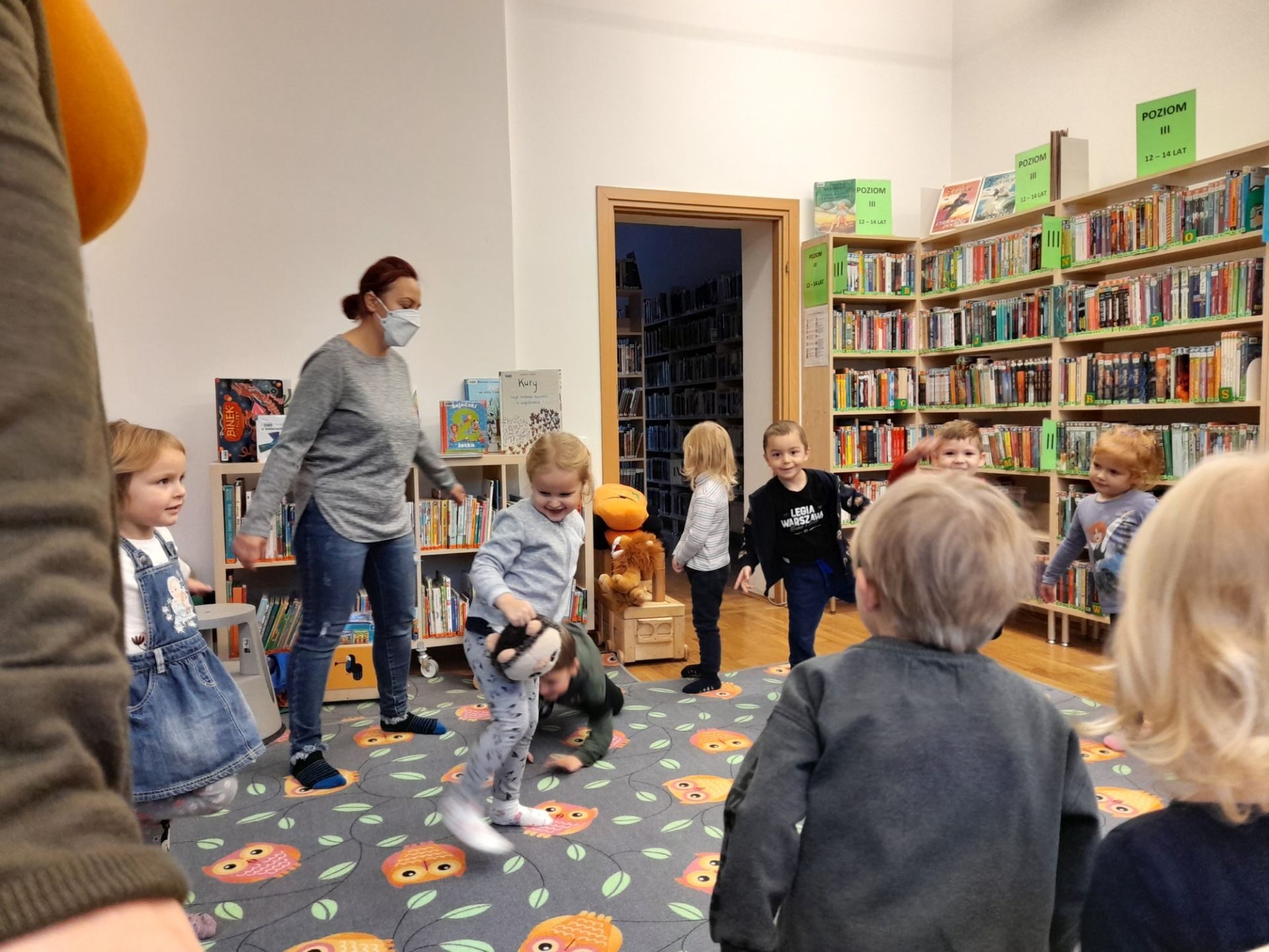 Dnia 19.11.2021 dzieci z grupy Kotki odwiedziły Bibliotekę w Józefowie. Panie bibliotekarki poprowadziły ciekawe zajęcia. Przedszkolaki wysłuchały opowiadania pt. „ Przygody małego Jeżyka”. Rozwiązywały zagadki o jesieni i zwierzętach leśnych. Bawiły się z chustą animacyjną – były to zabawy ruchowe o tematyce jesiennej. Zwieńczeniem zajęć było wylepianie plasteliną liścia i oglądanie książek dla dzieci.