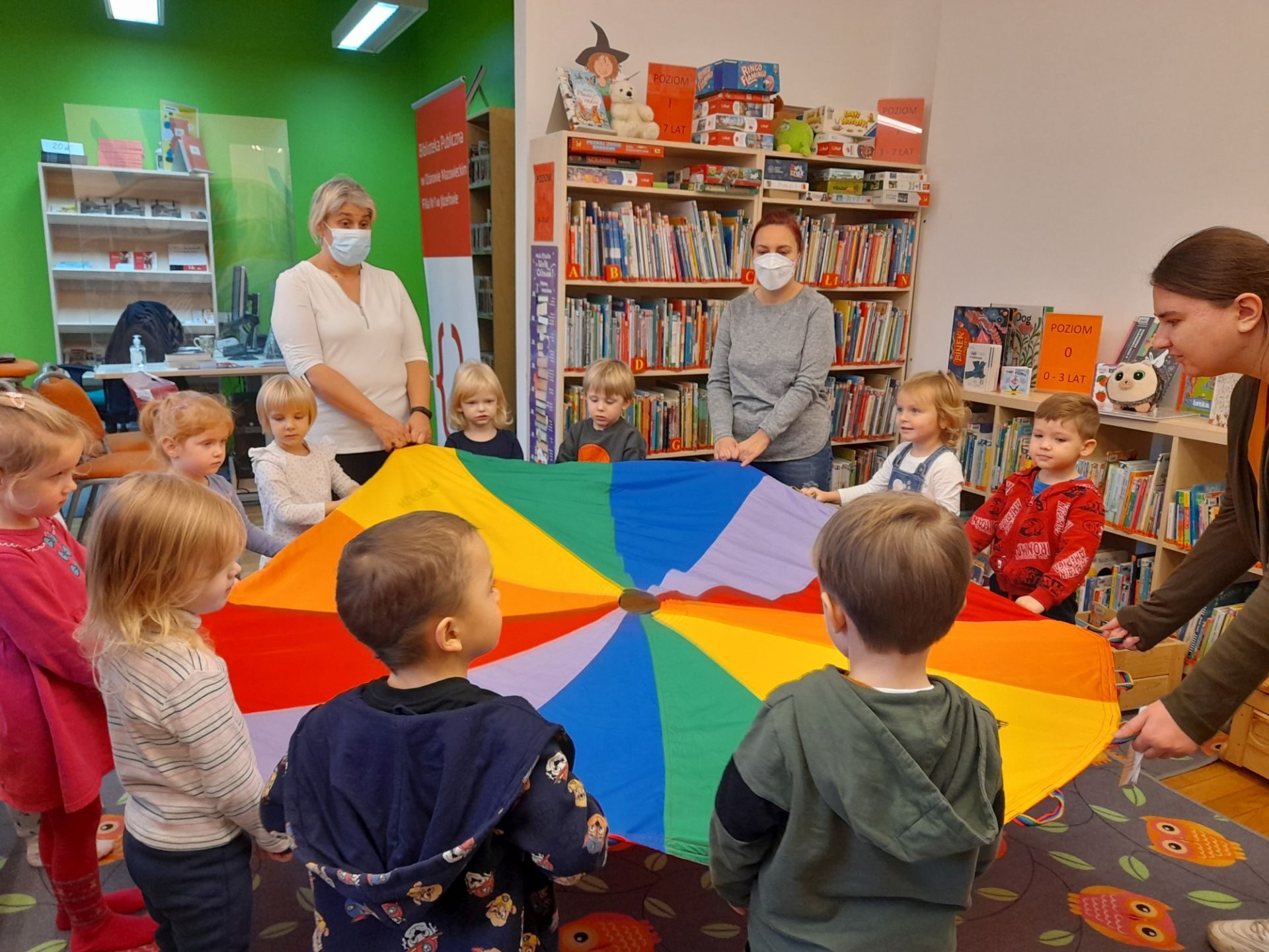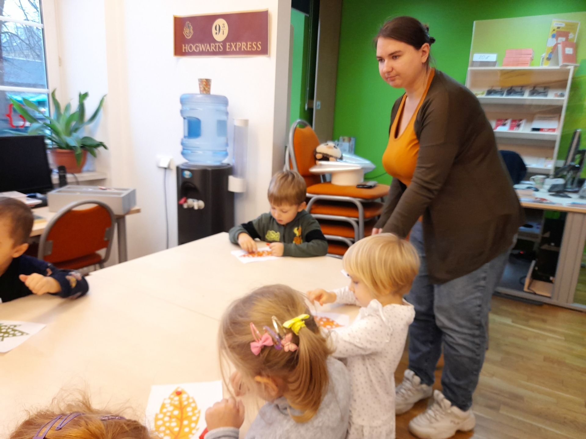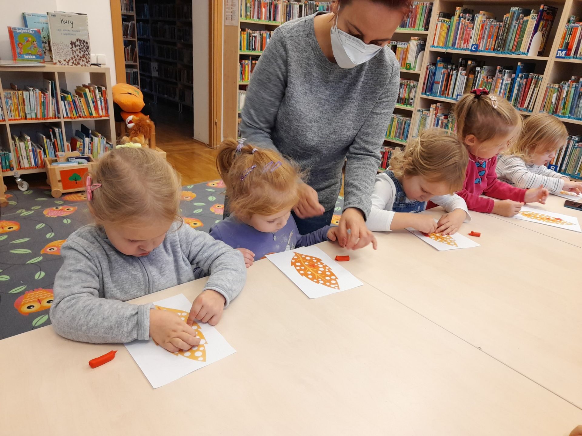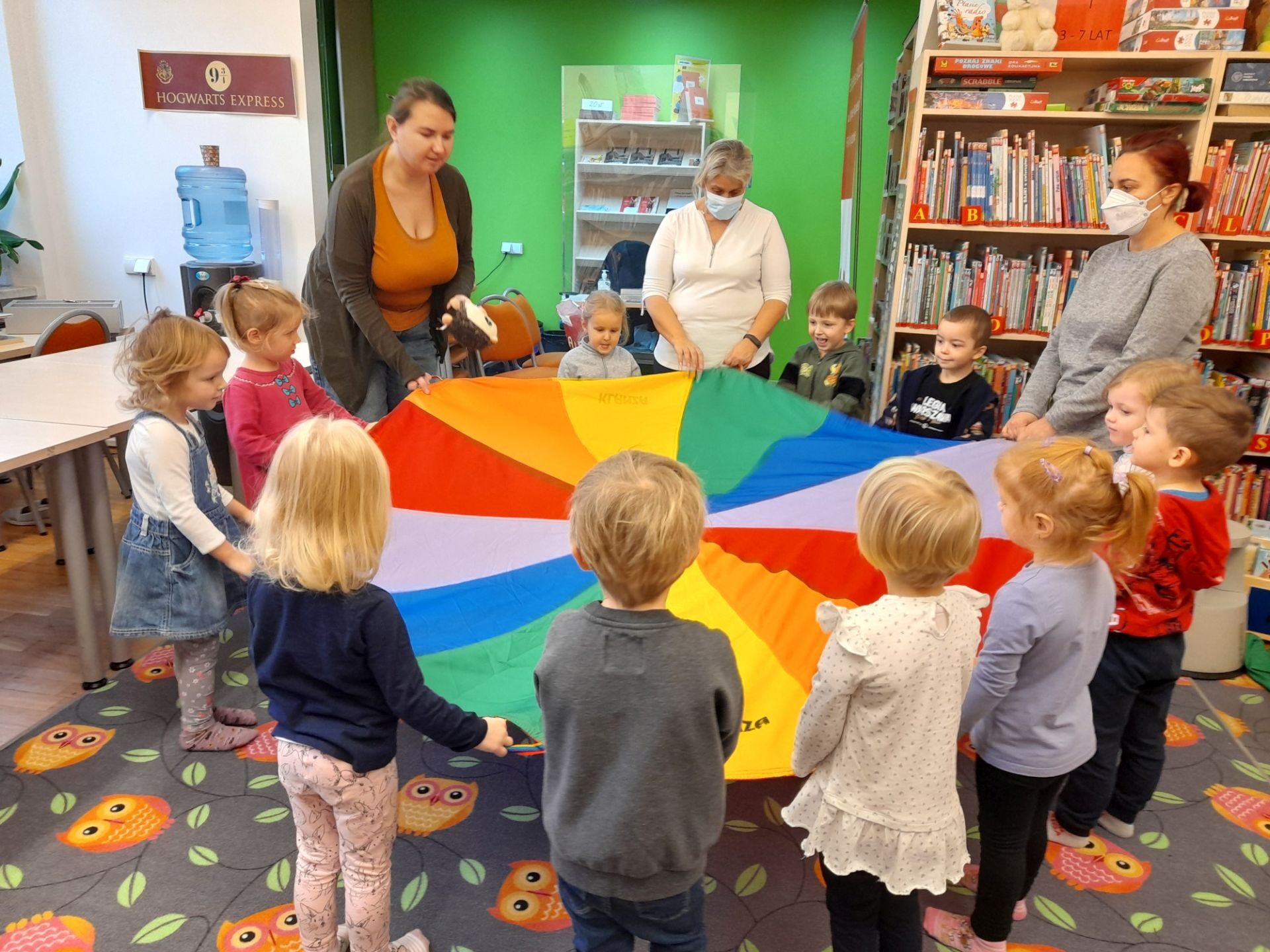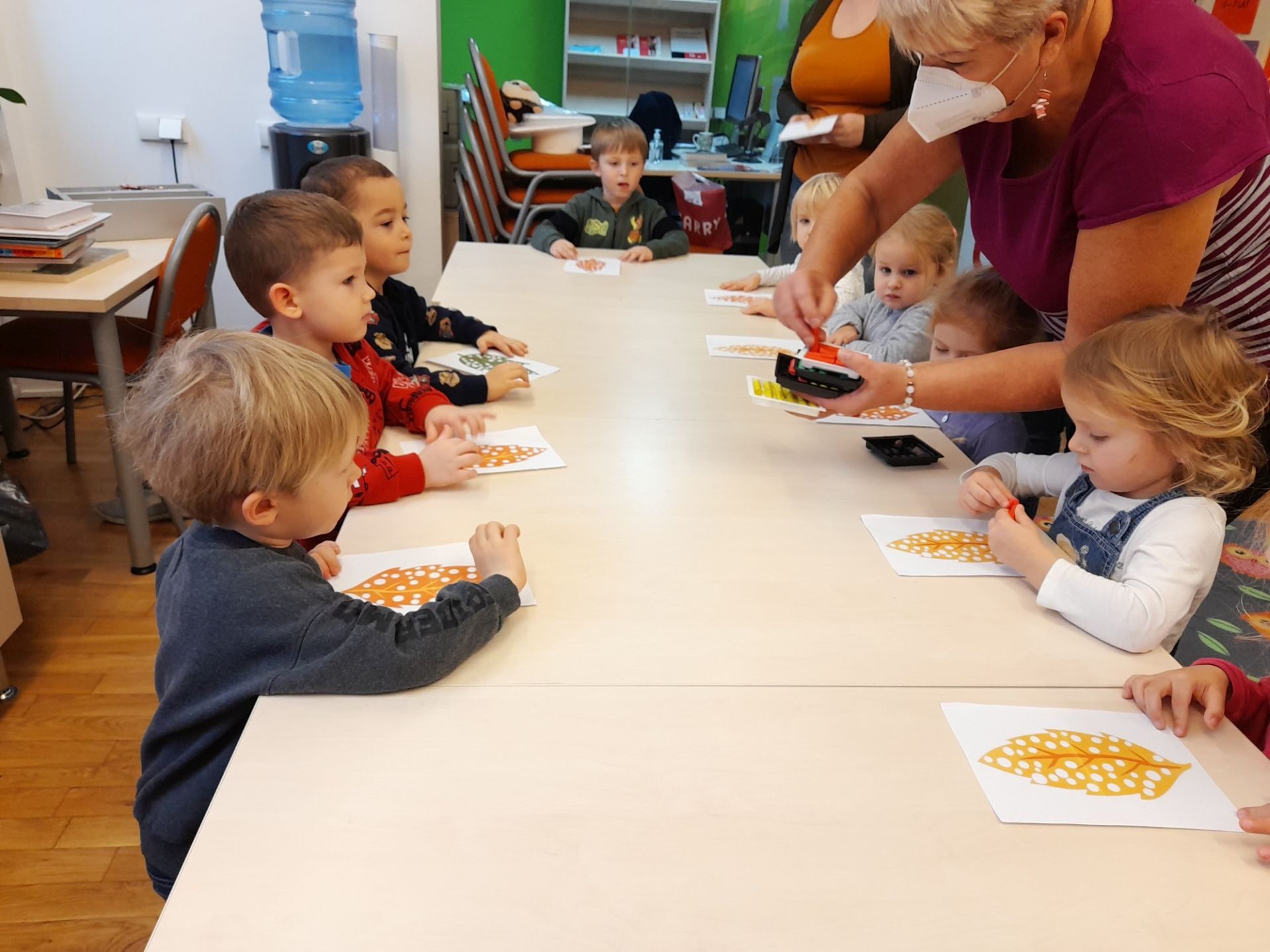 Dnia 19.11.2021 dzieci z grupy Kotki odwiedziły Bibliotekę w Józefowie. Panie bibliotekarki poprowadziły ciekawe zajęcia. Przedszkolaki wysłuchały opowiadania pt. „ Przygody małego Jeżyka”. Rozwiązywały zagadki o jesieni i zwierzętach leśnych. Bawiły się z chustą animacyjną – były to zabawy ruchowe o tematyce jesiennej. Zwieńczeniem zajęć było wylepianie plasteliną liścia i oglądanie książek dla dzieci.