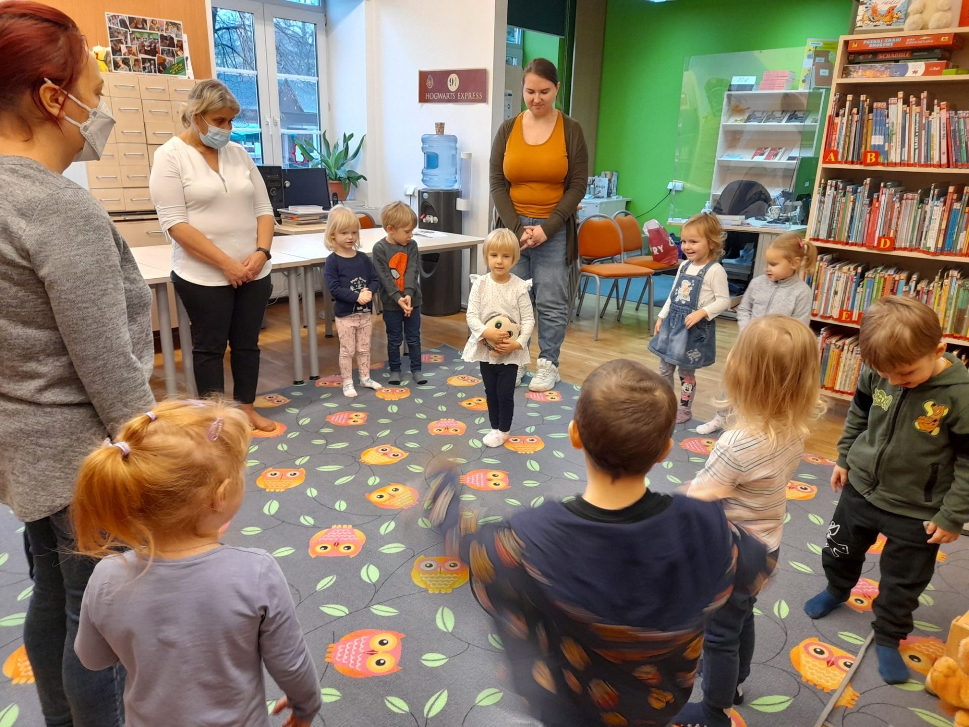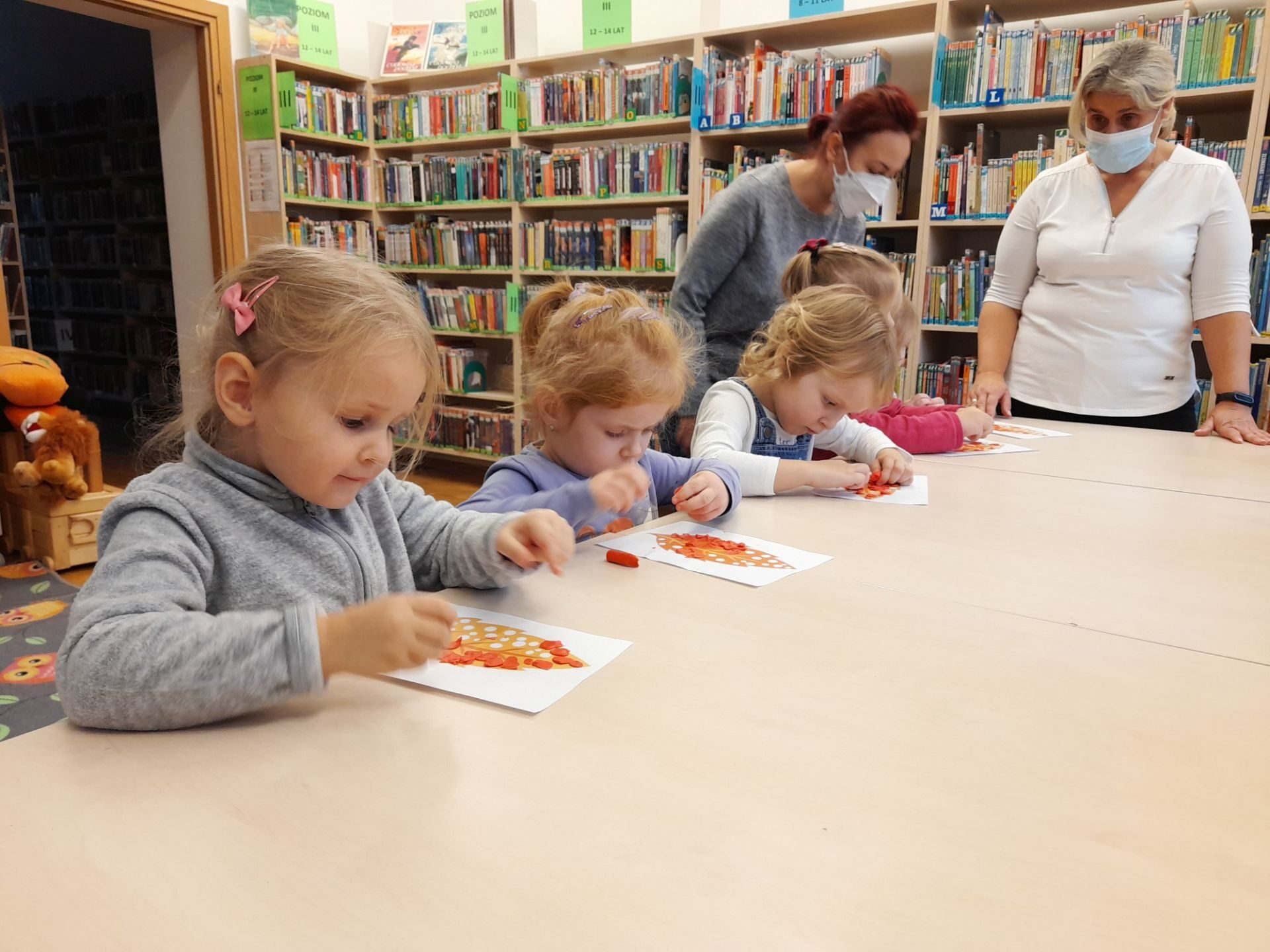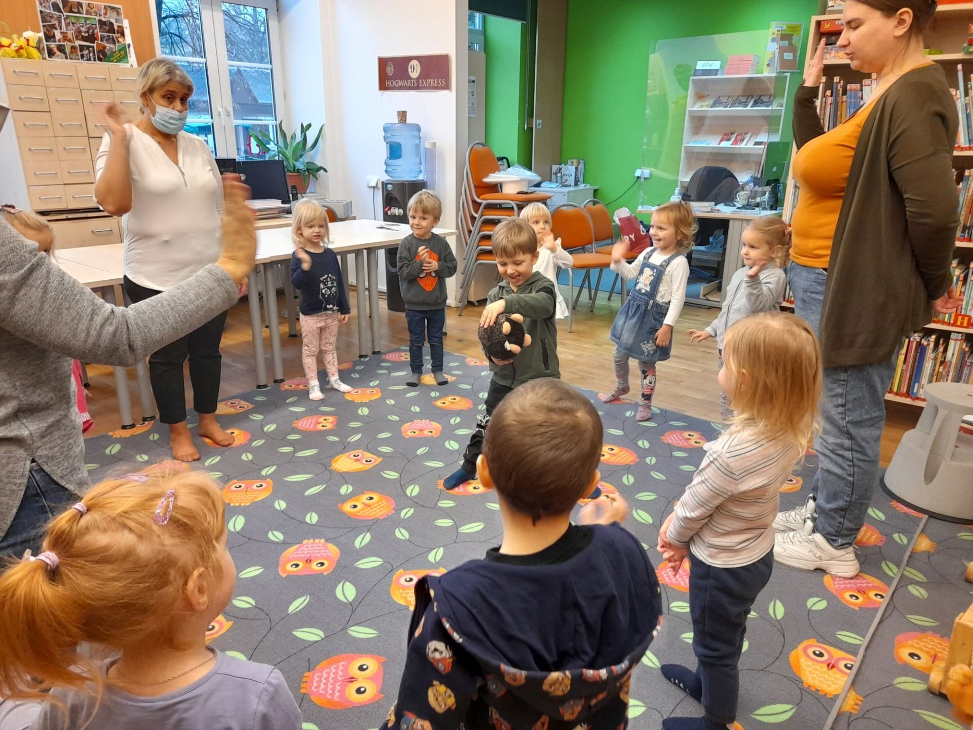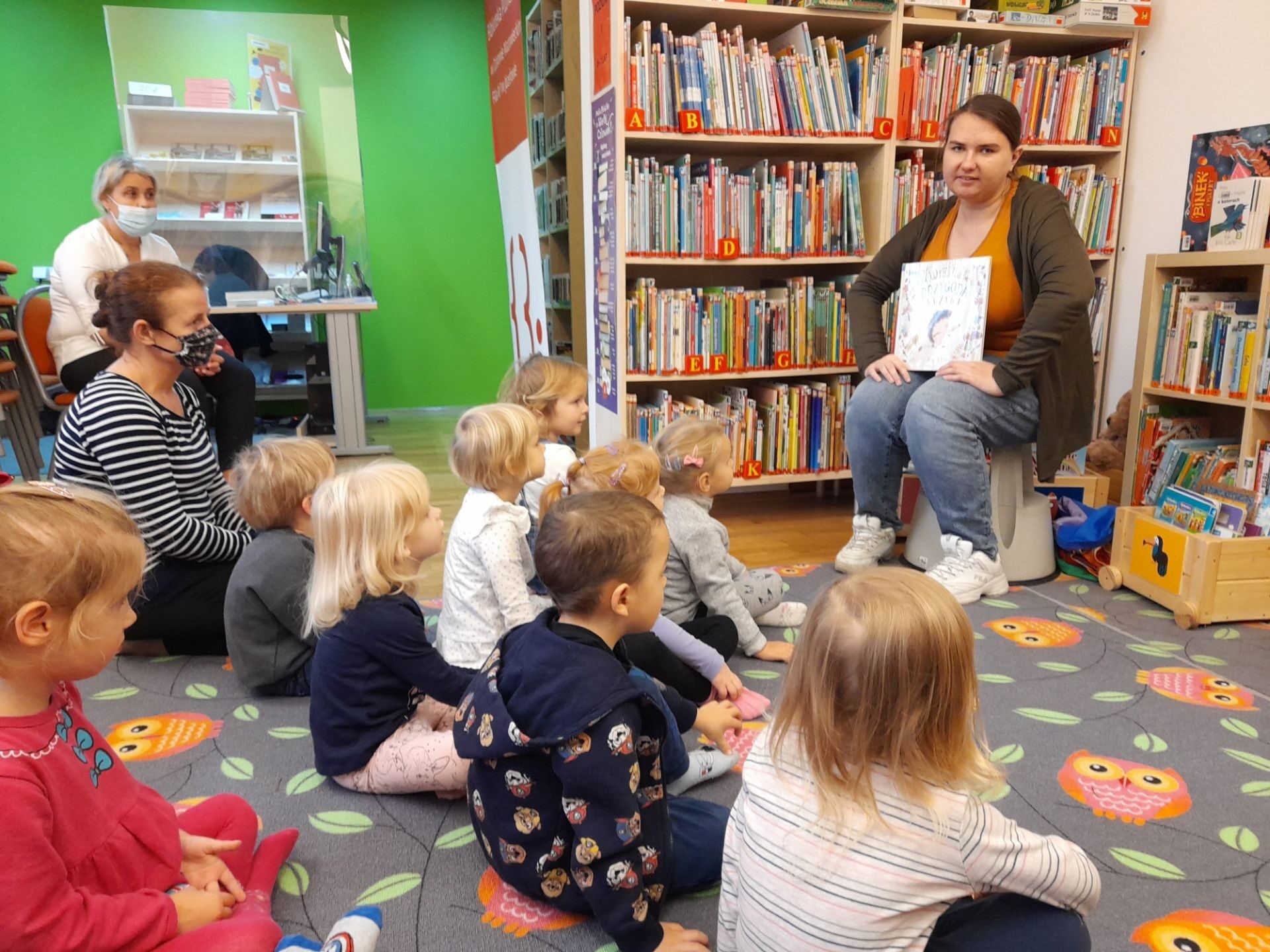 Dnia 19.11.2021 dzieci z grupy Kotki odwiedziły Bibliotekę w Józefowie. Panie bibliotekarki poprowadziły ciekawe zajęcia. Przedszkolaki wysłuchały opowiadania pt. „ Przygody małego Jeżyka”. Rozwiązywały zagadki o jesieni i zwierzętach leśnych. Bawiły się z chustą animacyjną – były to zabawy ruchowe o tematyce jesiennej. Zwieńczeniem zajęć było wylepianie plasteliną liścia i oglądanie książek dla dzieci.