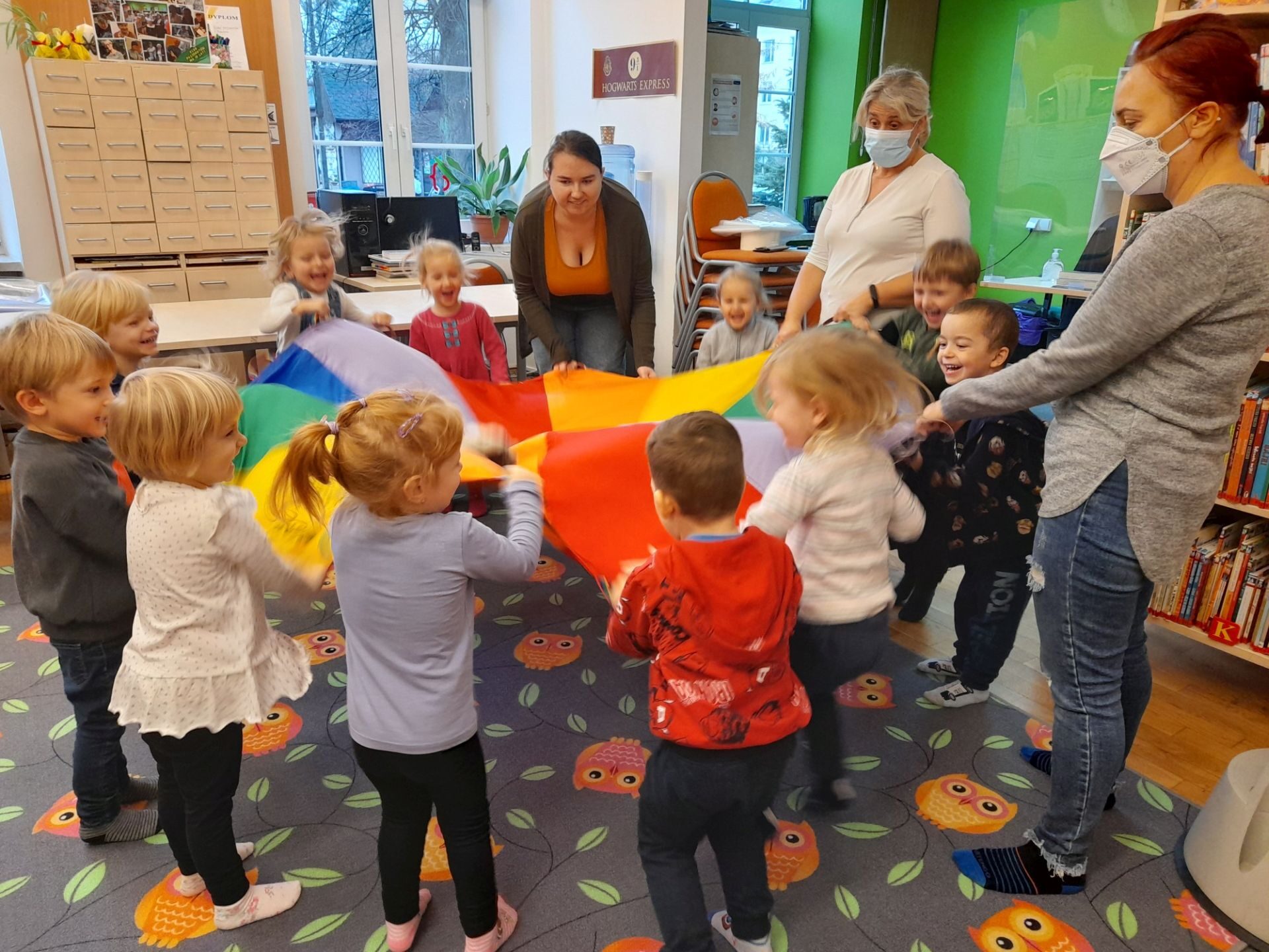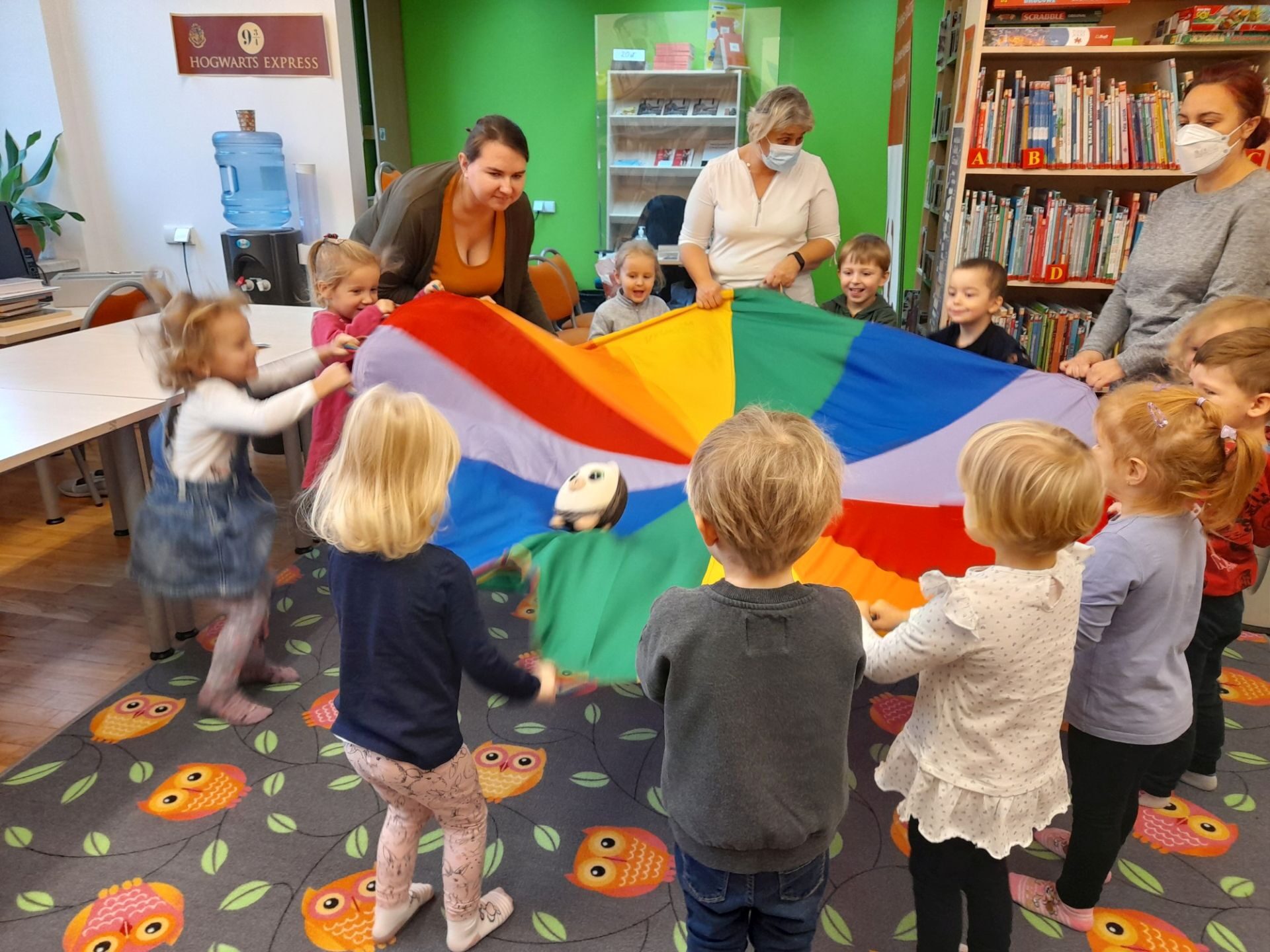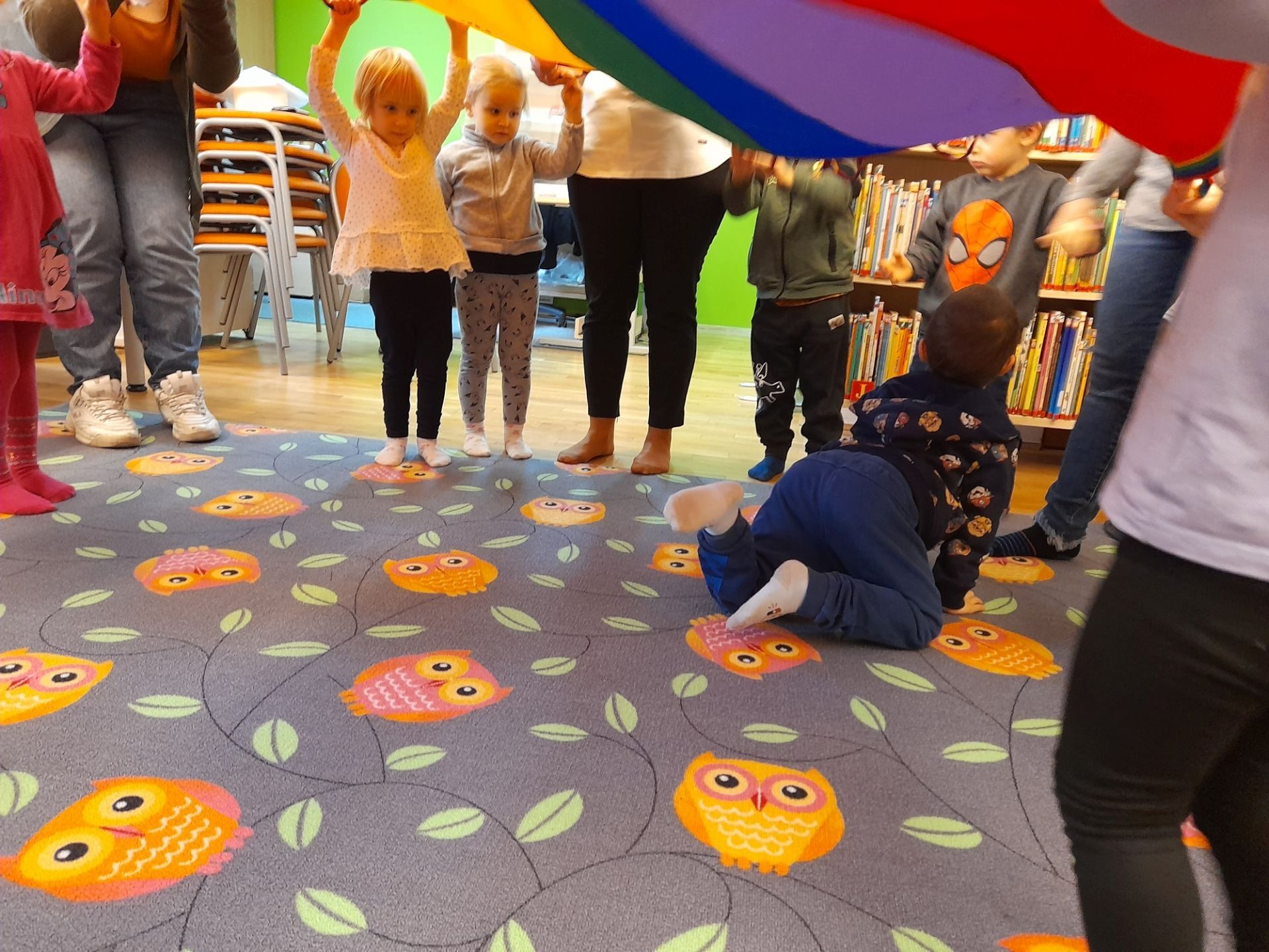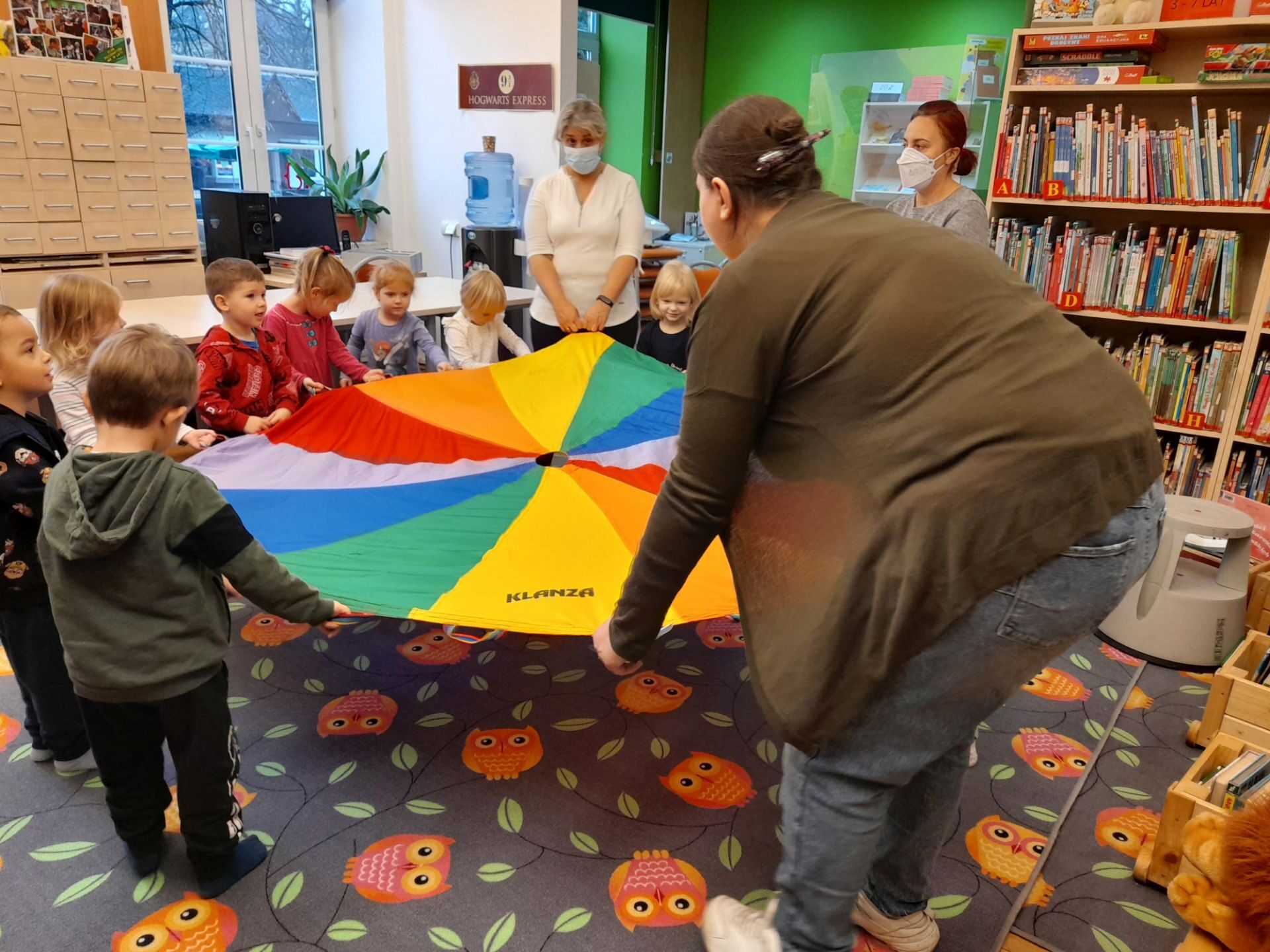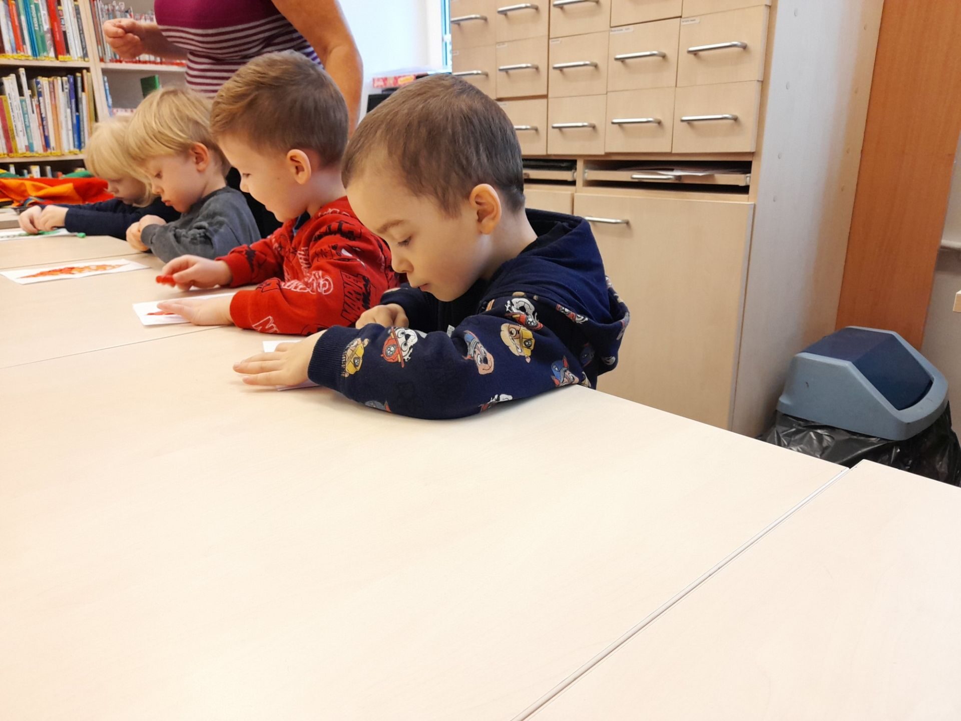 Dnia 19.11.2021 dzieci z grupy Kotki odwiedziły Bibliotekę w Józefowie. Panie bibliotekarki poprowadziły ciekawe zajęcia. Przedszkolaki wysłuchały opowiadania pt. „ Przygody małego Jeżyka”. Rozwiązywały zagadki o jesieni i zwierzętach leśnych. Bawiły się z chustą animacyjną – były to zabawy ruchowe o tematyce jesiennej. Zwieńczeniem zajęć było wylepianie plasteliną liścia i oglądanie książek dla dzieci.