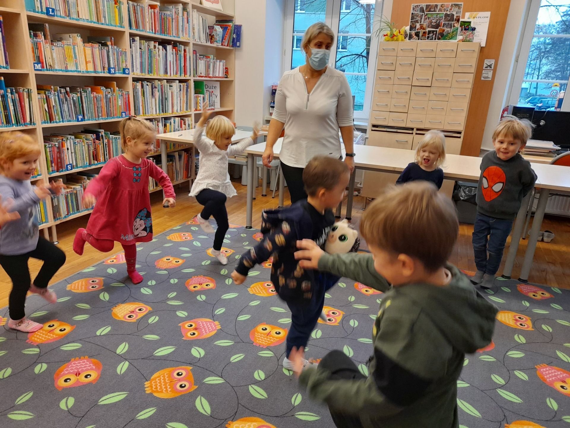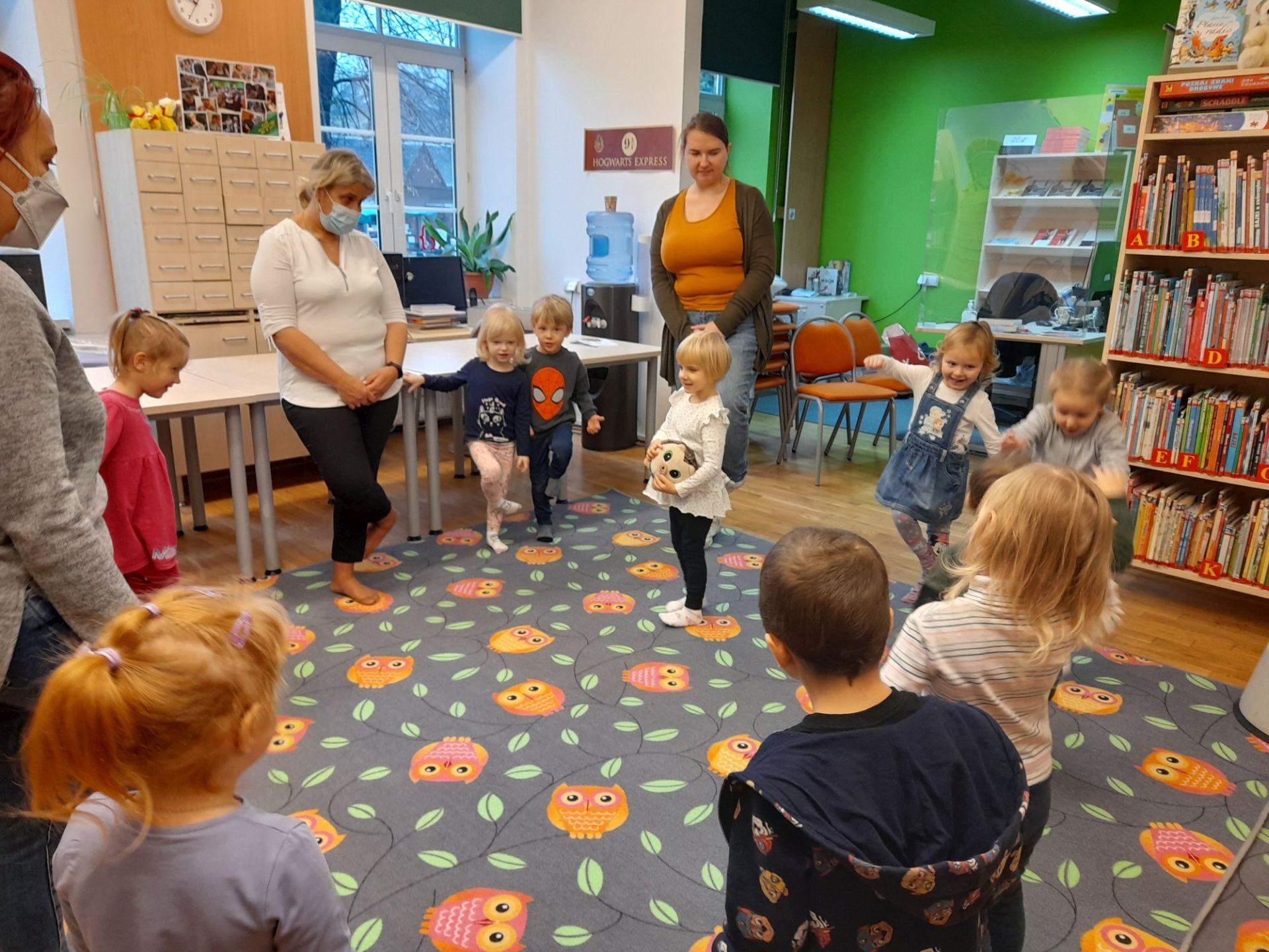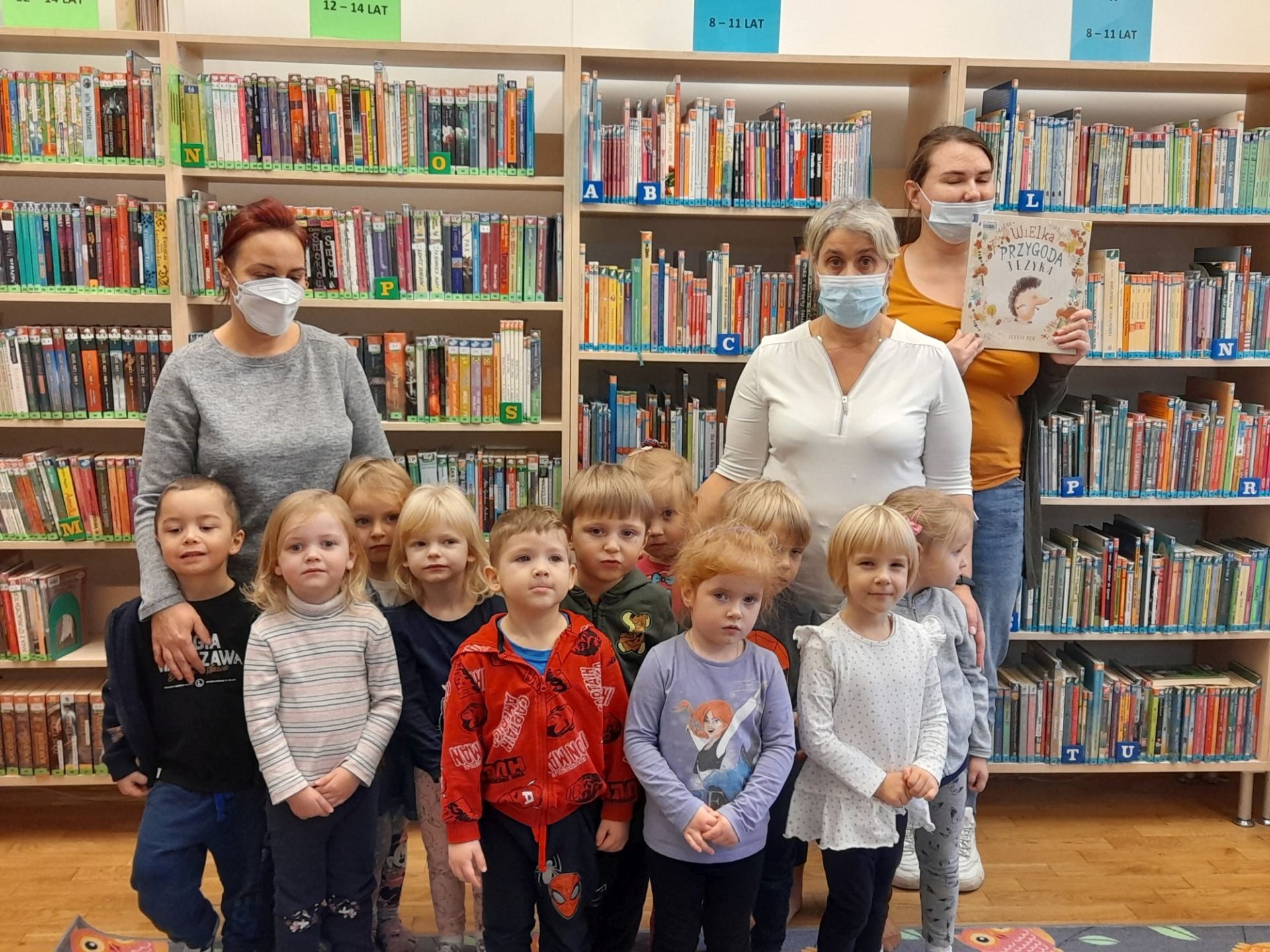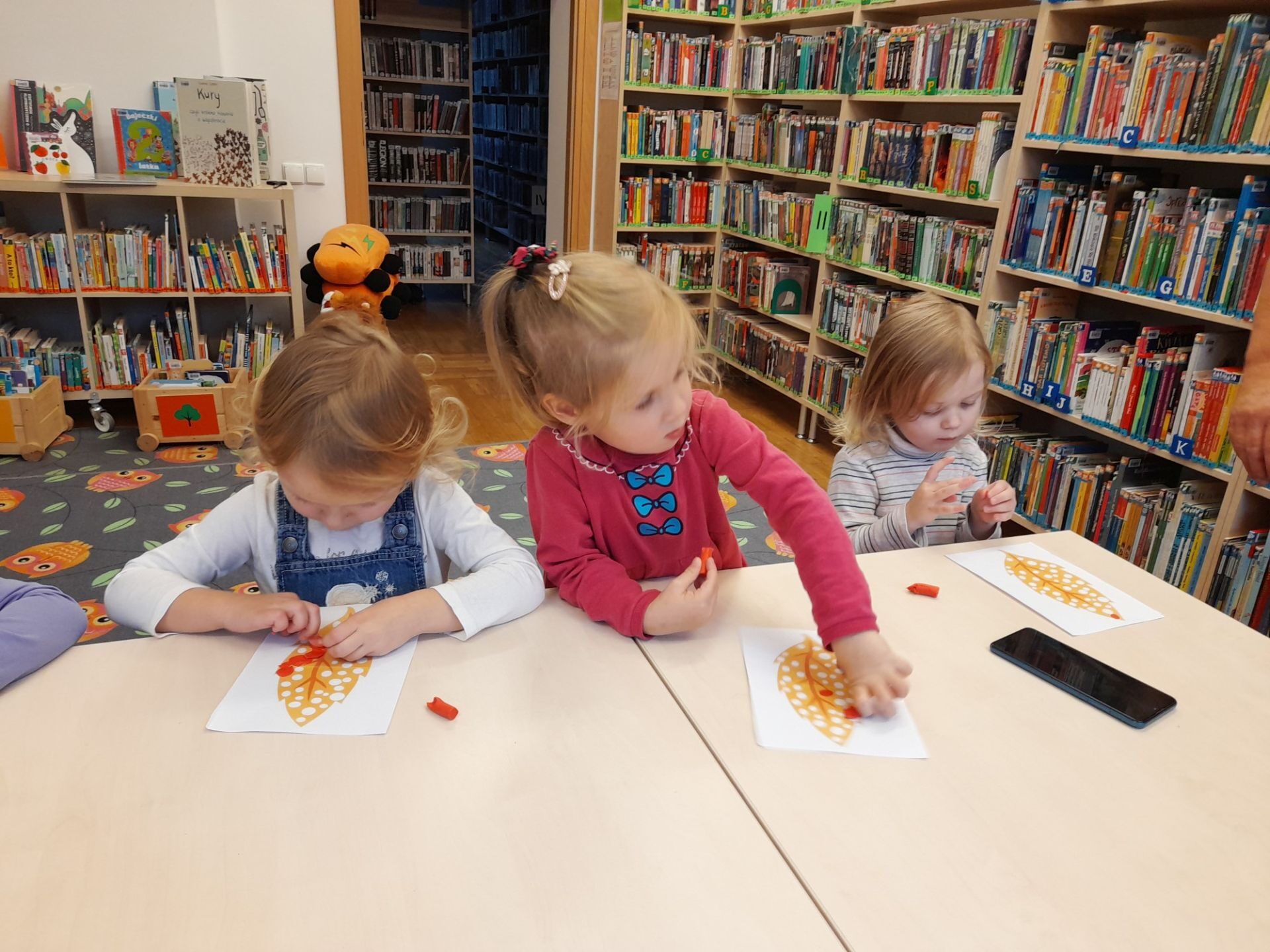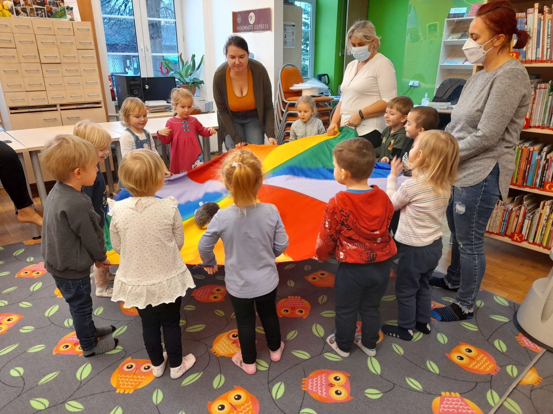 Dnia 19.11.2021 dzieci z grupy Kotki odwiedziły Bibliotekę w Józefowie. Panie bibliotekarki poprowadziły ciekawe zajęcia. Przedszkolaki wysłuchały opowiadania pt. „ Przygody małego Jeżyka”. Rozwiązywały zagadki o jesieni i zwierzętach leśnych. Bawiły się z chustą animacyjną – były to zabawy ruchowe o tematyce jesiennej. Zwieńczeniem zajęć było wylepianie plasteliną liścia i oglądanie książek dla dzieci.