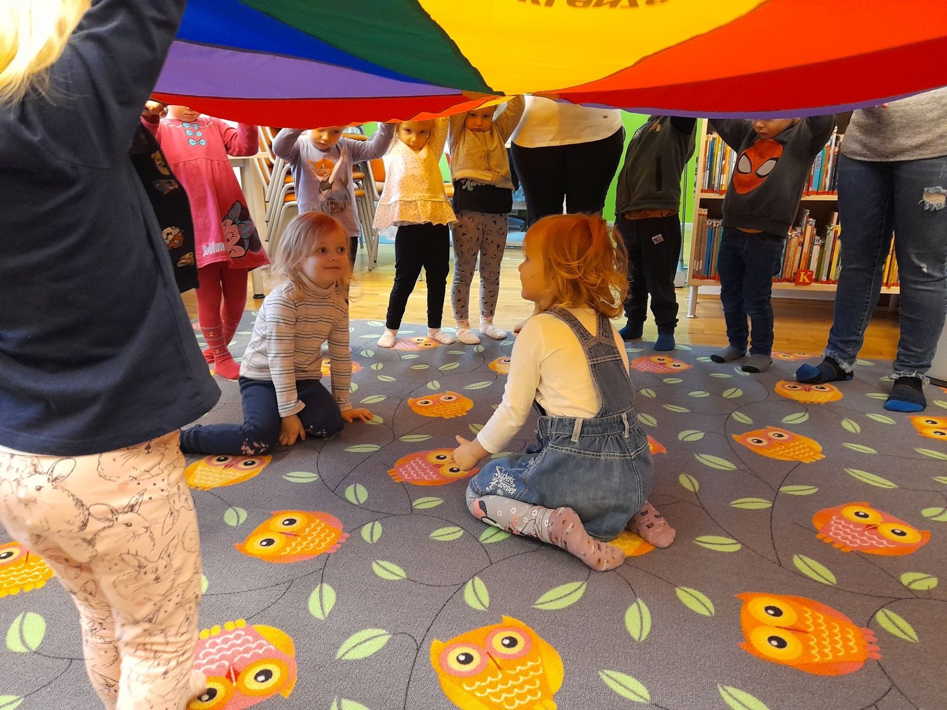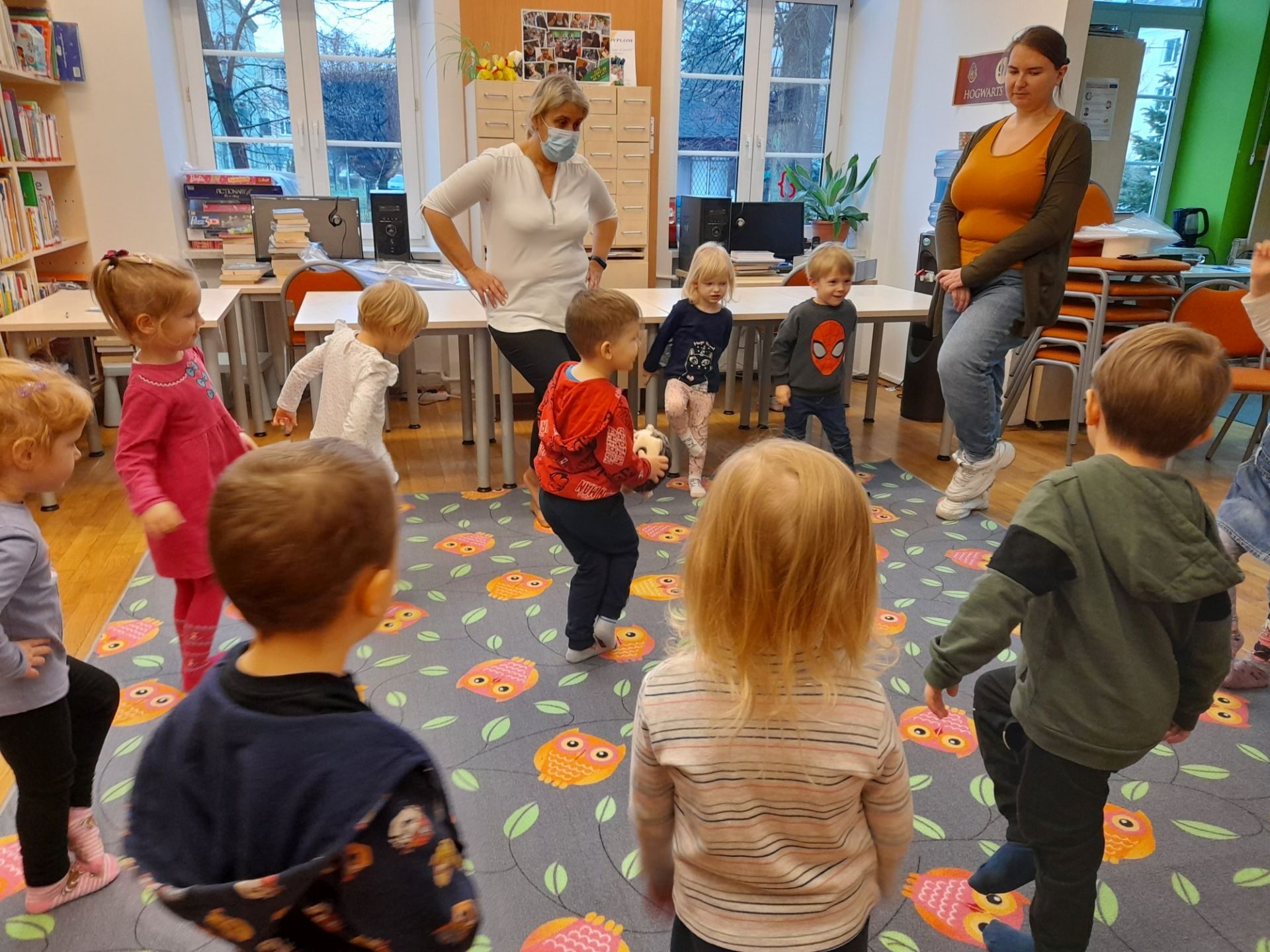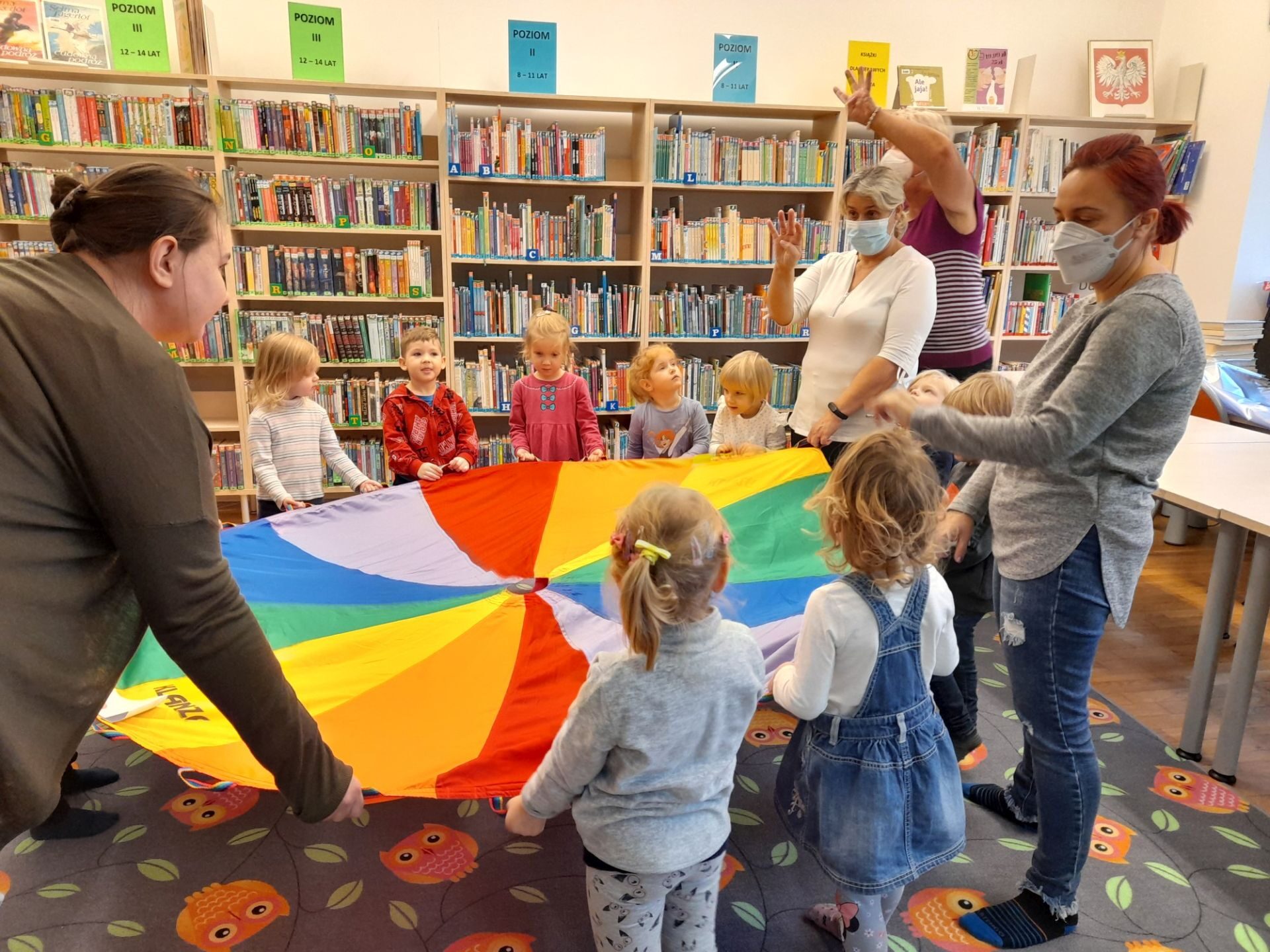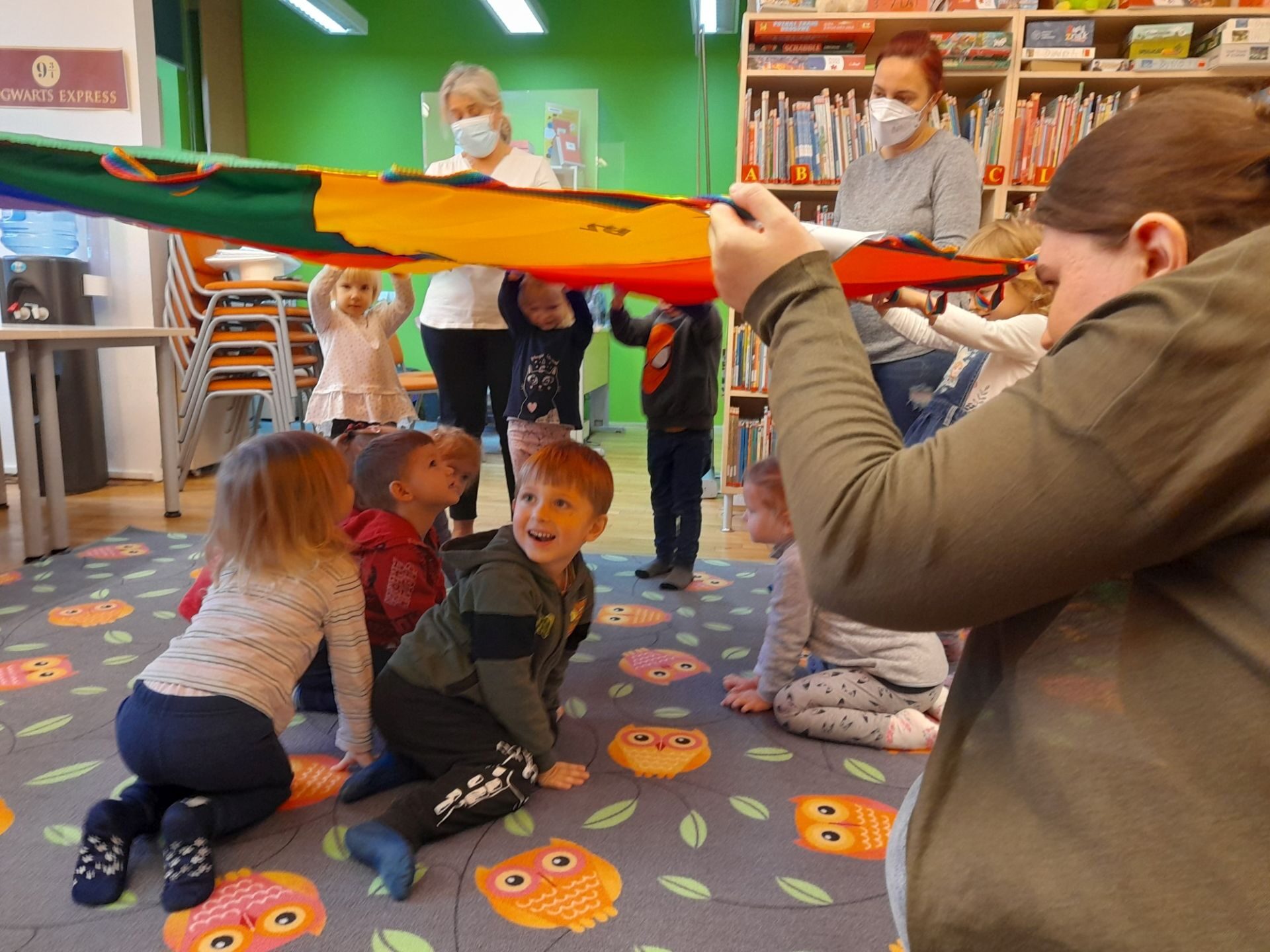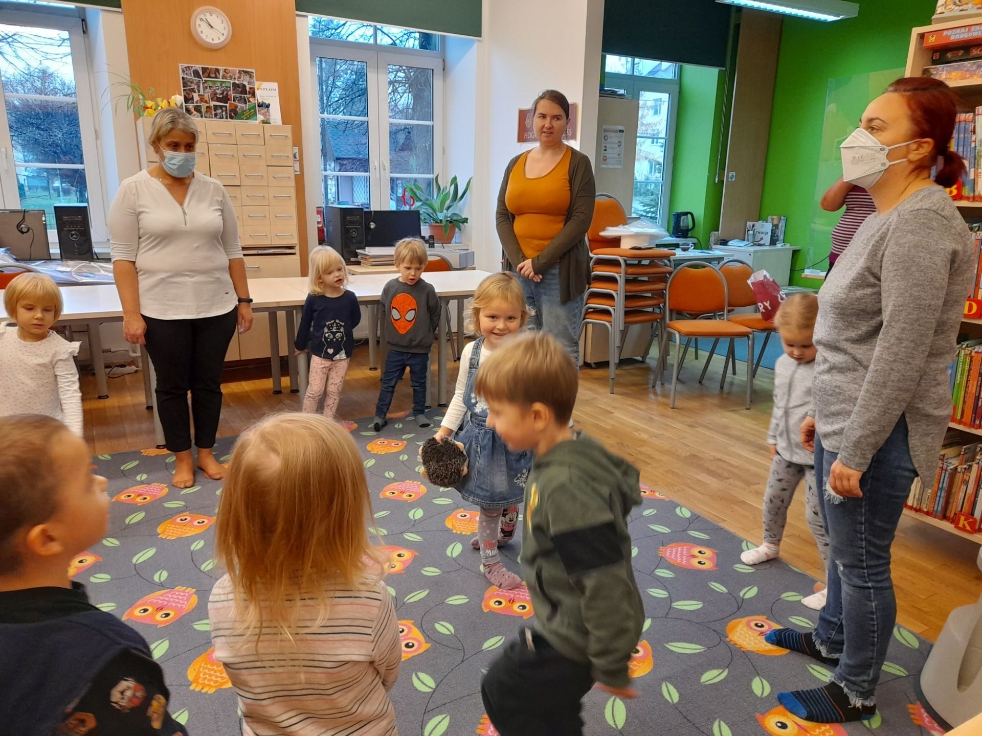 Dnia 19.11.2021 dzieci z grupy Kotki odwiedziły Bibliotekę w Józefowie. Panie bibliotekarki poprowadziły ciekawe zajęcia. Przedszkolaki wysłuchały opowiadania pt. „ Przygody małego Jeżyka”. Rozwiązywały zagadki o jesieni i zwierzętach leśnych. Bawiły się z chustą animacyjną – były to zabawy ruchowe o tematyce jesiennej. Zwieńczeniem zajęć było wylepianie plasteliną liścia i oglądanie książek dla dzieci.