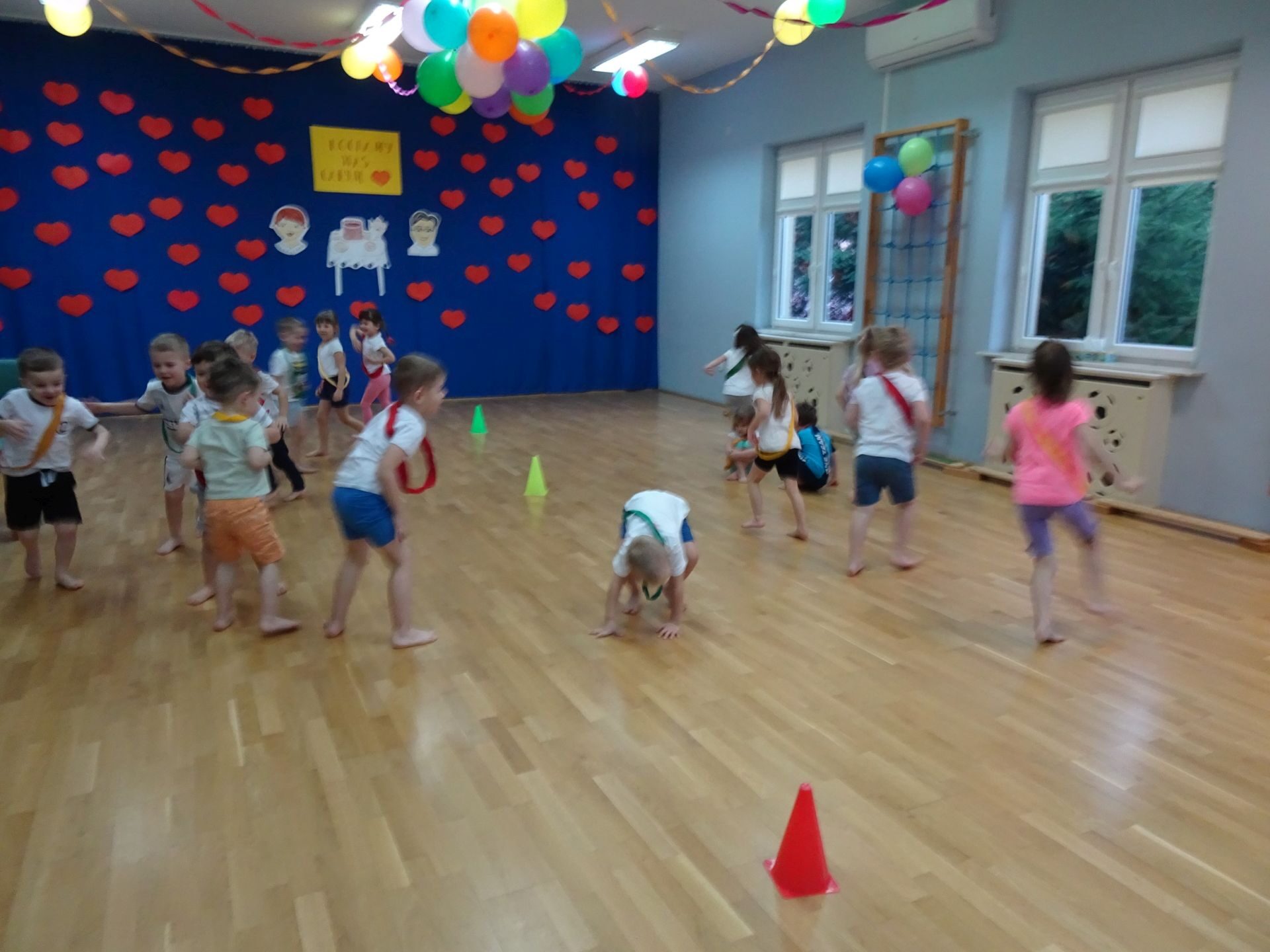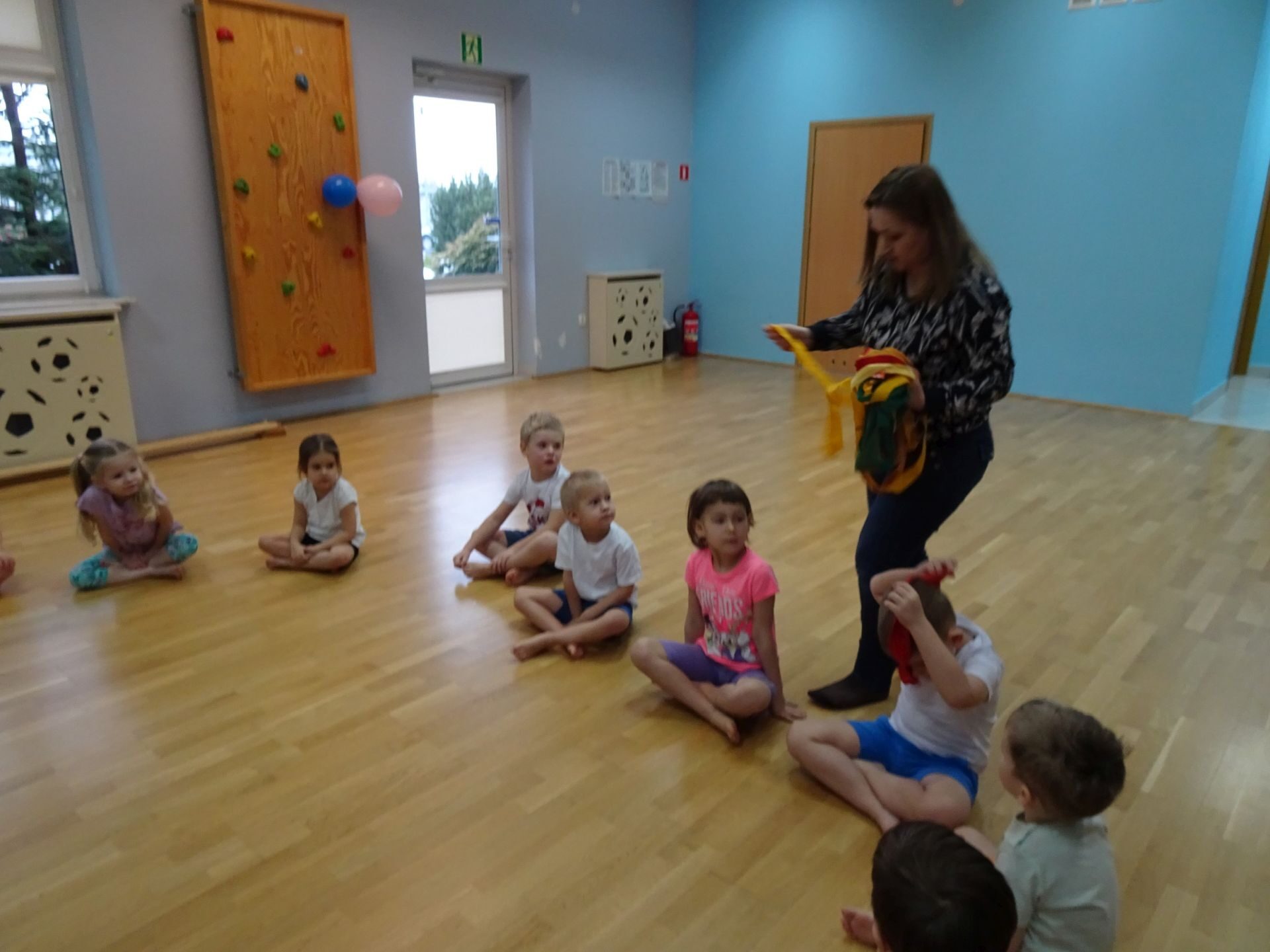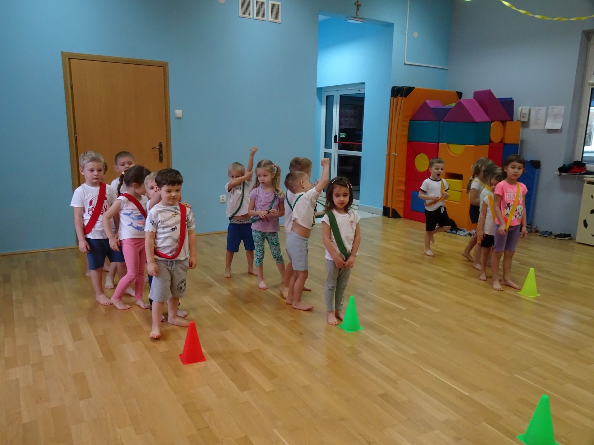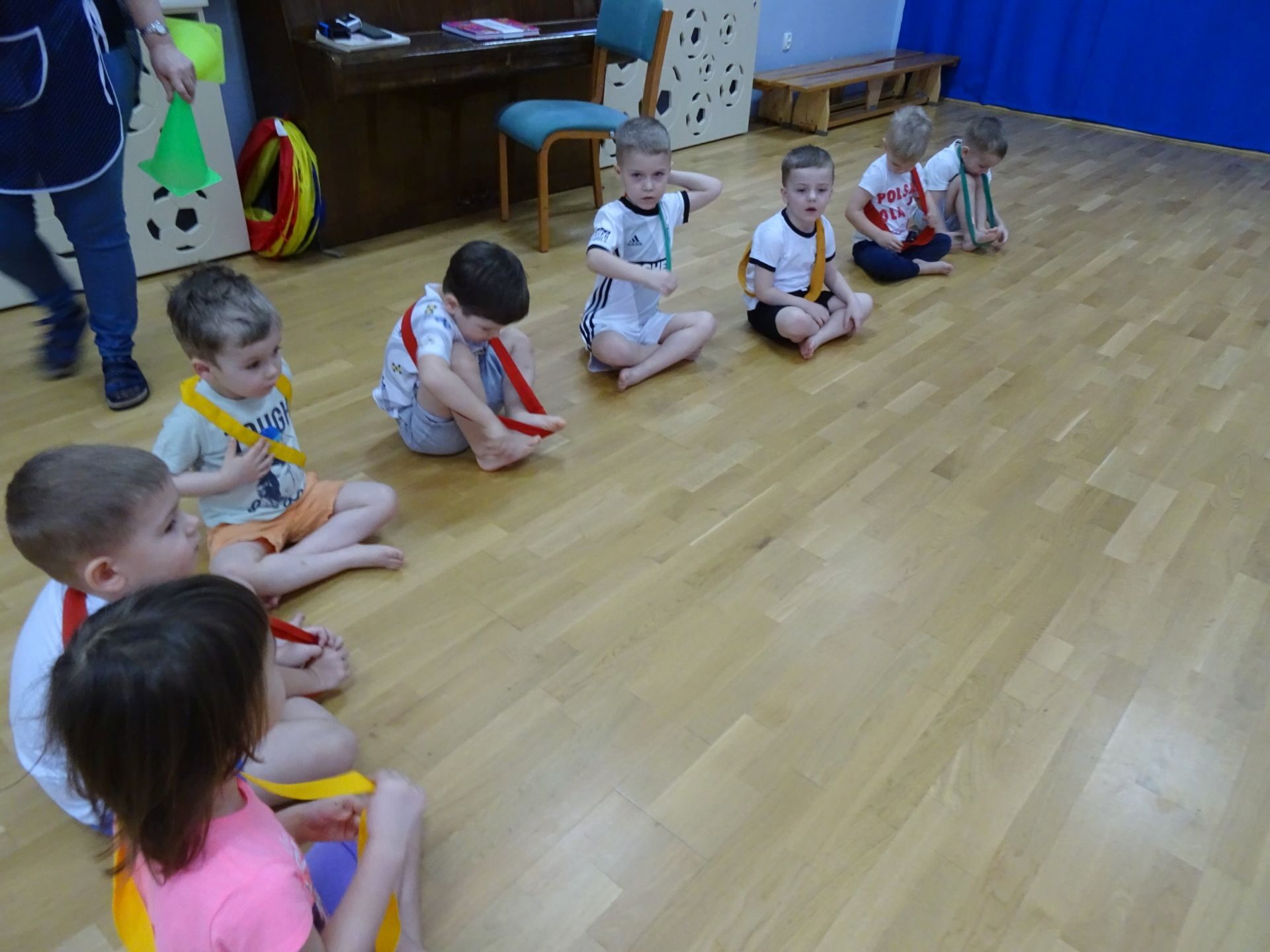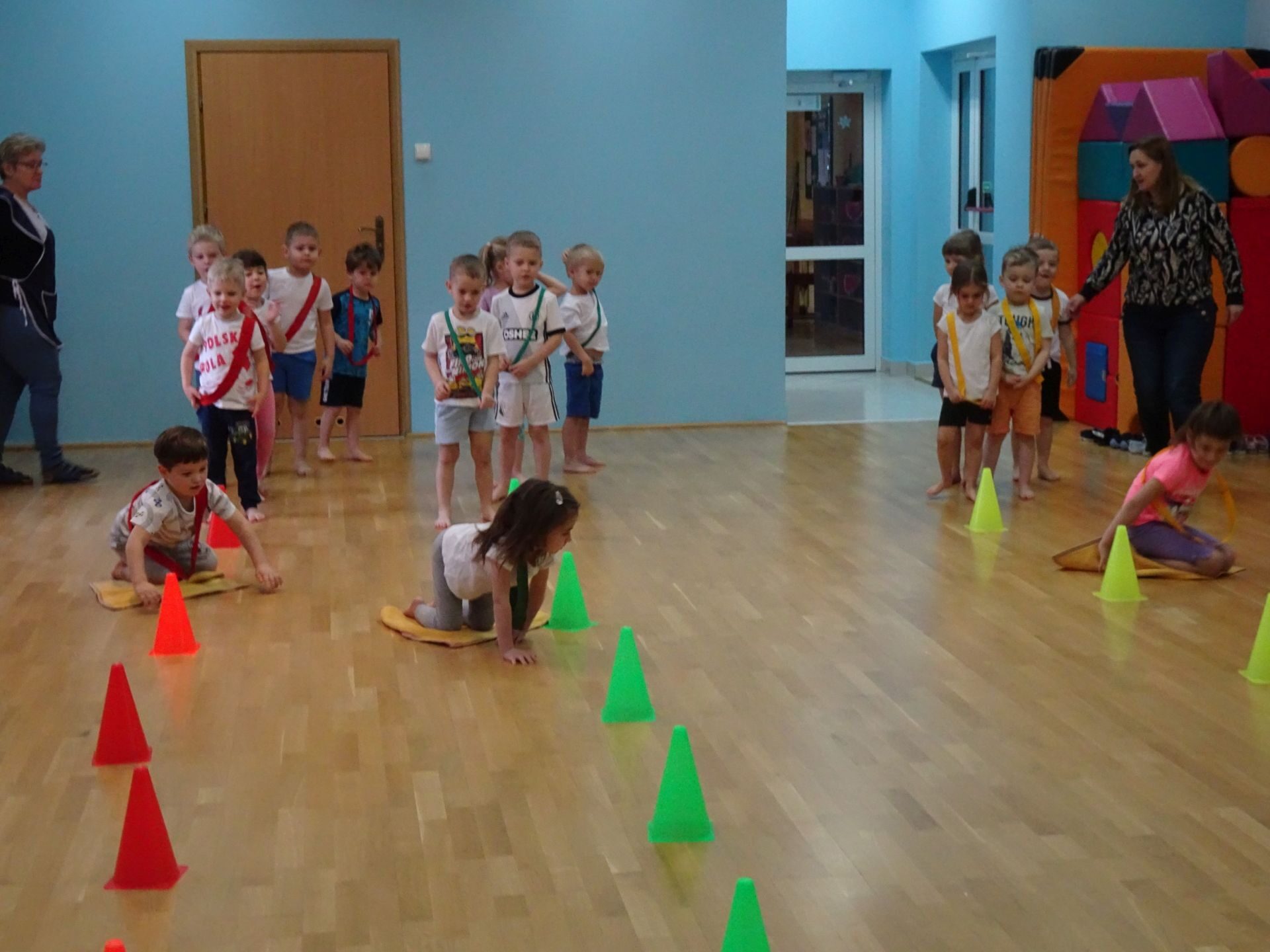 Dnia 2.02.2022 r. w środę dzieci 4-letnie wzięły udział w zajęciach sportowych. Przedszkolaki kształtowały prawidłową postawę ciała poprzez ćwiczenia gimnastyczne, wyrabiały płynność ruchów. Podczas ćwiczeń z wykorzystaniem różnorodnego sprzętu sportowego, dzieci wykonywały następujące zadania: jazda na kocyku slalomem między pachołkami, nakładanie i zbieranie kółek ringo na pachołki, skoki na jednej nodze, odnajdywanie koloru pachołka w kolorze szarfy, pokonywanie toru przeszkód: przejście po ławeczce , przejście przez tunel, pokonanie ścieżki sensorycznej, przeskakiwanie obunóż przez szarfy, wrzucanie woreczków do obręczy. Następnie dzieci leżąc na brzuchu naśladowały przeglądanie się w lusterku – wykorzystano krążki gimnastyczne. Dużo radości dzieciom sprawiła zabawa z chustą animacyjną.