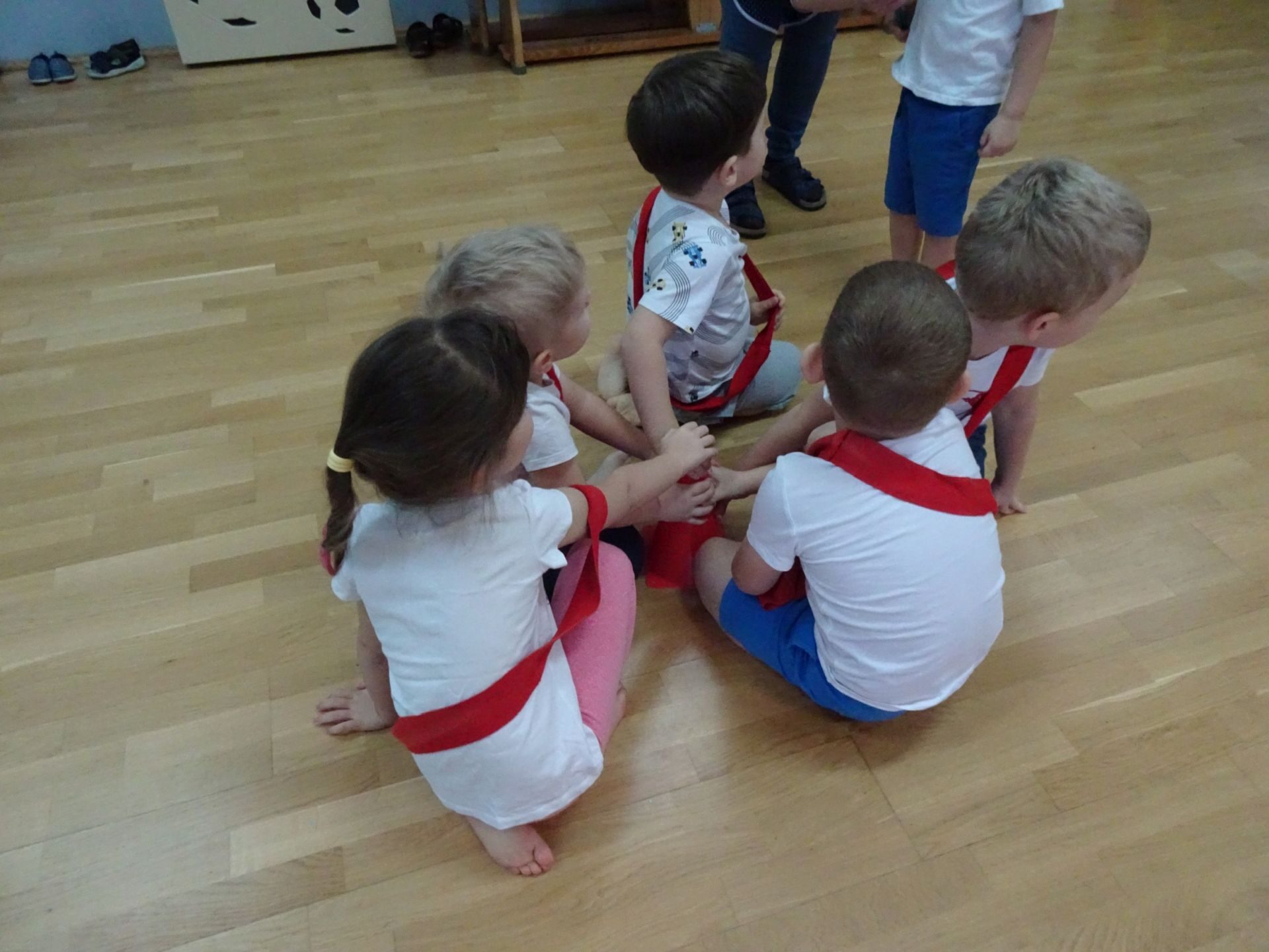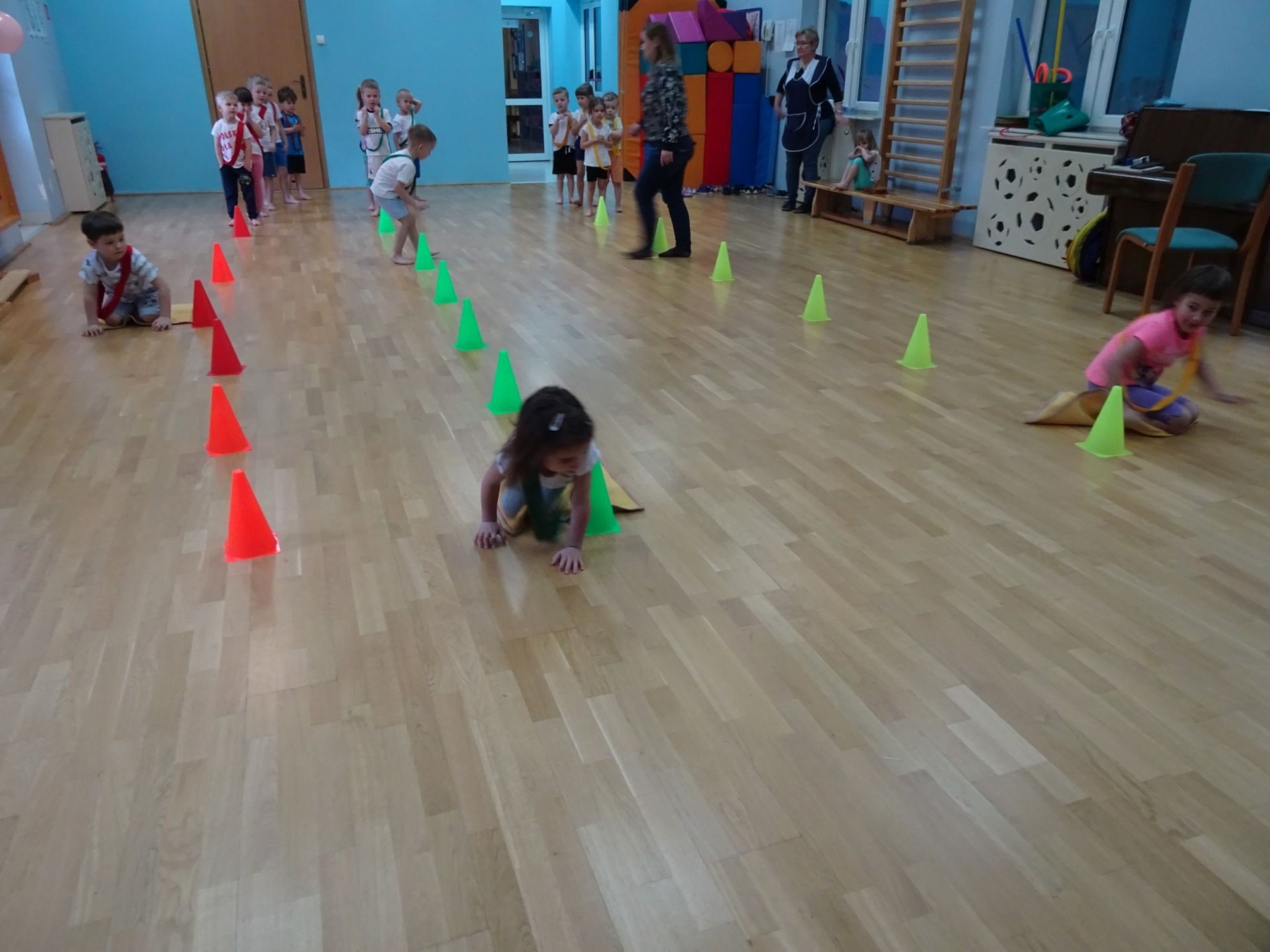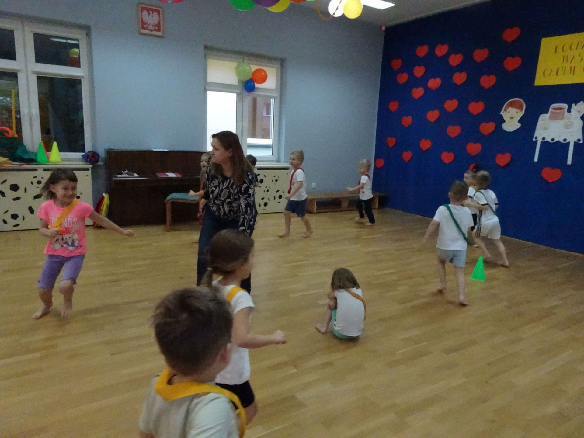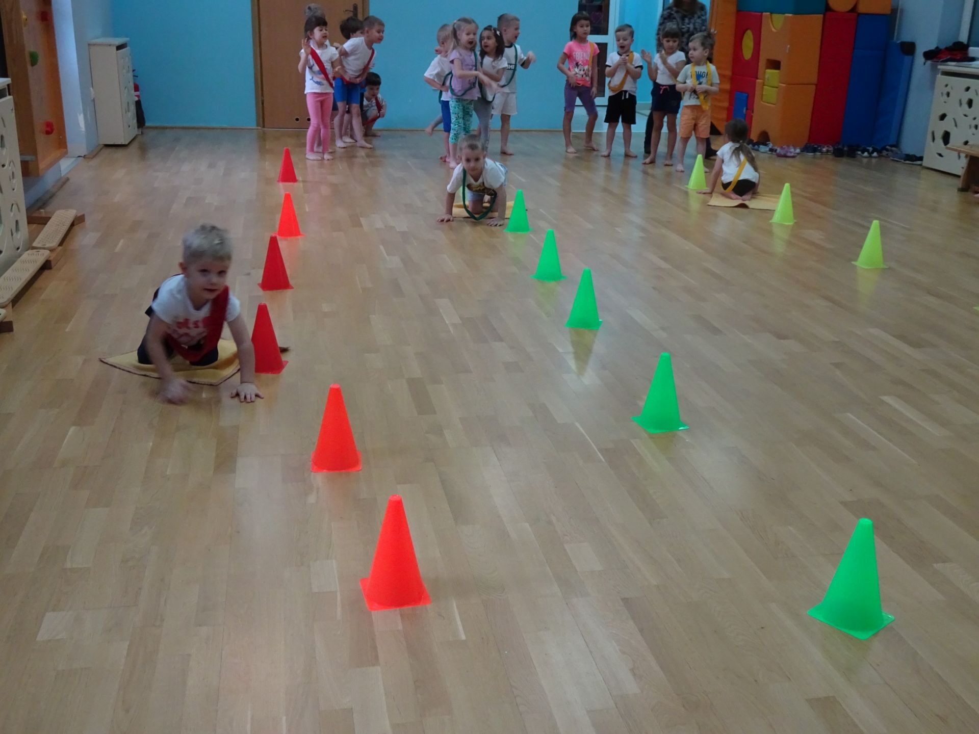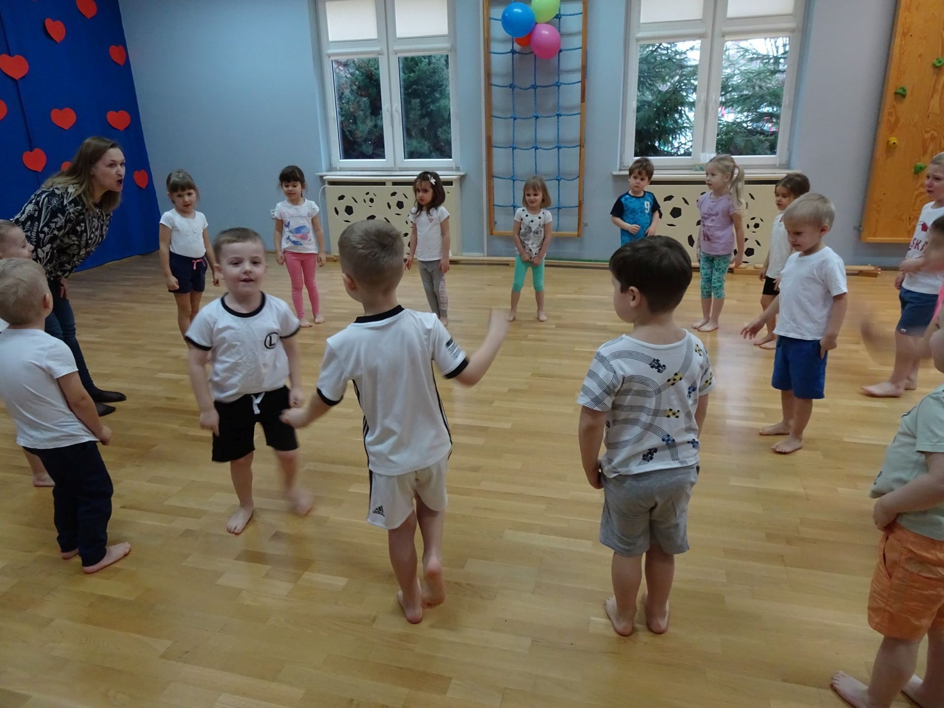Dnia 2.02.2022 r. w środę dzieci 4-letnie wzięły udział w zajęciach sportowych. Przedszkolaki kształtowały prawidłową postawę ciała poprzez ćwiczenia gimnastyczne, wyrabiały płynność ruchów. Podczas ćwiczeń z wykorzystaniem różnorodnego sprzętu sportowego, dzieci wykonywały następujące zadania: jazda na kocyku slalomem między pachołkami, nakładanie i zbieranie kółek ringo na pachołki, skoki na jednej nodze, odnajdywanie koloru pachołka w kolorze szarfy, pokonywanie toru przeszkód: przejście po ławeczce , przejście przez tunel, pokonanie ścieżki sensorycznej, przeskakiwanie obunóż przez szarfy, wrzucanie woreczków do obręczy. Następnie dzieci leżąc na brzuchu naśladowały przeglądanie się w lusterku – wykorzystano krążki gimnastyczne. Dużo radości dzieciom sprawiła zabawa z chustą animacyjną.