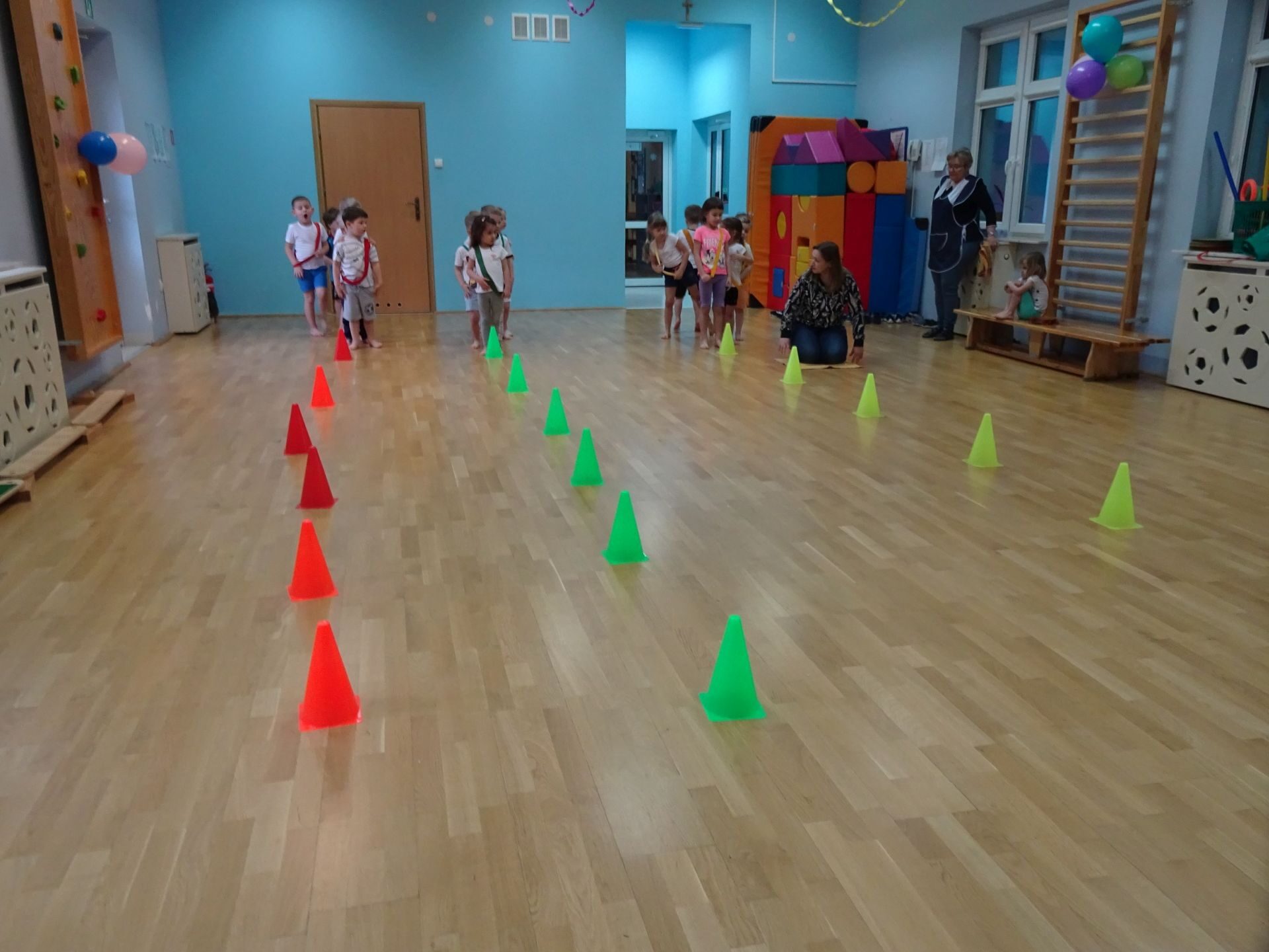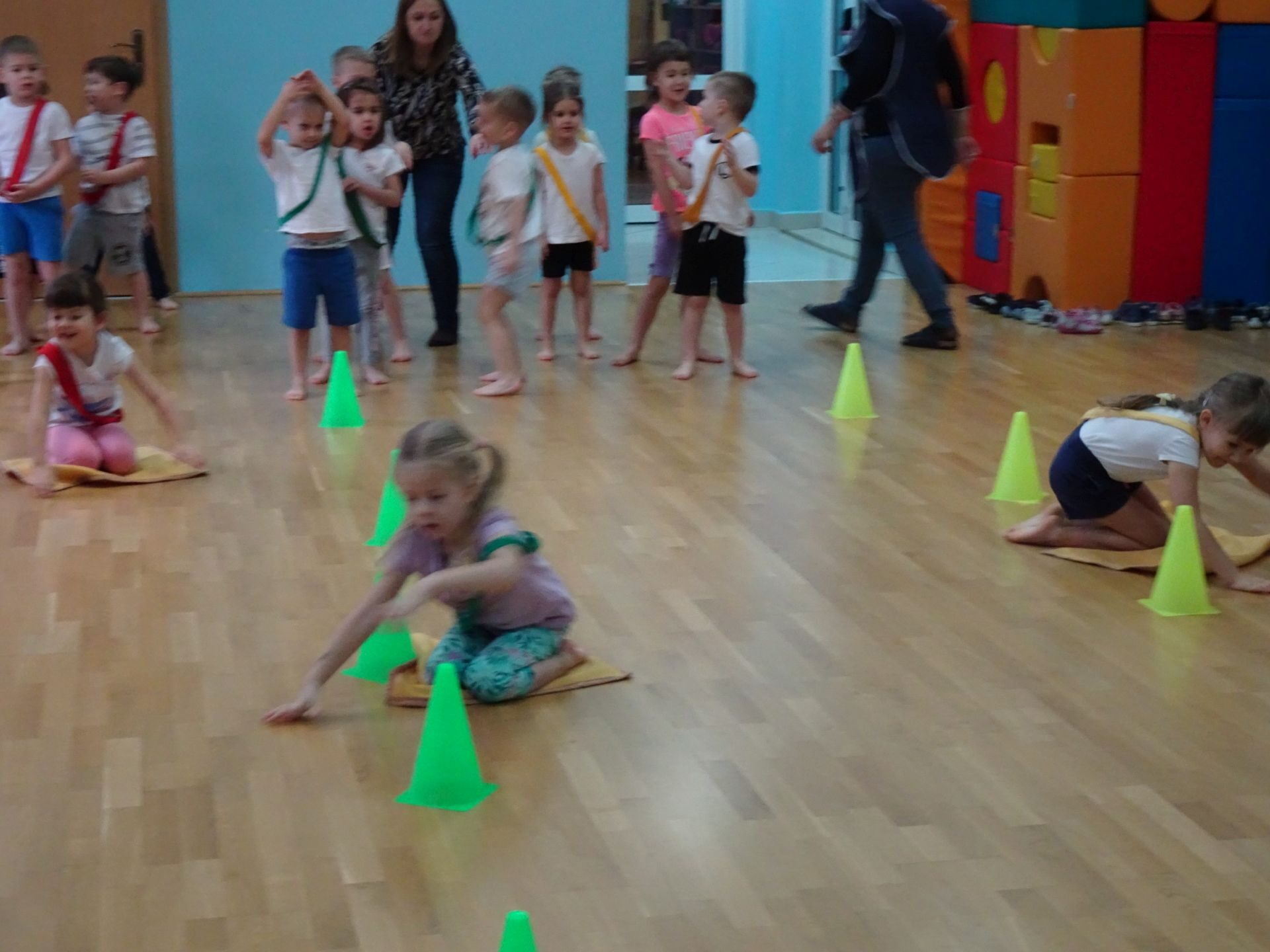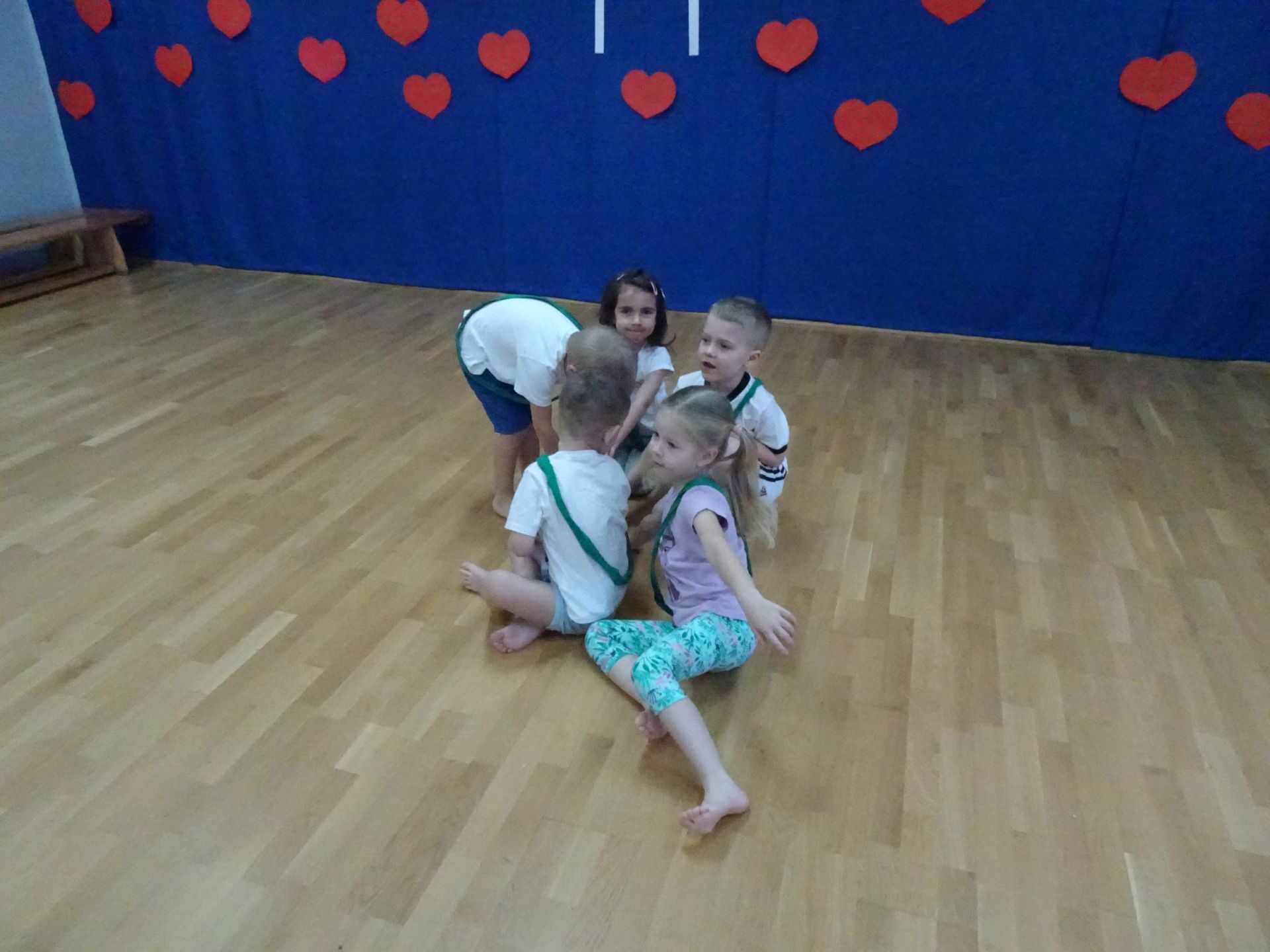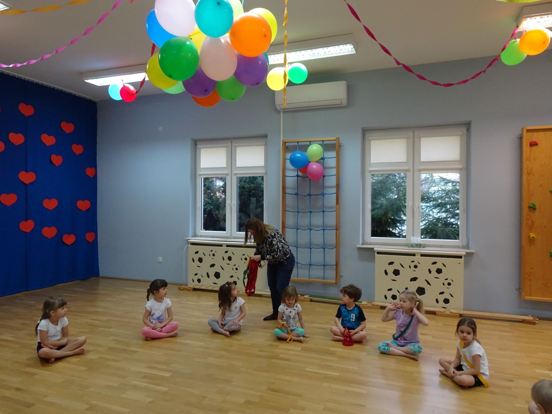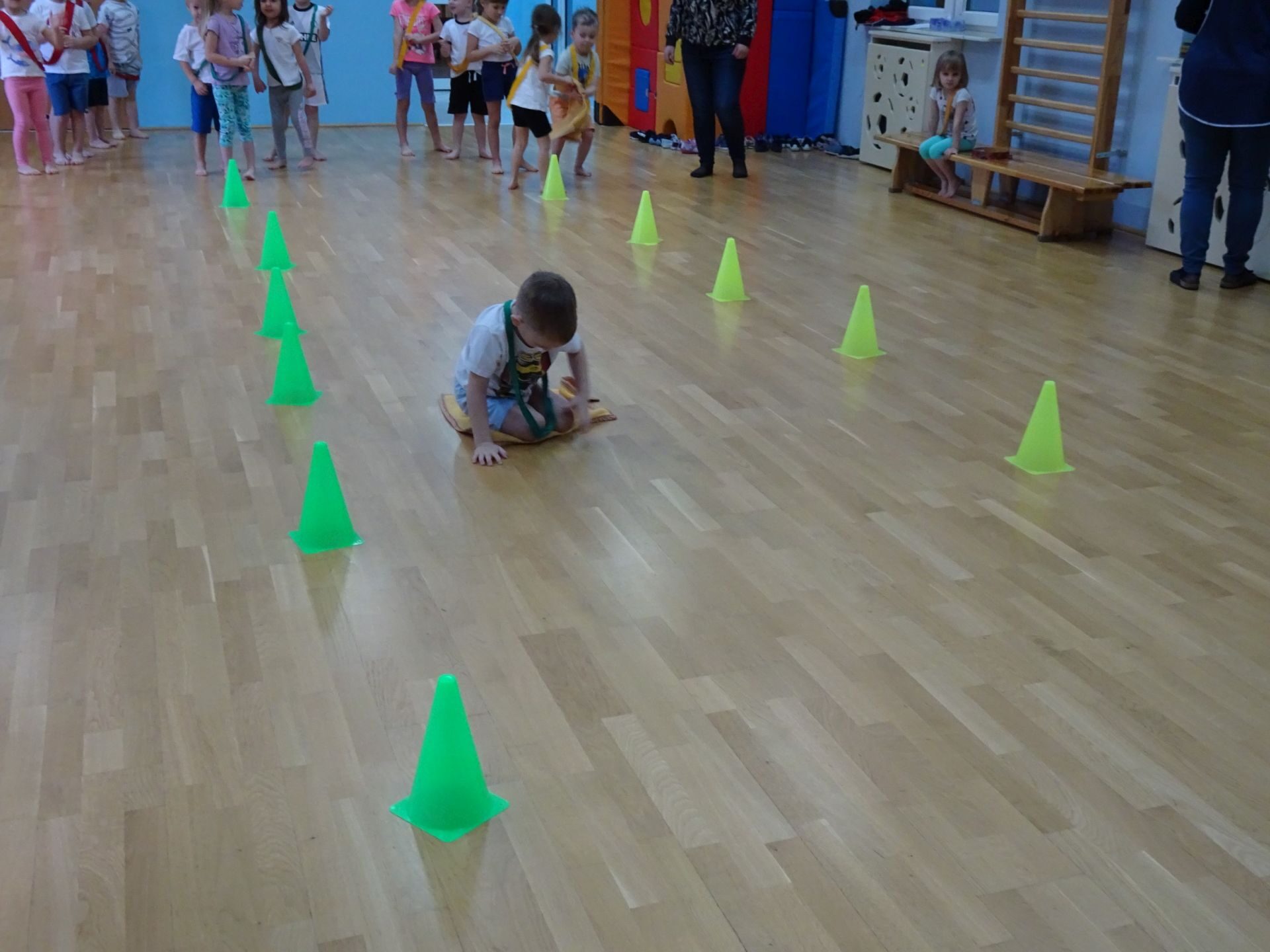 Dnia 2.02.2022 r. w środę dzieci 4-letnie wzięły udział w zajęciach sportowych. Przedszkolaki kształtowały prawidłową postawę ciała poprzez ćwiczenia gimnastyczne, wyrabiały płynność ruchów. Podczas ćwiczeń z wykorzystaniem różnorodnego sprzętu sportowego, dzieci wykonywały następujące zadania: jazda na kocyku slalomem między pachołkami, nakładanie i zbieranie kółek ringo na pachołki, skoki na jednej nodze, odnajdywanie koloru pachołka w kolorze szarfy, pokonywanie toru przeszkód: przejście po ławeczce , przejście przez tunel, pokonanie ścieżki sensorycznej, przeskakiwanie obunóż przez szarfy, wrzucanie woreczków do obręczy. Następnie dzieci leżąc na brzuchu naśladowały przeglądanie się w lusterku – wykorzystano krążki gimnastyczne. Dużo radości dzieciom sprawiła zabawa z chustą animacyjną.