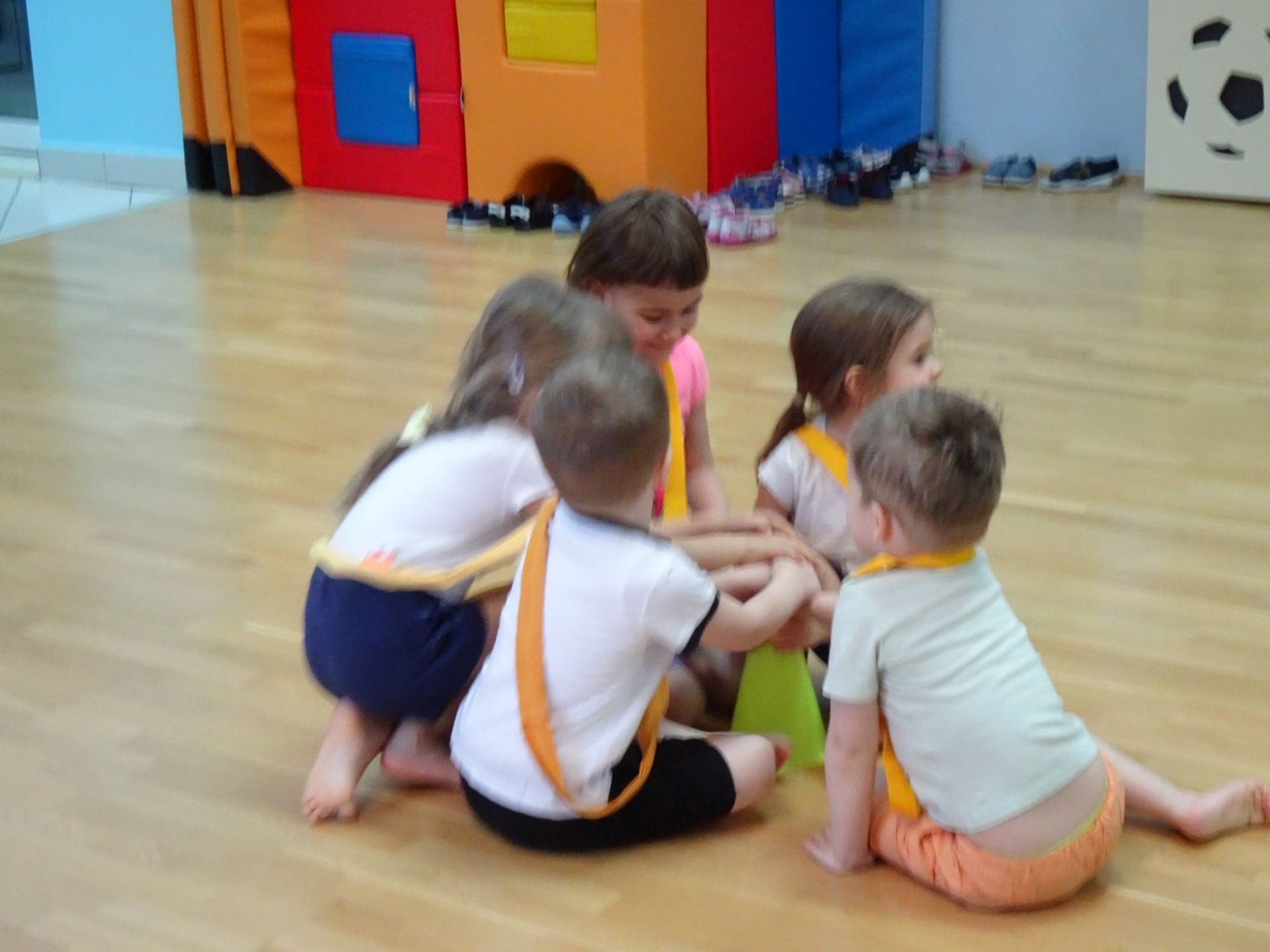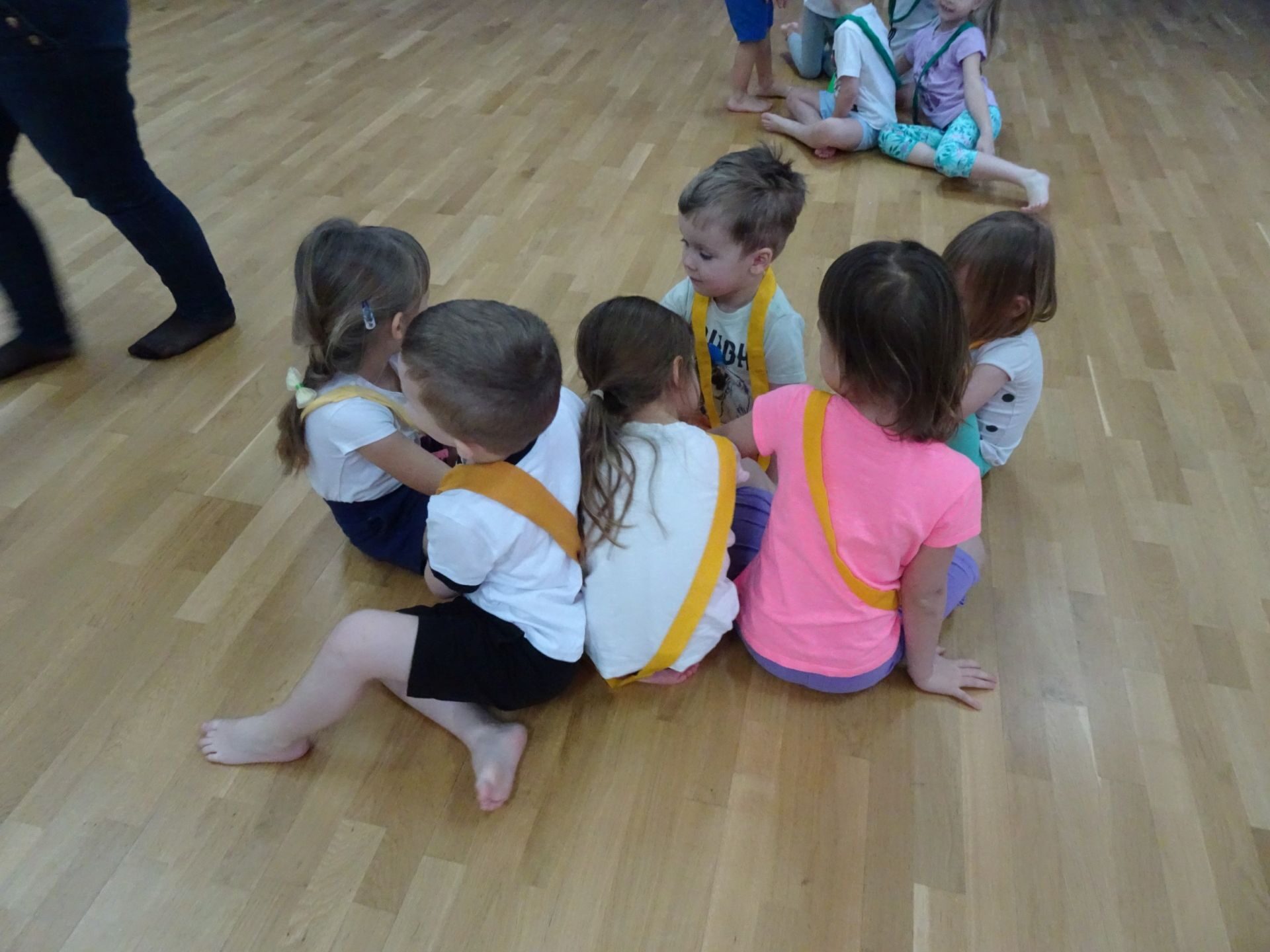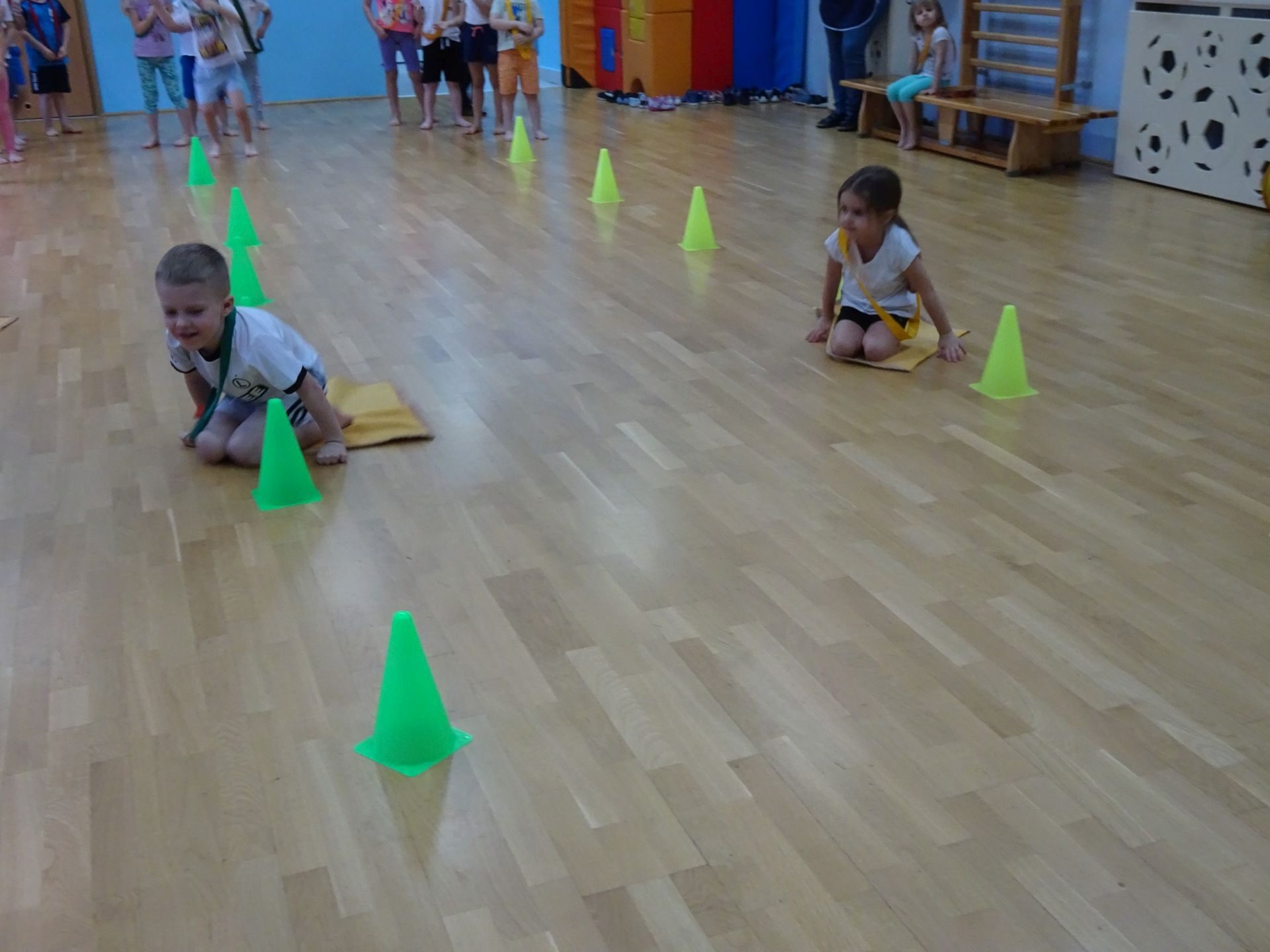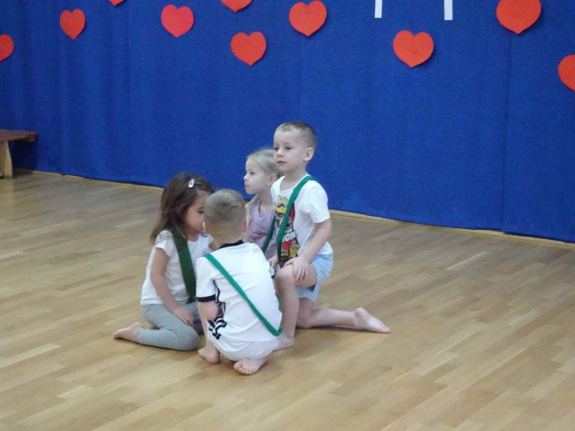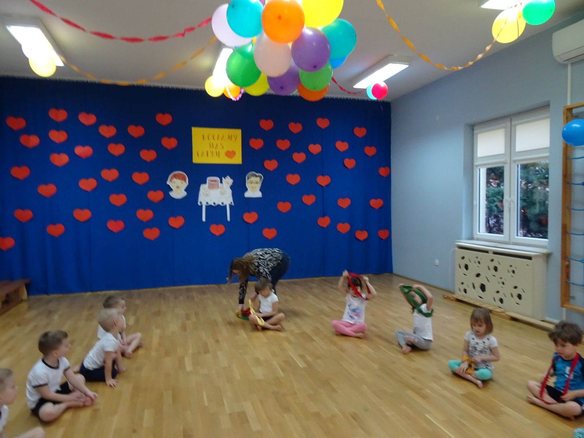 Dnia 2.02.2022 r. w środę dzieci 4-letnie wzięły udział w zajęciach sportowych. Przedszkolaki kształtowały prawidłową postawę ciała poprzez ćwiczenia gimnastyczne, wyrabiały płynność ruchów. Podczas ćwiczeń z wykorzystaniem różnorodnego sprzętu sportowego, dzieci wykonywały następujące zadania: jazda na kocyku slalomem między pachołkami, nakładanie i zbieranie kółek ringo na pachołki, skoki na jednej nodze, odnajdywanie koloru pachołka w kolorze szarfy, pokonywanie toru przeszkód: przejście po ławeczce , przejście przez tunel, pokonanie ścieżki sensorycznej, przeskakiwanie obunóż przez szarfy, wrzucanie woreczków do obręczy. Następnie dzieci leżąc na brzuchu naśladowały przeglądanie się w lusterku – wykorzystano krążki gimnastyczne. Dużo radości dzieciom sprawiła zabawa z chustą animacyjną.