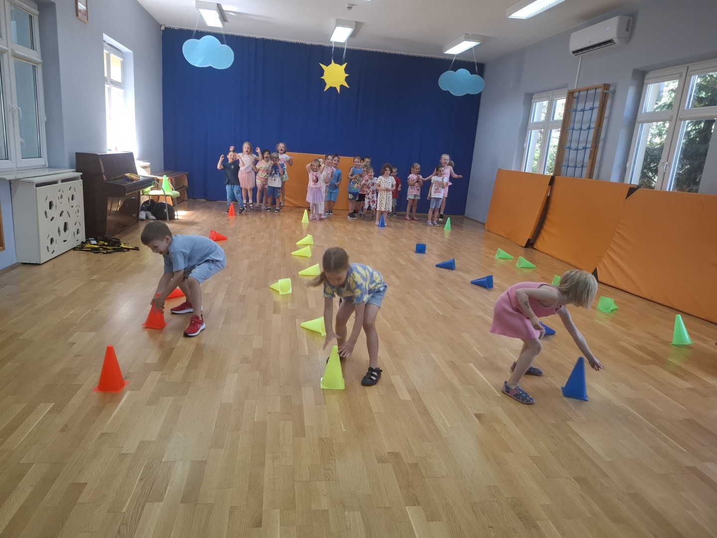 Od października w naszym przedszkolu odbywają się zajęcia sportowe prowadzone przez trenera FC Płochocin Damiana Dymkowskiego. Zajęcia ogólnorozwojowe charakteryzują się dużą dynamiką zmian form ruchowych, bazując na podstawowych ćwiczeniach gimnastycznych, zabawach ruchowych, elementach lekkoatletyki, dostosowanych do wieku uczestników i temperamentu dzieci, z wykorzystaniem wielorakich narzędzi sportowych i animacyjnych. Udział w zajęciach umożliwił dzieciom kształtowanie prawidłowej postawy przez zabawę, zwiększanie sprawności fizycznej i koordynacji ruchowej, kształtowanie zręczności i refleksu w tym rozwijanie naturalnych czynności ruchowych (np. skoki, biegi, przeskoki, rzuty itp.). Podczas zajęć dzieci miały również okazję zagrać w piłkę nożną.