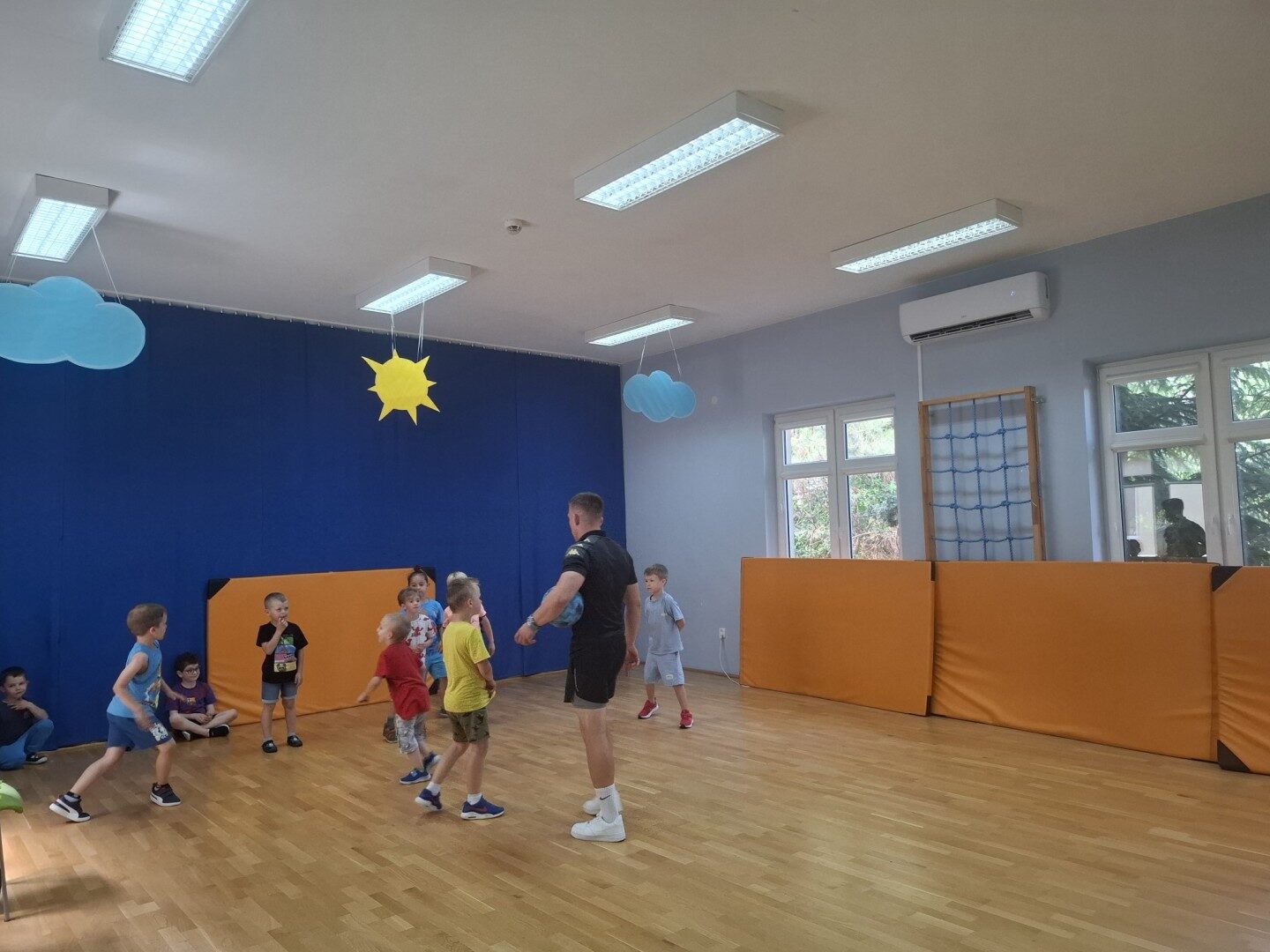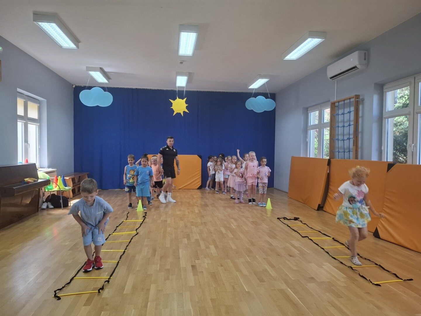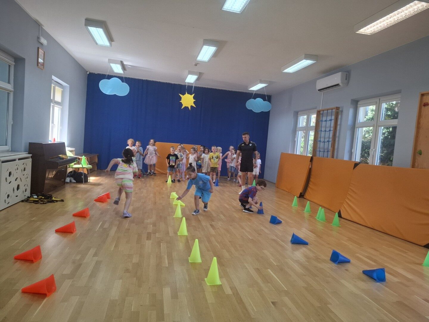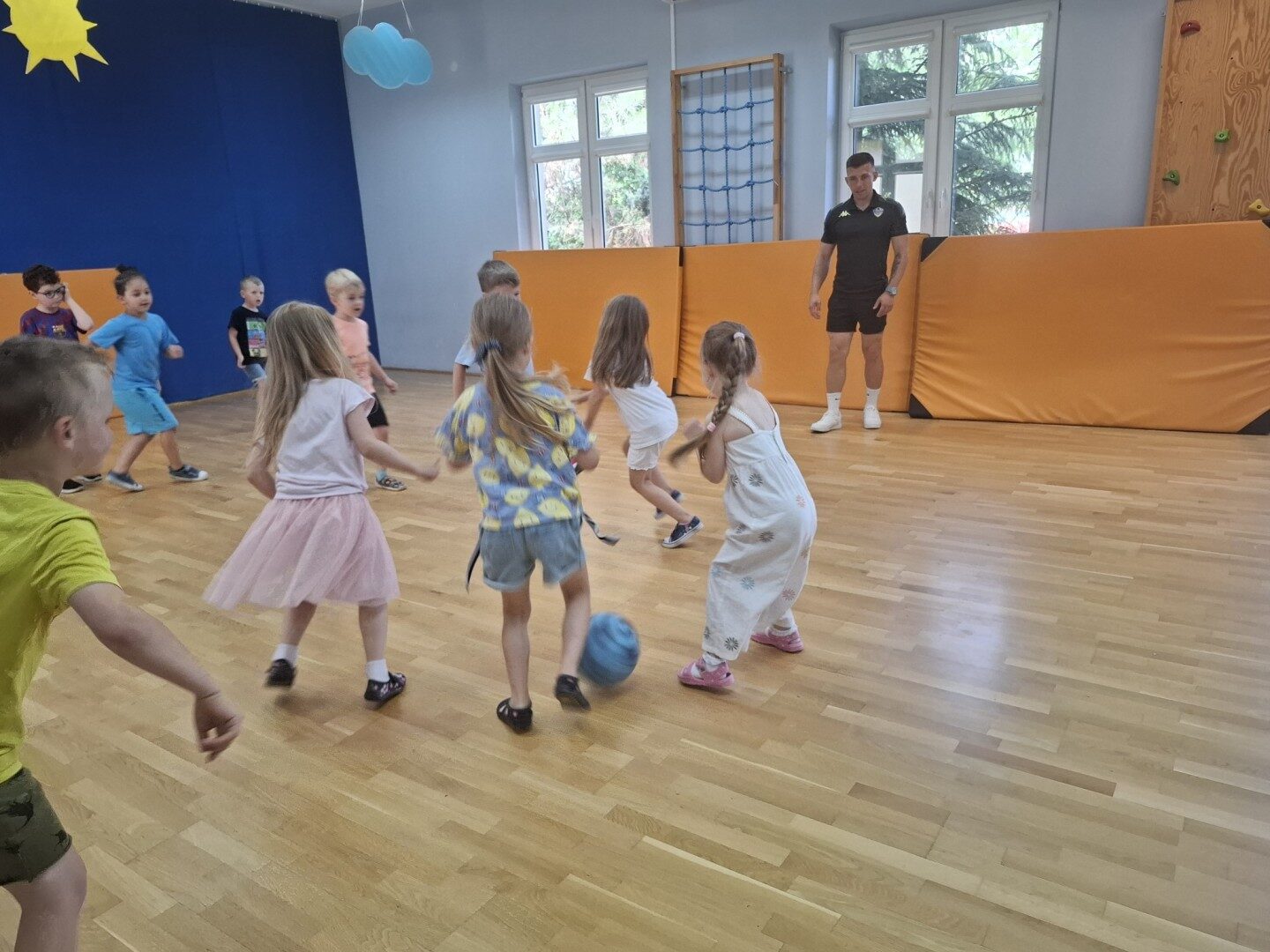 Od października w naszym przedszkolu odbywają się zajęcia sportowe prowadzone przez trenera FC Płochocin Damiana Dymkowskiego. Zajęcia ogólnorozwojowe charakteryzują się dużą dynamiką zmian form ruchowych, bazując na podstawowych ćwiczeniach gimnastycznych, zabawach ruchowych, elementach lekkoatletyki, dostosowanych do wieku uczestników i temperamentu dzieci, z wykorzystaniem wielorakich narzędzi sportowych i animacyjnych. Udział w zajęciach umożliwił dzieciom kształtowanie prawidłowej postawy przez zabawę, zwiększanie sprawności fizycznej i koordynacji ruchowej, kształtowanie zręczności i refleksu w tym rozwijanie naturalnych czynności ruchowych (np. skoki, biegi, przeskoki, rzuty itp.). Podczas zajęć dzieci miały również okazję zagrać w piłkę nożną.