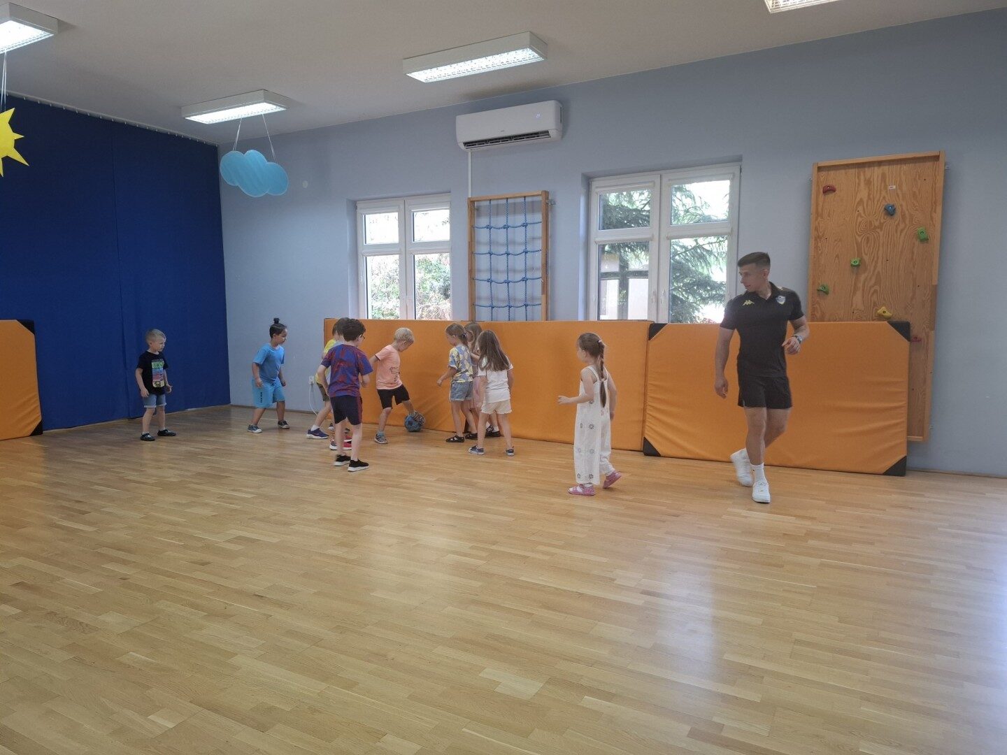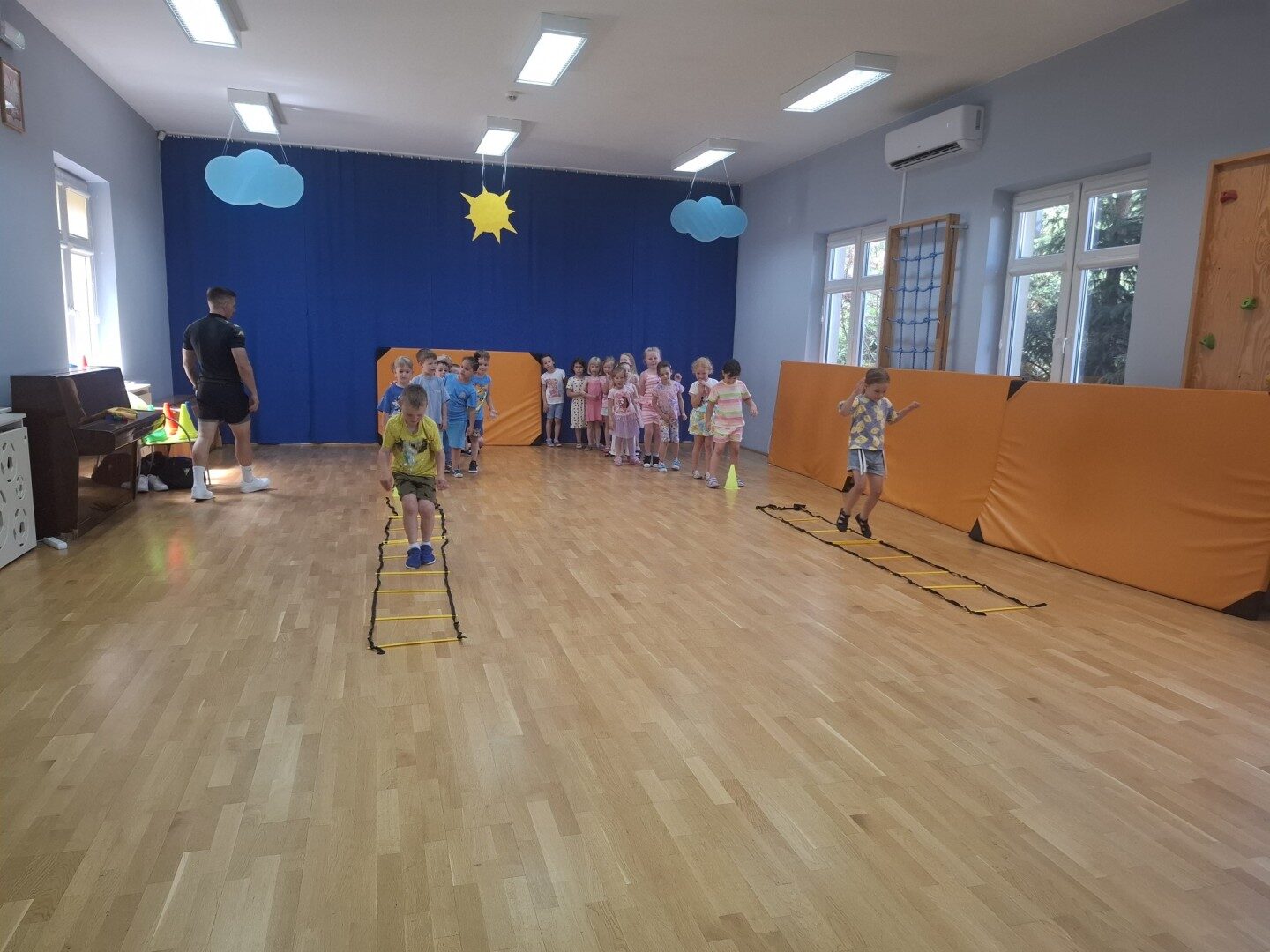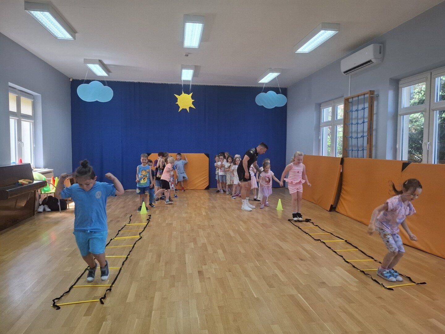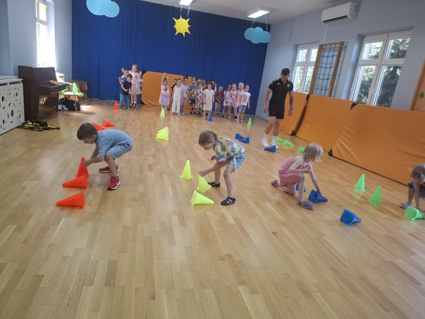Od października w naszym przedszkolu odbywają się zajęcia sportowe prowadzone przez trenera FC Płochocin Damiana Dymkowskiego. Zajęcia ogólnorozwojowe charakteryzują się dużą dynamiką zmian form ruchowych, bazując na podstawowych ćwiczeniach gimnastycznych, zabawach ruchowych, elementach lekkoatletyki, dostosowanych do wieku uczestników i temperamentu dzieci, z wykorzystaniem wielorakich narzędzi sportowych i animacyjnych. Udział w zajęciach umożliwił dzieciom kształtowanie prawidłowej postawy przez zabawę, zwiększanie sprawności fizycznej i koordynacji ruchowej, kształtowanie zręczności i refleksu w tym rozwijanie naturalnych czynności ruchowych (np. skoki, biegi, przeskoki, rzuty itp.). Podczas zajęć dzieci miały również okazję zagrać w piłkę nożną.