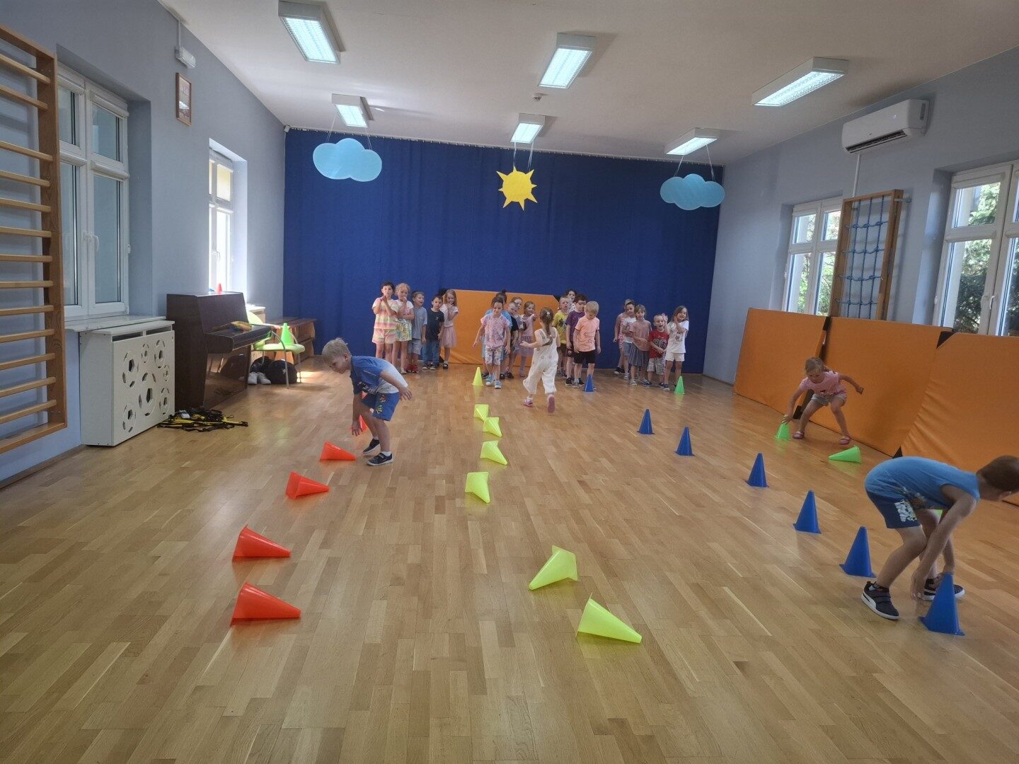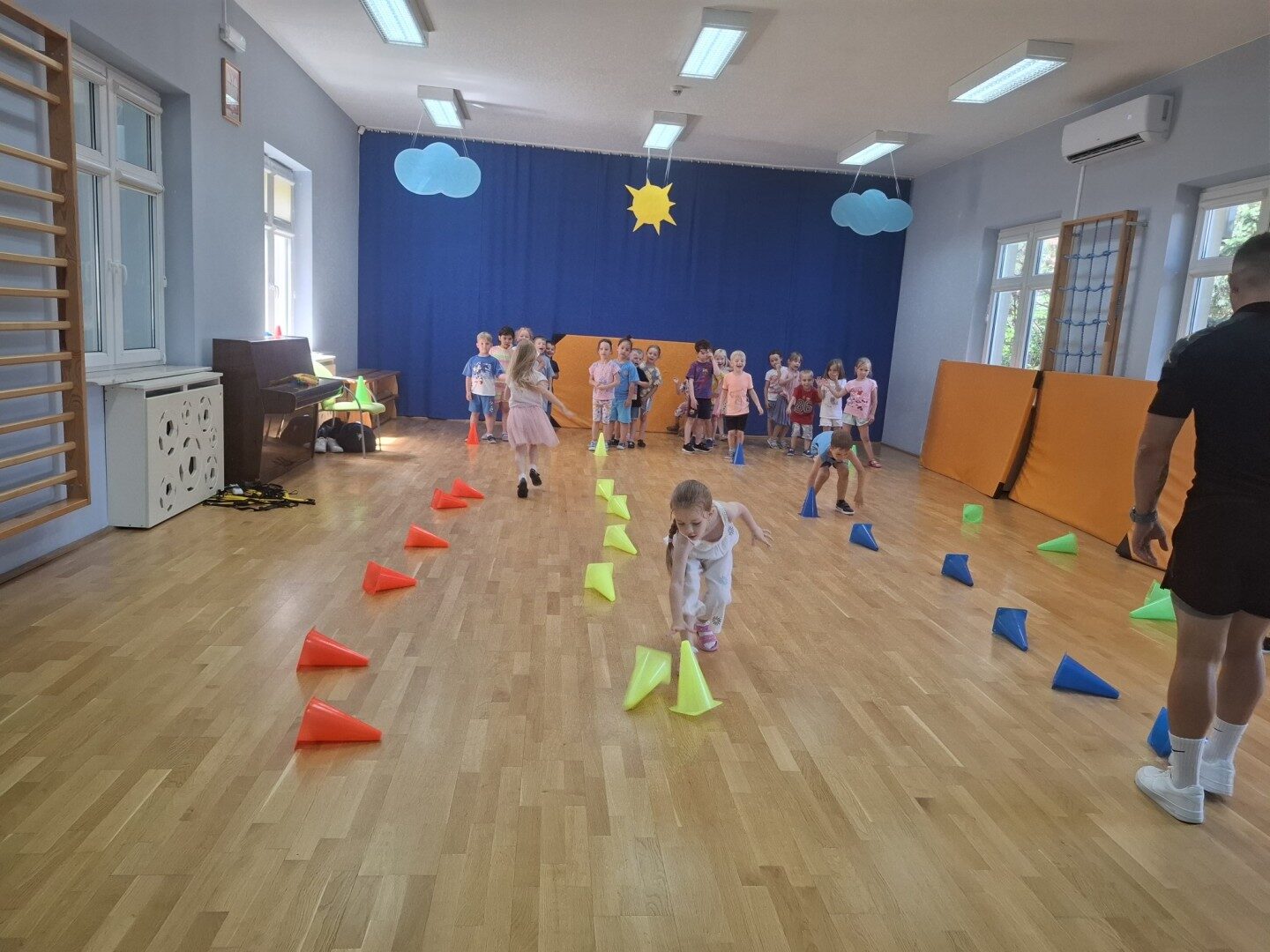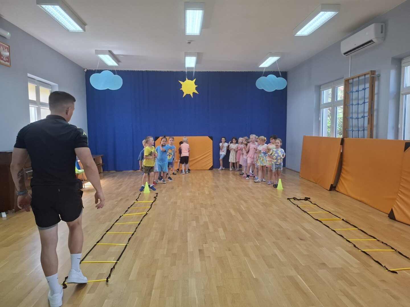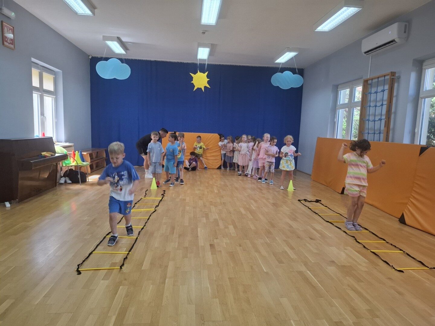 Od października w naszym przedszkolu odbywają się zajęcia sportowe prowadzone przez trenera FC Płochocin Damiana Dymkowskiego. Zajęcia ogólnorozwojowe charakteryzują się dużą dynamiką zmian form ruchowych, bazując na podstawowych ćwiczeniach gimnastycznych, zabawach ruchowych, elementach lekkoatletyki, dostosowanych do wieku uczestników i temperamentu dzieci, z wykorzystaniem wielorakich narzędzi sportowych i animacyjnych. Udział w zajęciach umożliwił dzieciom kształtowanie prawidłowej postawy przez zabawę, zwiększanie sprawności fizycznej i koordynacji ruchowej, kształtowanie zręczności i refleksu w tym rozwijanie naturalnych czynności ruchowych (np. skoki, biegi, przeskoki, rzuty itp.). Podczas zajęć dzieci miały również okazję zagrać w piłkę nożną.
