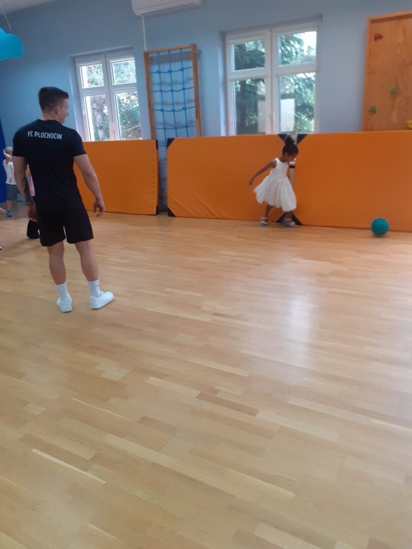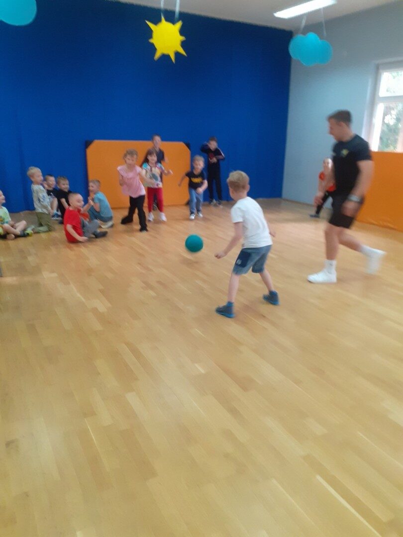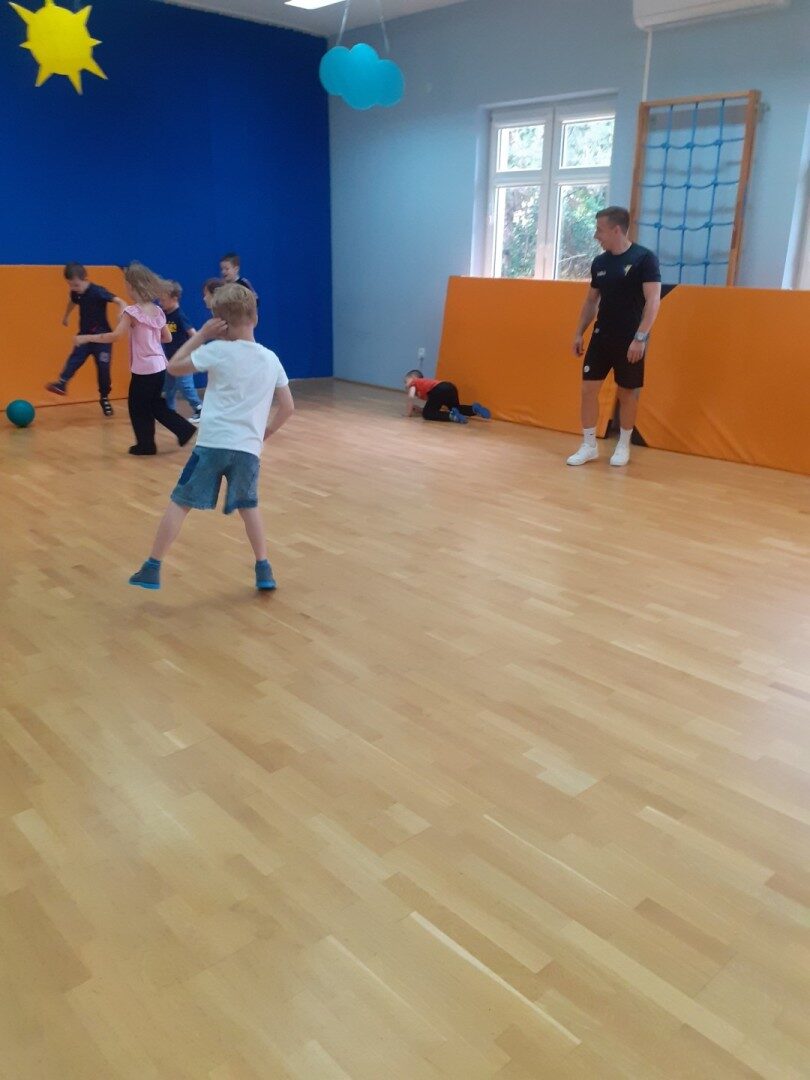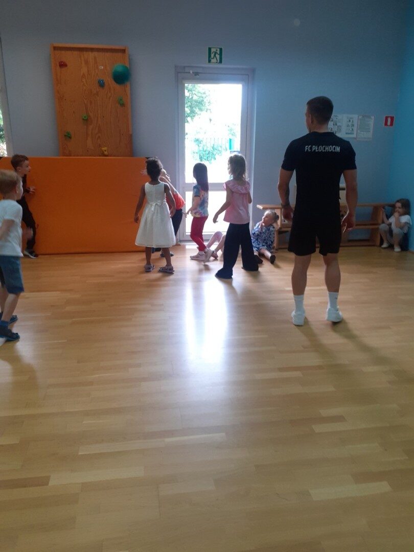 Od października w naszym przedszkolu odbywają się zajęcia sportowe prowadzone przez trenera FC Płochocin Damiana Dymkowskiego. Zajęcia ogólnorozwojowe charakteryzują się dużą dynamiką zmian form ruchowych, bazując na podstawowych ćwiczeniach gimnastycznych, zabawach ruchowych, elementach lekkoatletyki, dostosowanych do wieku uczestników i temperamentu dzieci, z wykorzystaniem wielorakich narzędzi sportowych i animacyjnych. Udział w zajęciach umożliwił dzieciom kształtowanie prawidłowej postawy przez zabawę, zwiększanie sprawności fizycznej i koordynacji ruchowej, kształtowanie zręczności i refleksu w tym rozwijanie naturalnych czynności ruchowych (np. skoki, biegi, przeskoki, rzuty itp.). Podczas zajęć dzieci miały również okazję zagrać w piłkę nożną.