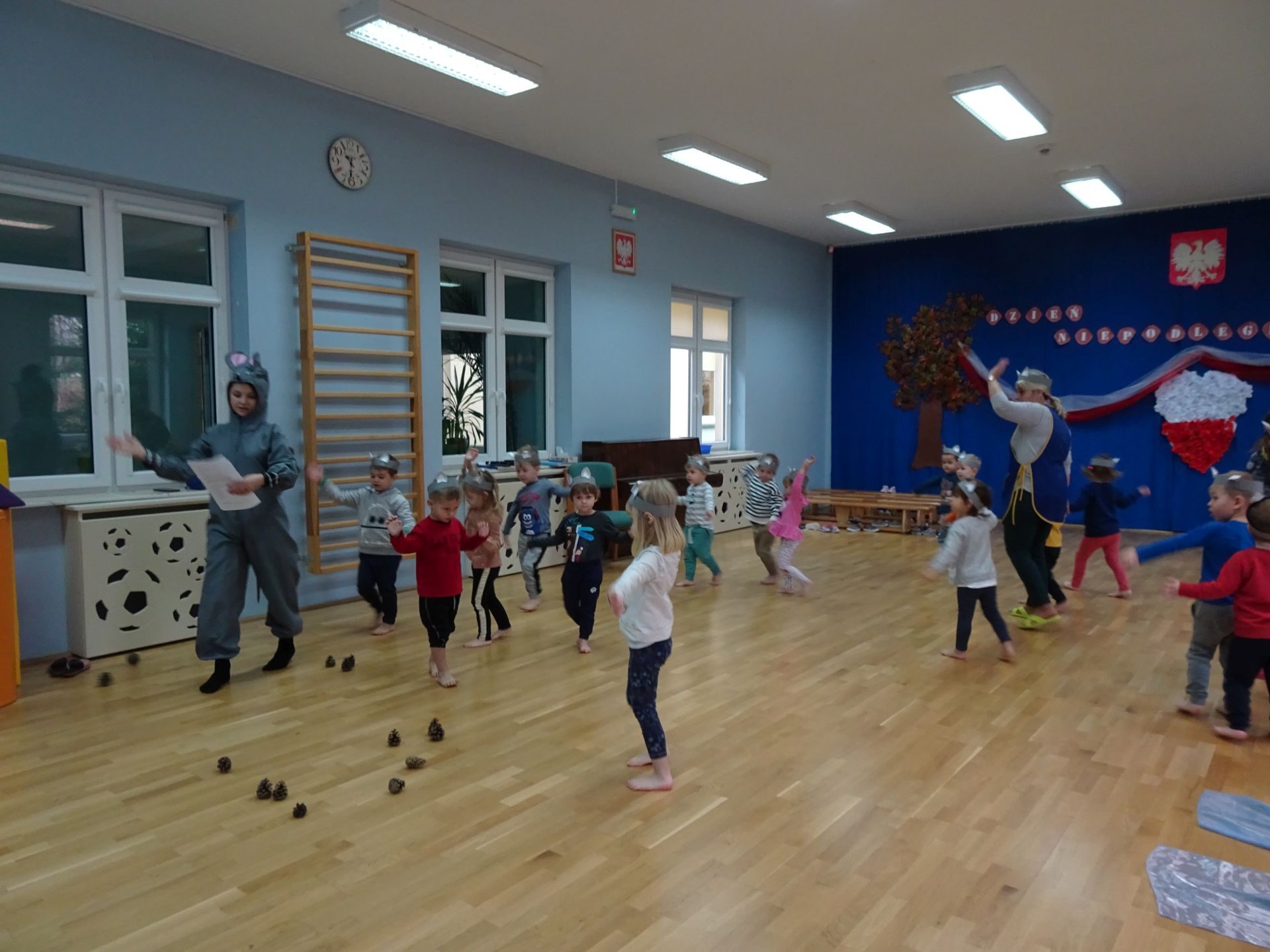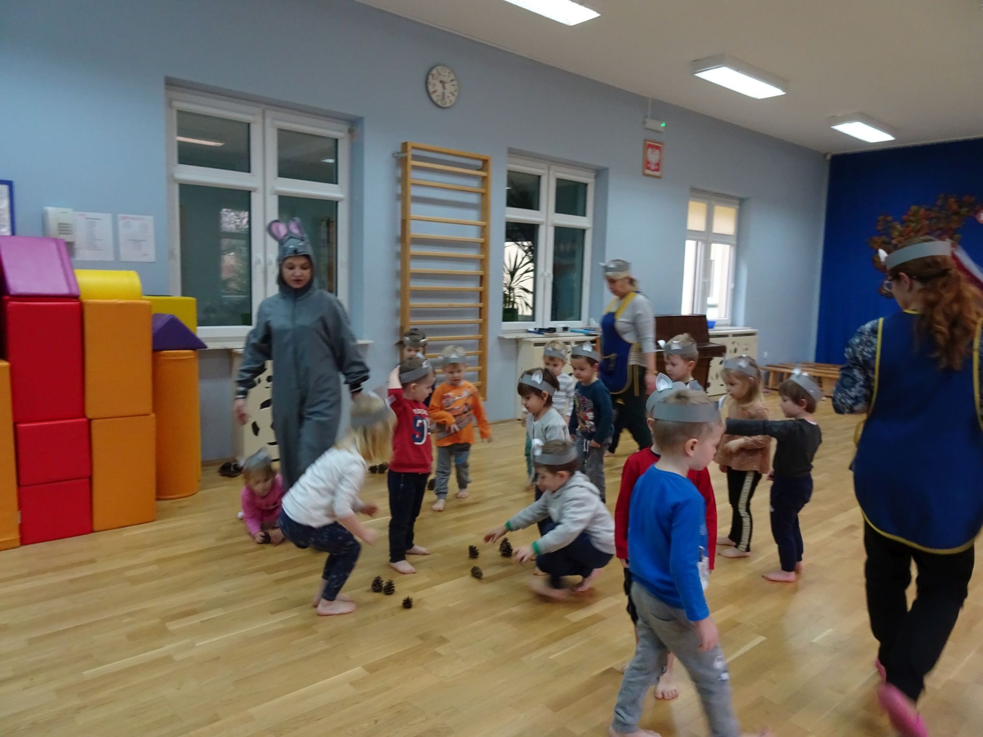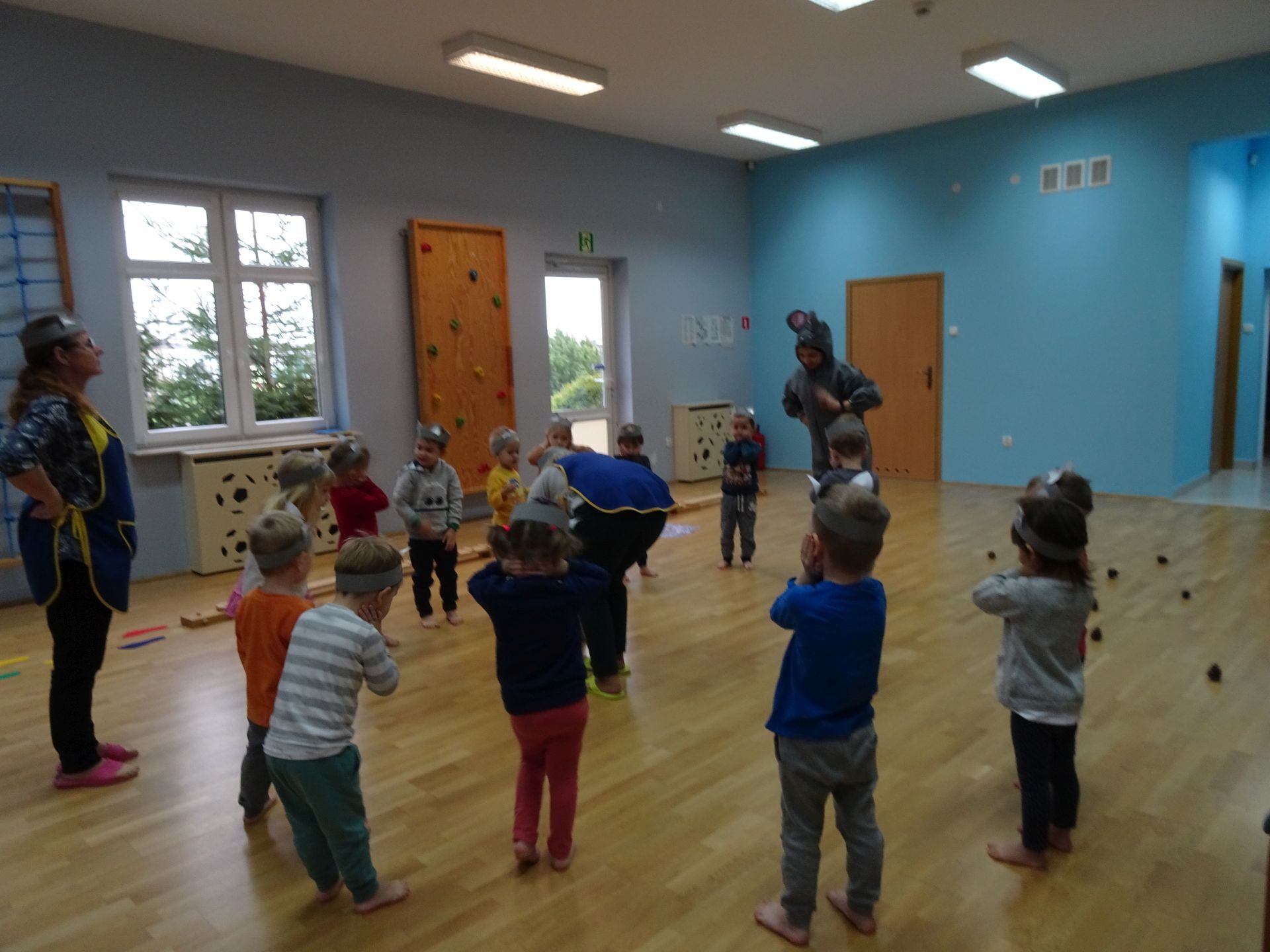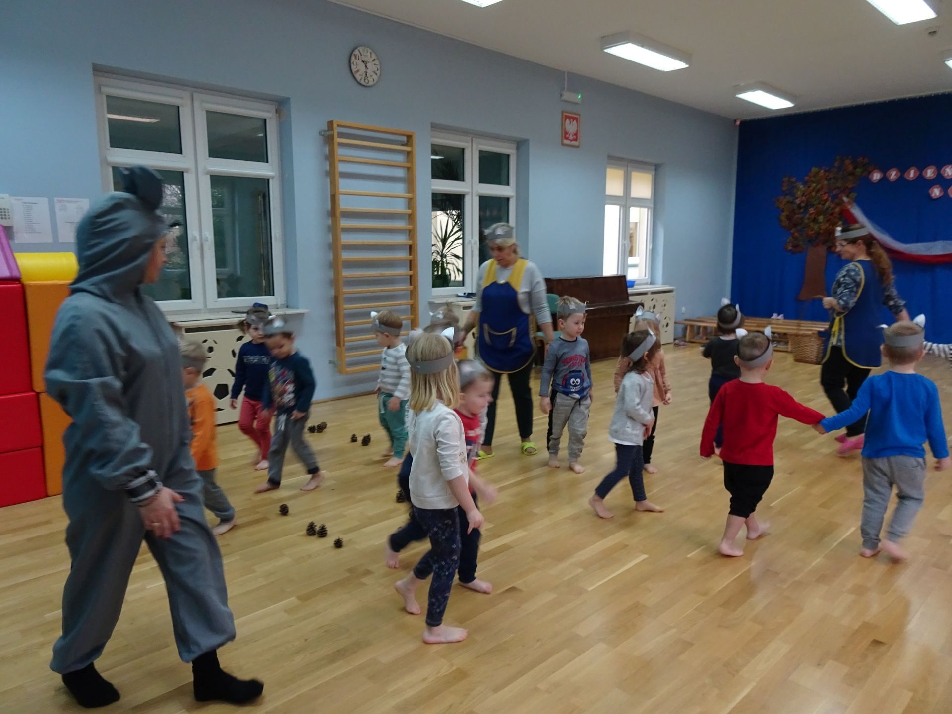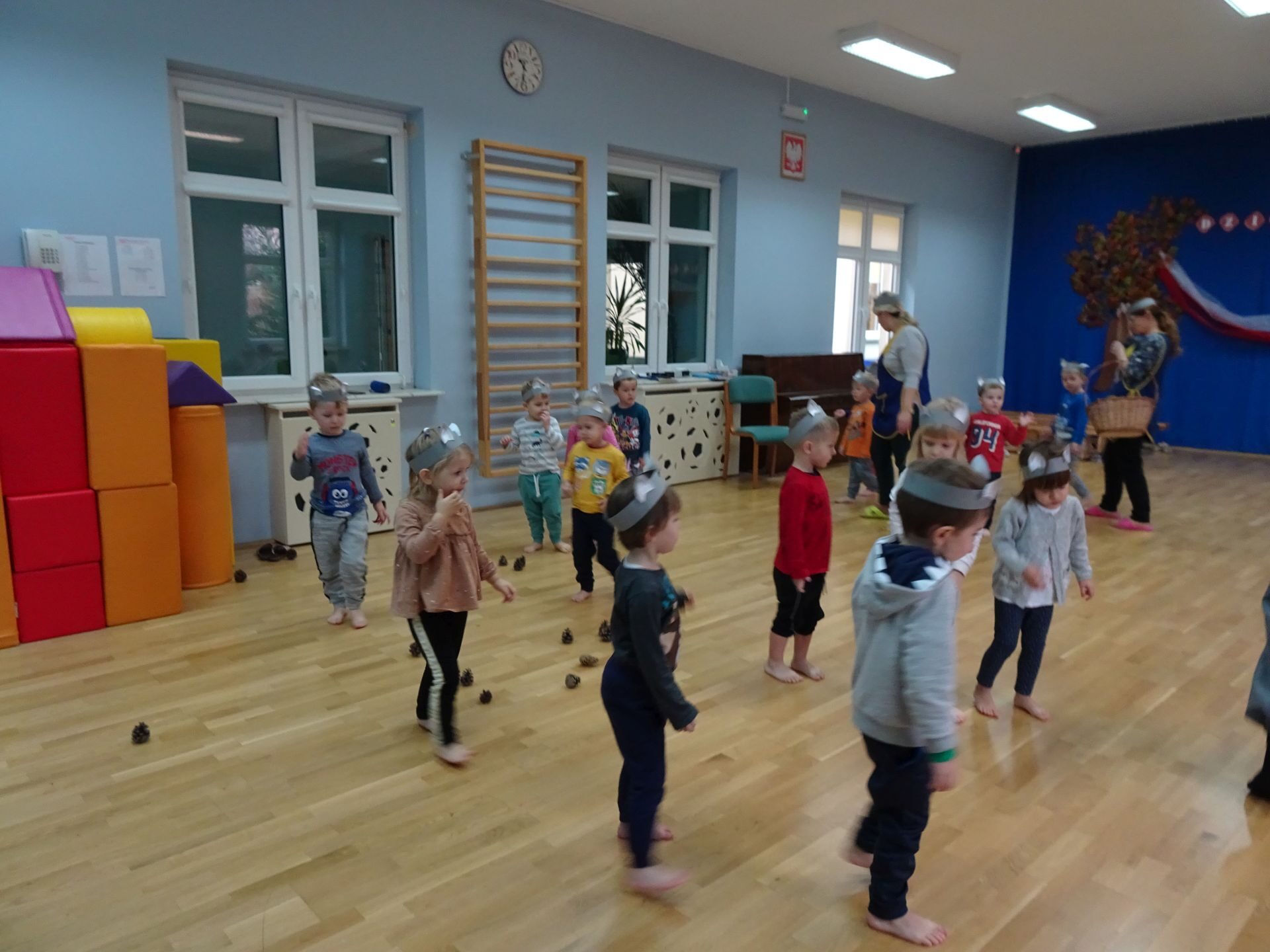 Dnia 30.11.2020 w grupie II „Kotki” odbyły się zajęcia ruchowe w Sali rekreacyjnej prowadzone przez nauczycielkę Katarzynę Kober. Motywem przewodnim zajęć była „Wizyta u Myszki Jadzi”. Dzieci rozgrzewały się przy piosence „Gimnastyka to zabawa”, następnie dzieci przy muzyce relaksacyjnej „Dźwięki lasu”  wyruszyły w „drogę przez las” szukając domku Myszki. Pod drodze dzieci pokonywały przeszkody: zbierały kasztany i szyszki, wąchały kwiaty, naśladowały szum drzew, omijały norki. Dzieci pokonywały ścieżkę sensoryczną, przechodziły pod przeszkodą z kształtek gimnastycznych i wskakiwały do szarfy, którą przekładały od stóp do głowy. Dzieciom zabawa bardzo się podobała.