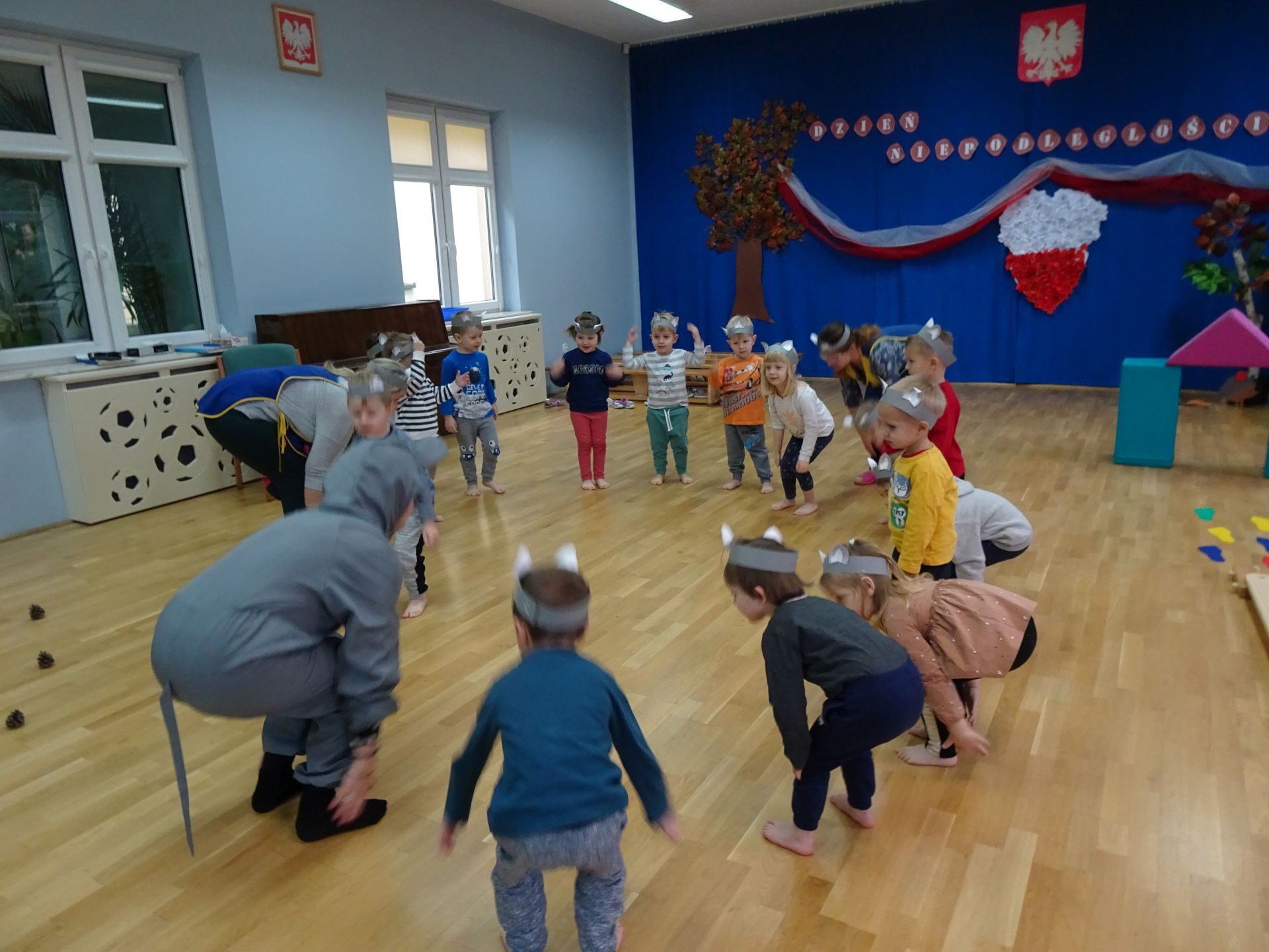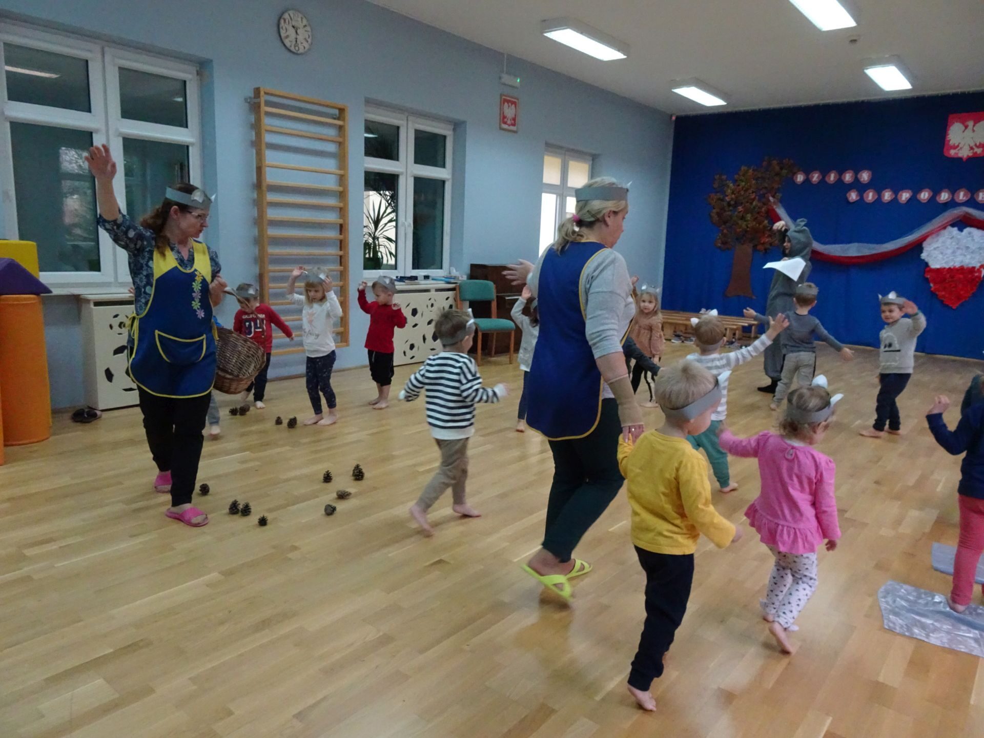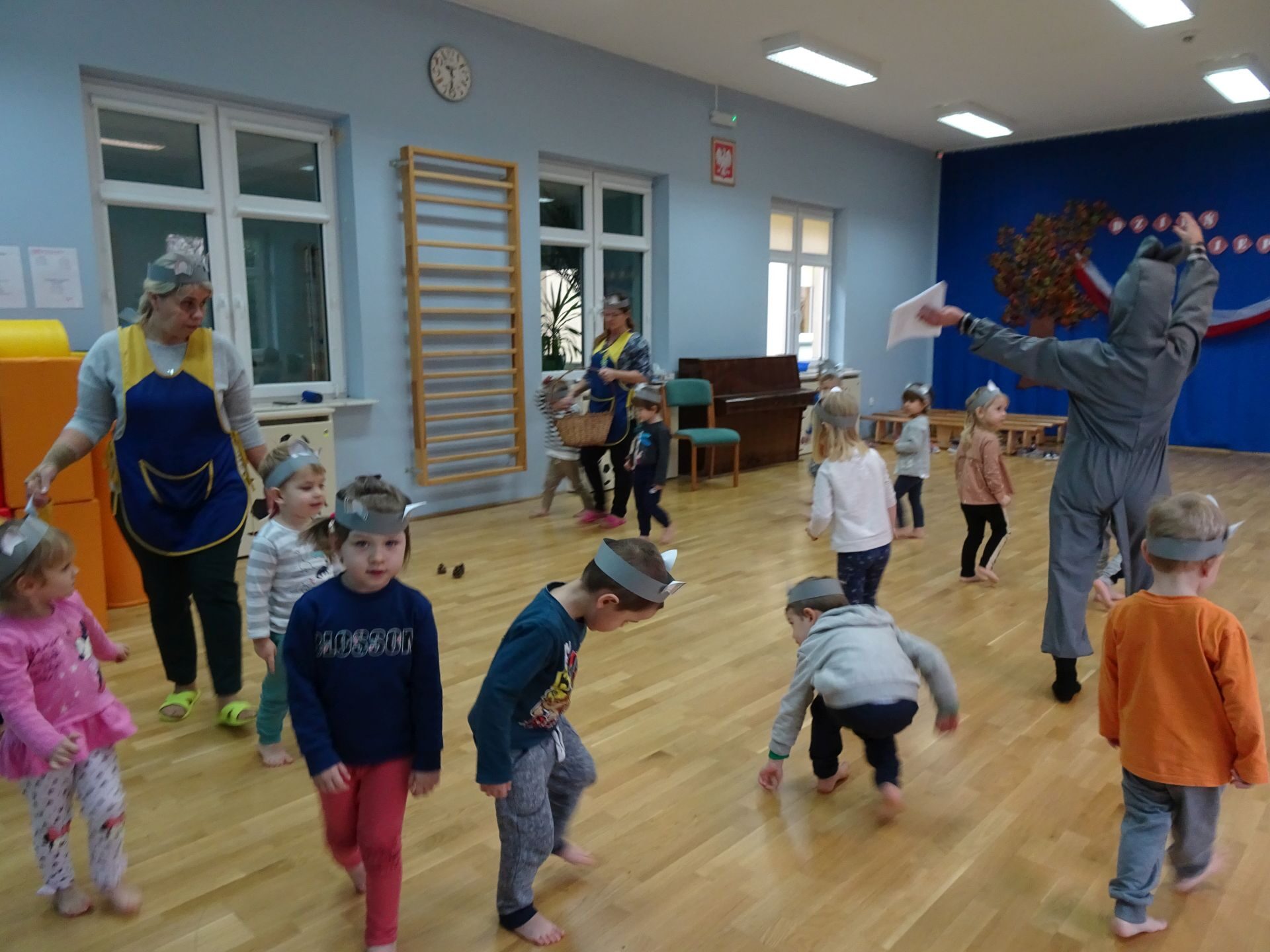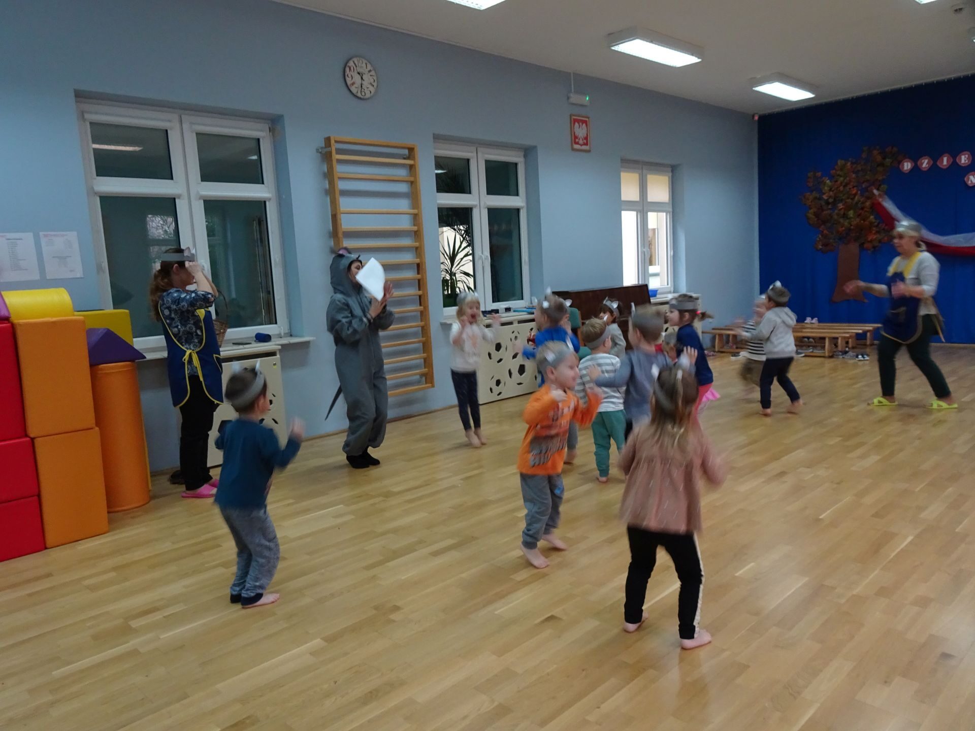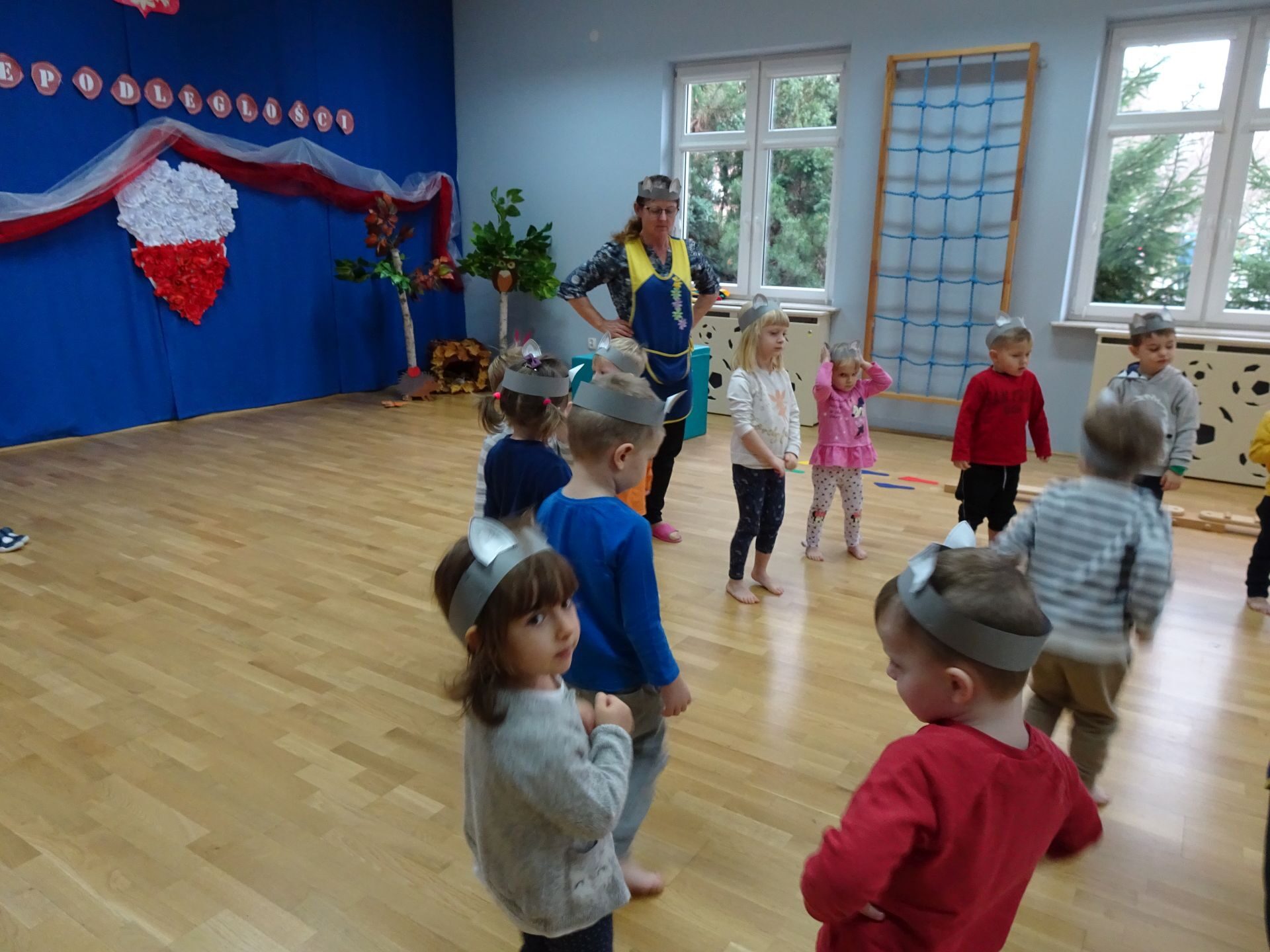 Dnia 30.11.2020 w grupie II „Kotki” odbyły się zajęcia ruchowe w Sali rekreacyjnej prowadzone przez nauczycielkę Katarzynę Kober. Motywem przewodnim zajęć była „Wizyta u Myszki Jadzi”. Dzieci rozgrzewały się przy piosence „Gimnastyka to zabawa”, następnie dzieci przy muzyce relaksacyjnej „Dźwięki lasu”  wyruszyły w „drogę przez las” szukając domku Myszki. Pod drodze dzieci pokonywały przeszkody: zbierały kasztany i szyszki, wąchały kwiaty, naśladowały szum drzew, omijały norki. Dzieci pokonywały ścieżkę sensoryczną, przechodziły pod przeszkodą z kształtek gimnastycznych i wskakiwały do szarfy, którą przekładały od stóp do głowy. Dzieciom zabawa bardzo się podobała.