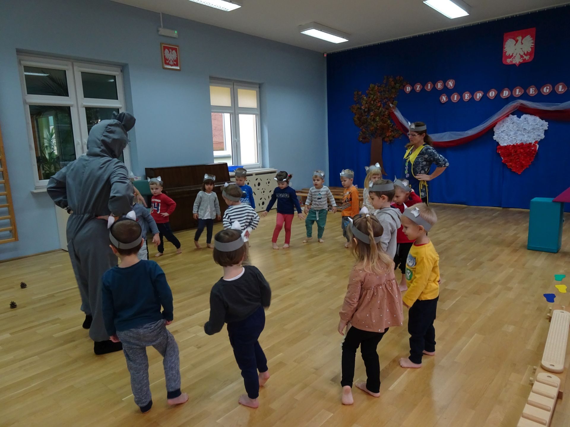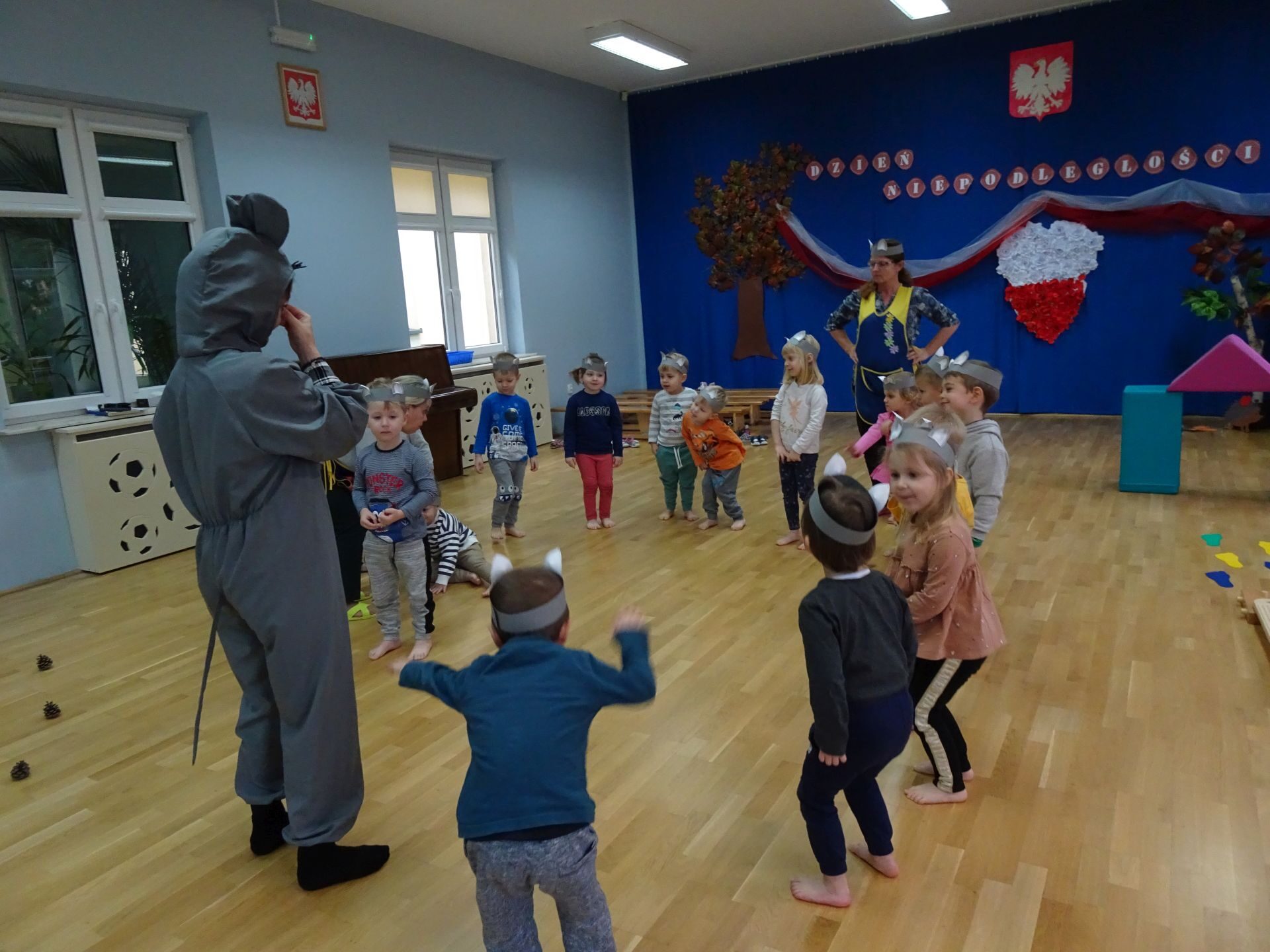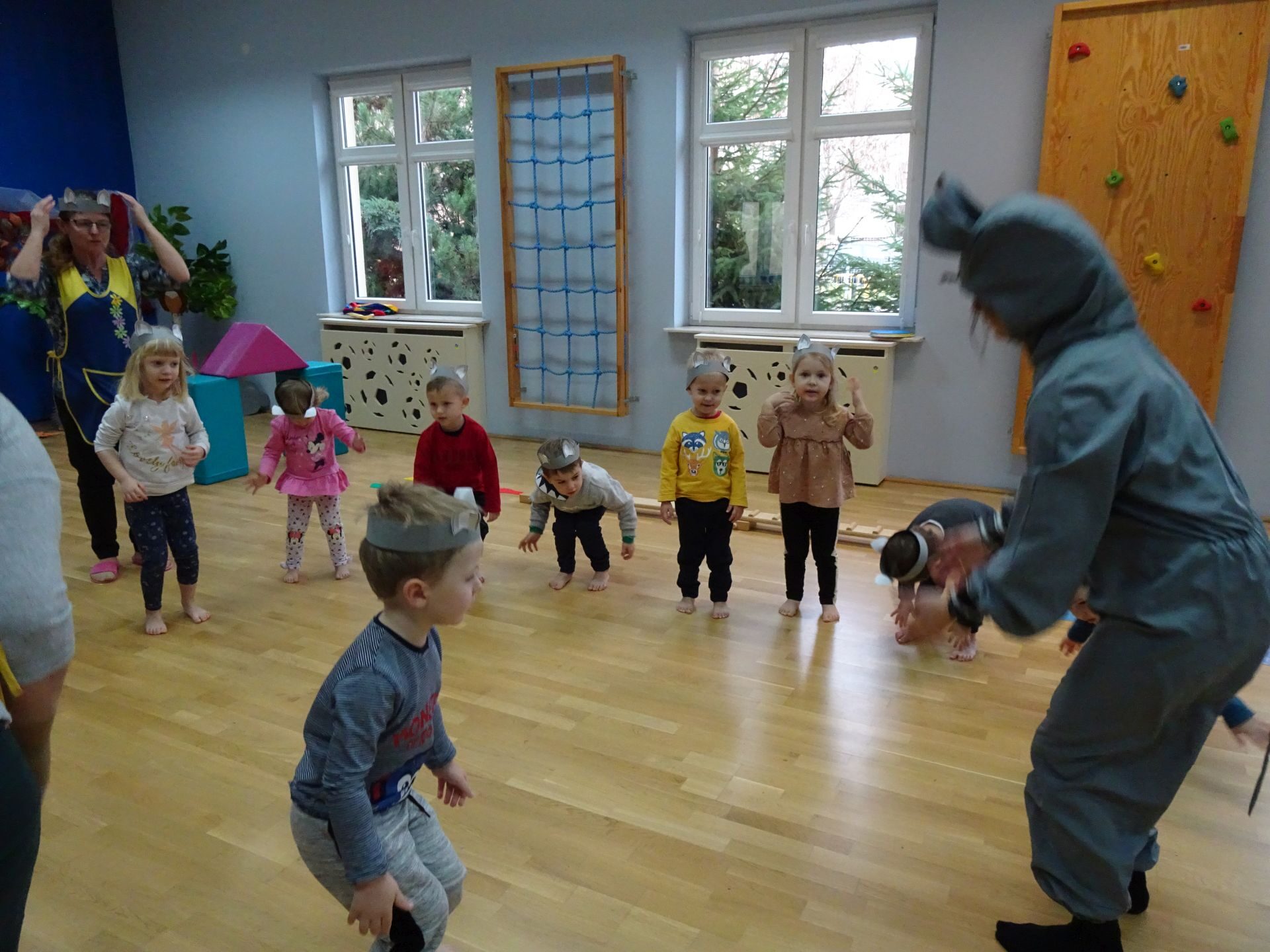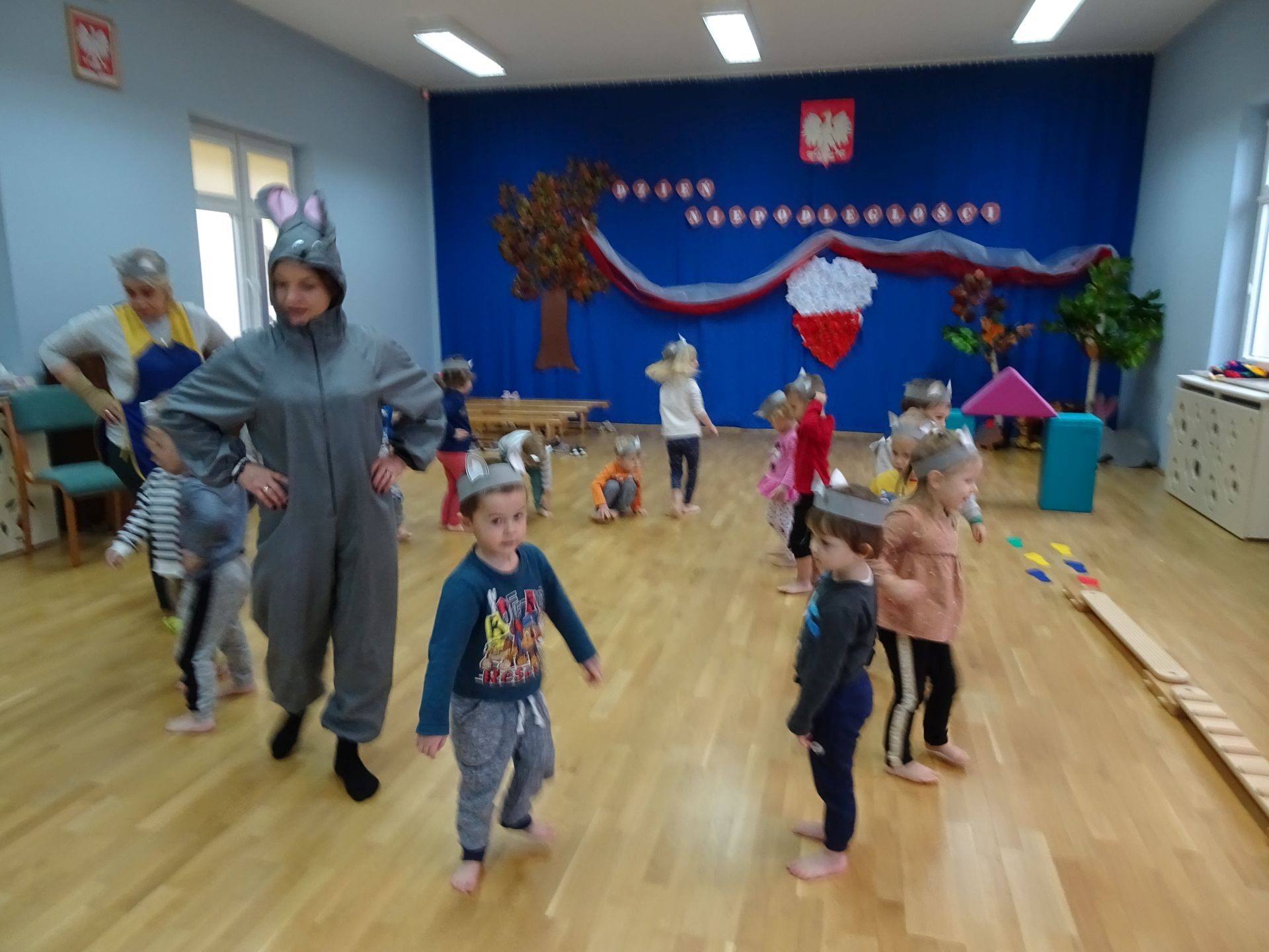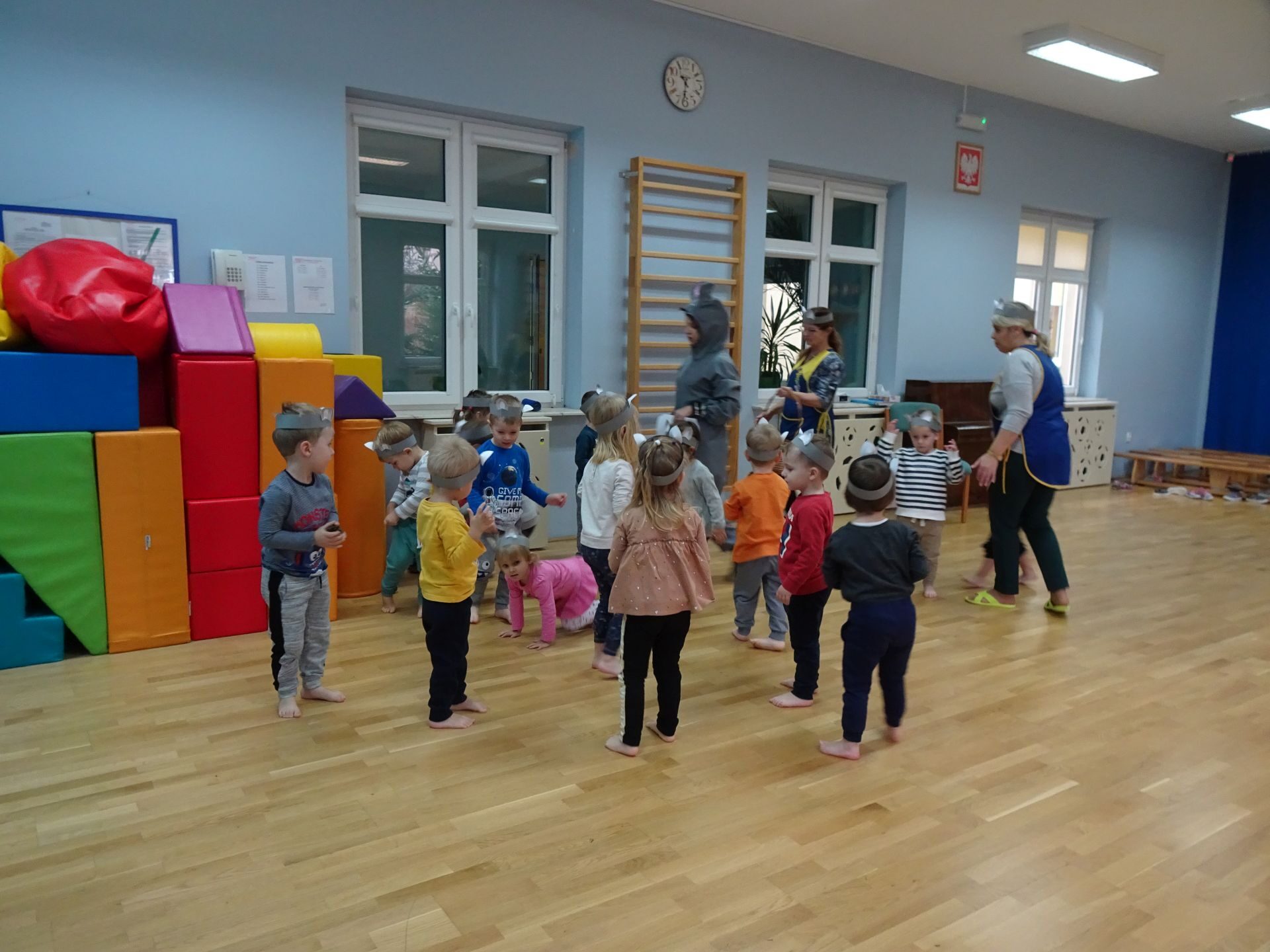Dnia 30.11.2020 w grupie II „Kotki” odbyły się zajęcia ruchowe w Sali rekreacyjnej prowadzone przez nauczycielkę Katarzynę Kober. Motywem przewodnim zajęć była „Wizyta u Myszki Jadzi”. Dzieci rozgrzewały się przy piosence „Gimnastyka to zabawa”, następnie dzieci przy muzyce relaksacyjnej „Dźwięki lasu”  wyruszyły w „drogę przez las” szukając domku Myszki. Pod drodze dzieci pokonywały przeszkody: zbierały kasztany i szyszki, wąchały kwiaty, naśladowały szum drzew, omijały norki. Dzieci pokonywały ścieżkę sensoryczną, przechodziły pod przeszkodą z kształtek gimnastycznych i wskakiwały do szarfy, którą przekładały od stóp do głowy. Dzieciom zabawa bardzo się podobała.