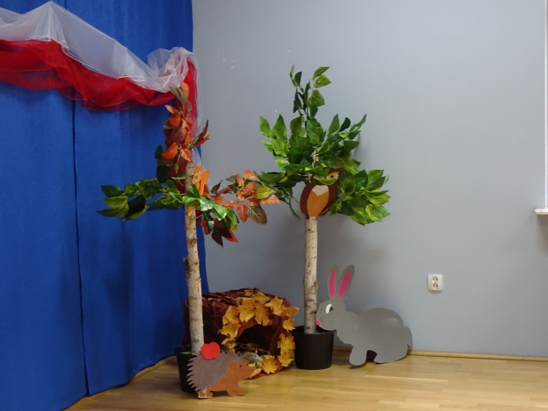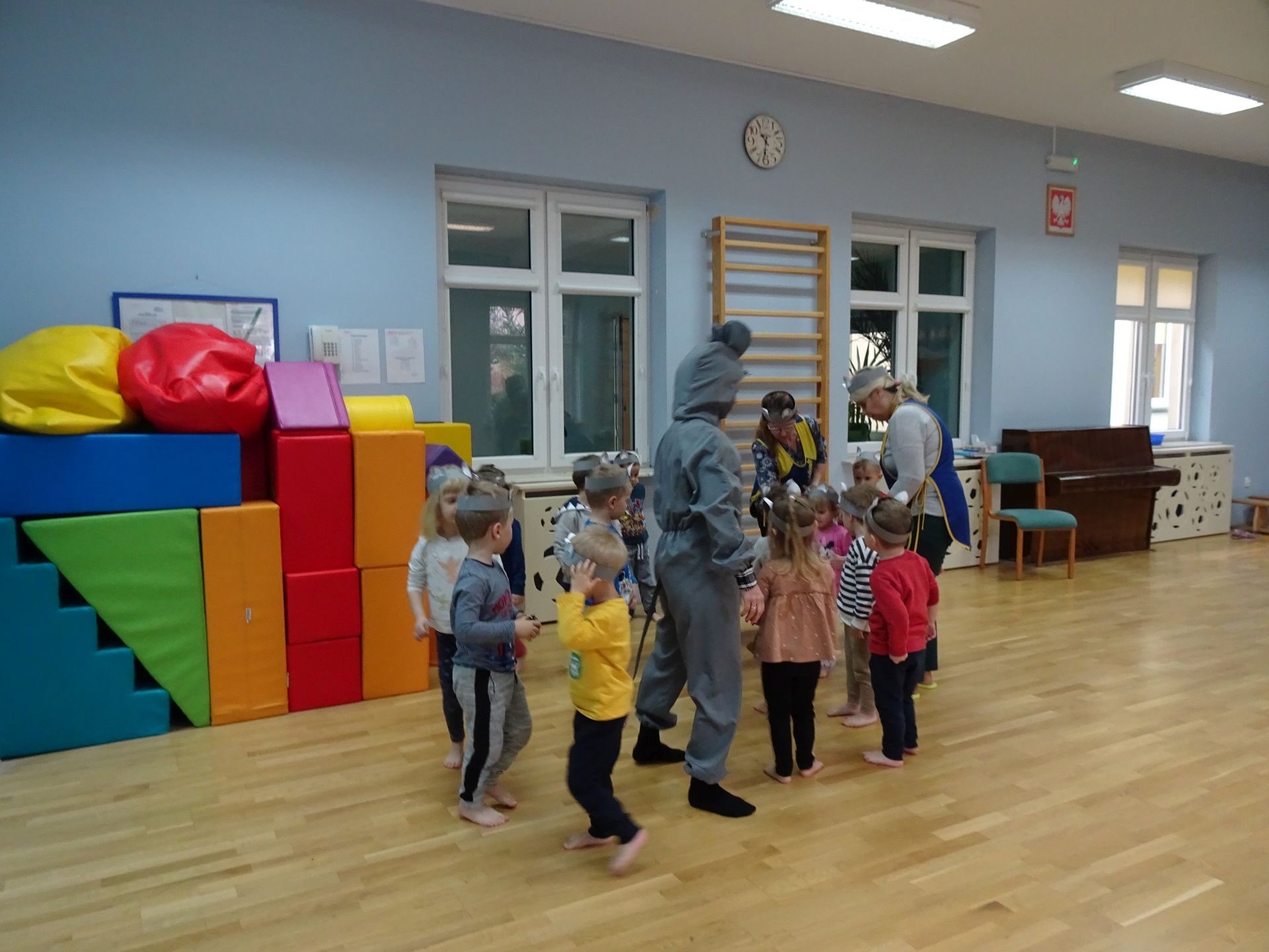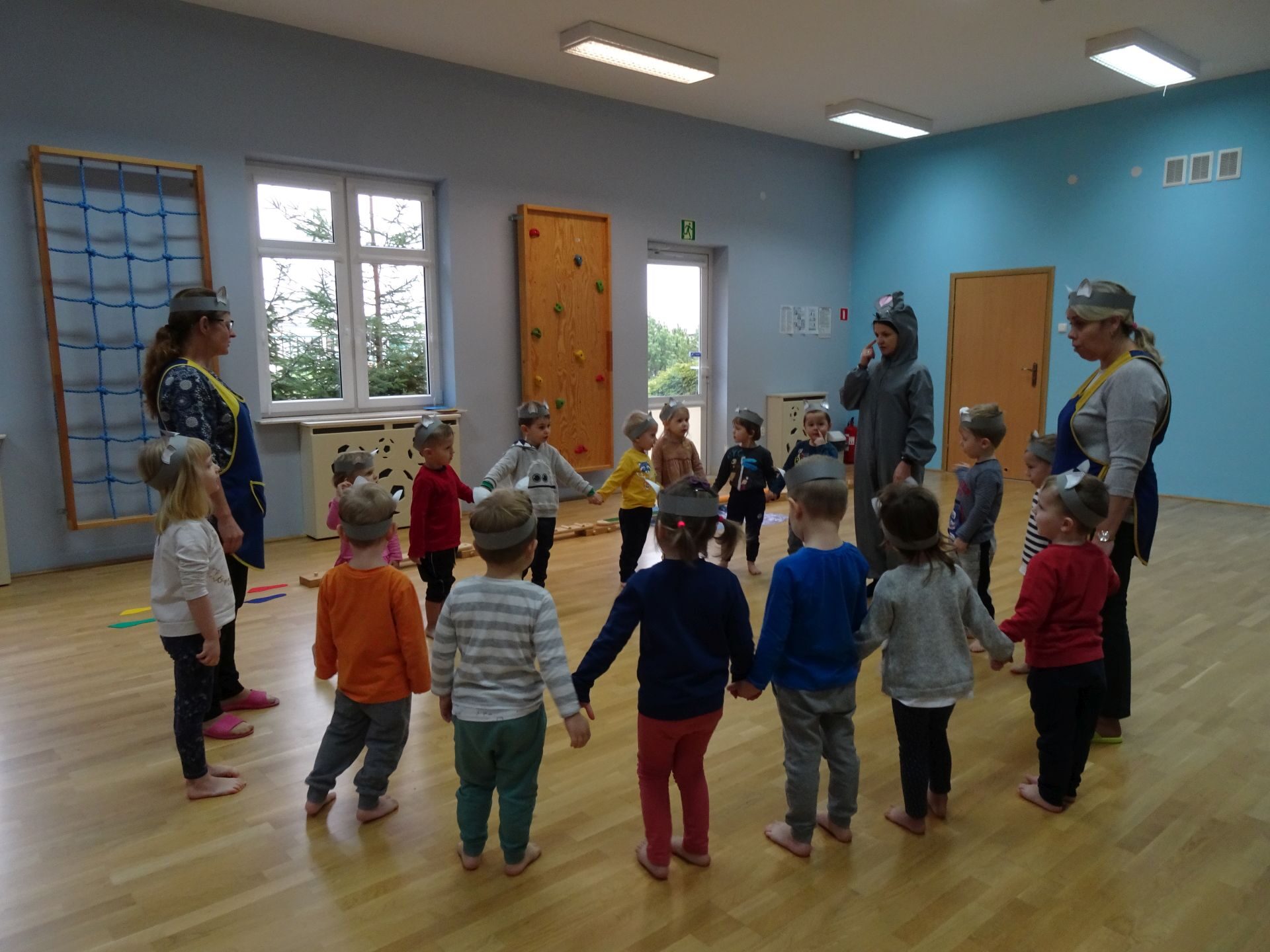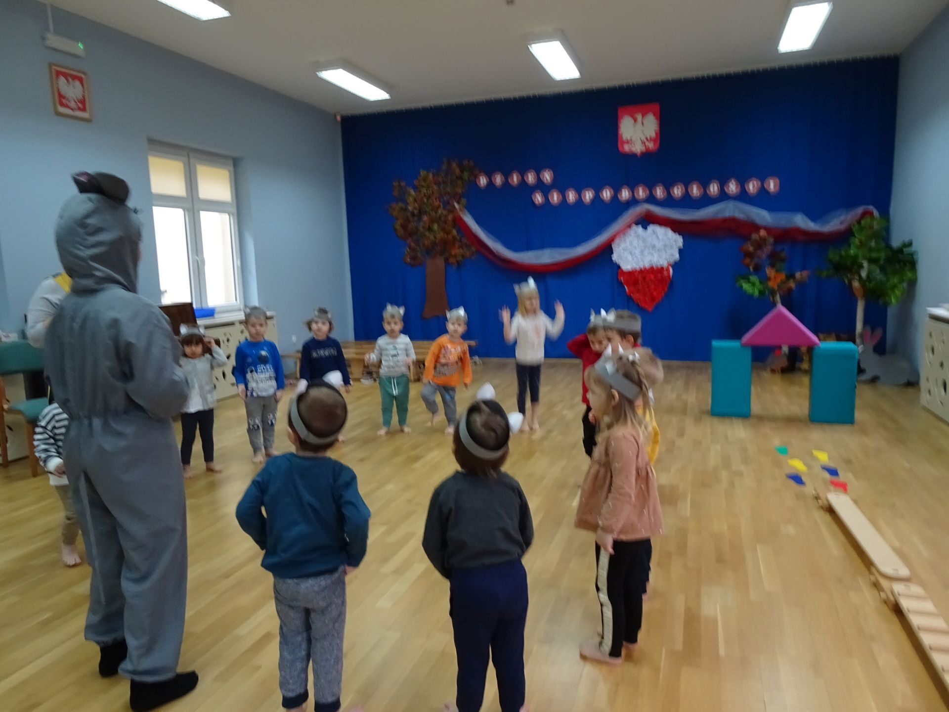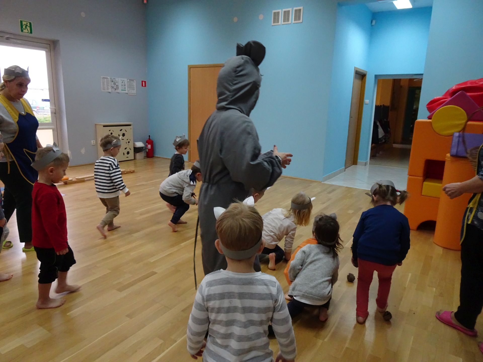 Dnia 30.11.2020 w grupie II „Kotki” odbyły się zajęcia ruchowe w Sali rekreacyjnej prowadzone przez nauczycielkę Katarzynę Kober. Motywem przewodnim zajęć była „Wizyta u Myszki Jadzi”. Dzieci rozgrzewały się przy piosence „Gimnastyka to zabawa”, następnie dzieci przy muzyce relaksacyjnej „Dźwięki lasu”  wyruszyły w „drogę przez las” szukając domku Myszki. Pod drodze dzieci pokonywały przeszkody: zbierały kasztany i szyszki, wąchały kwiaty, naśladowały szum drzew, omijały norki. Dzieci pokonywały ścieżkę sensoryczną, przechodziły pod przeszkodą z kształtek gimnastycznych i wskakiwały do szarfy, którą przekładały od stóp do głowy. Dzieciom zabawa bardzo się podobała.