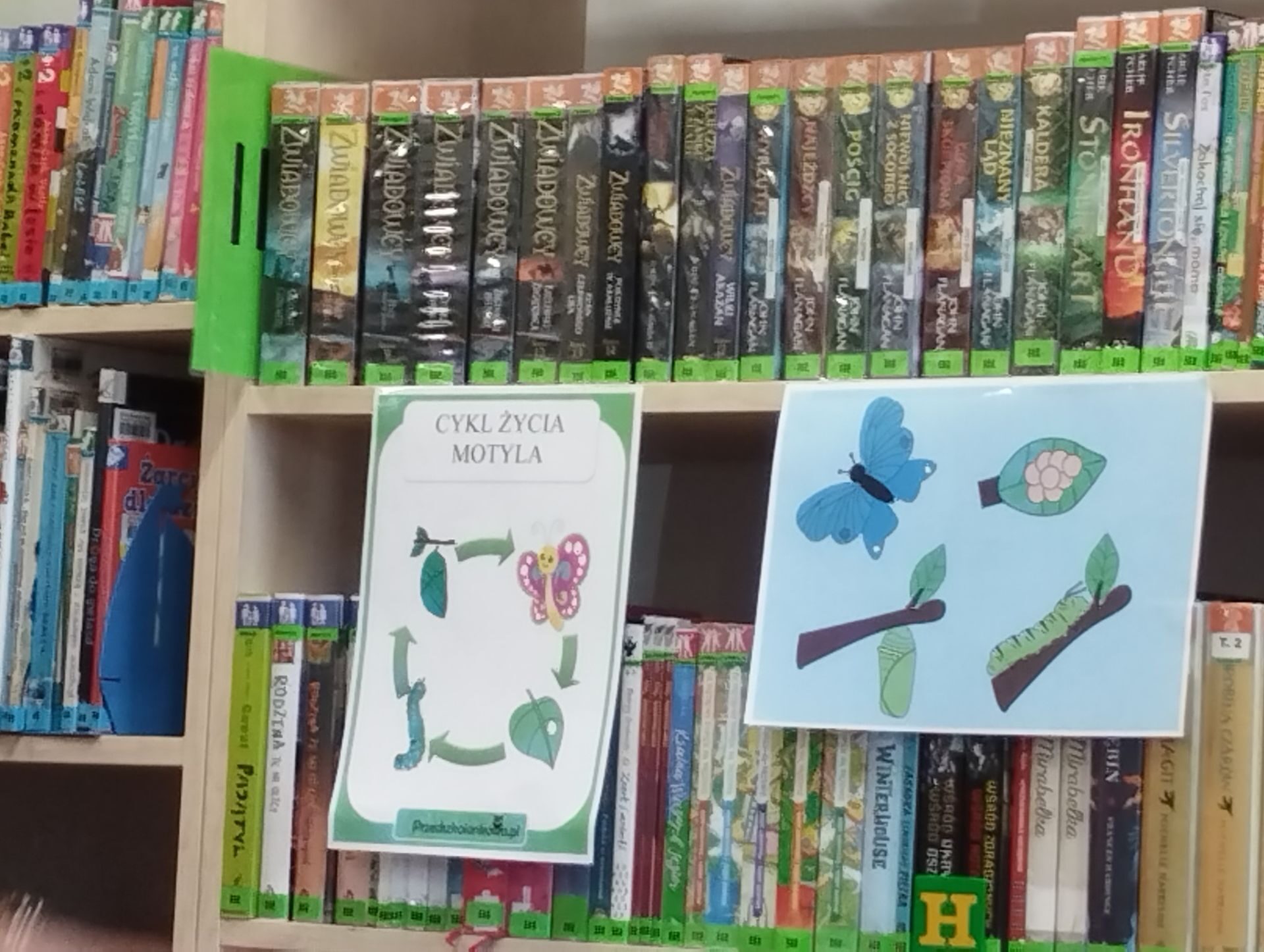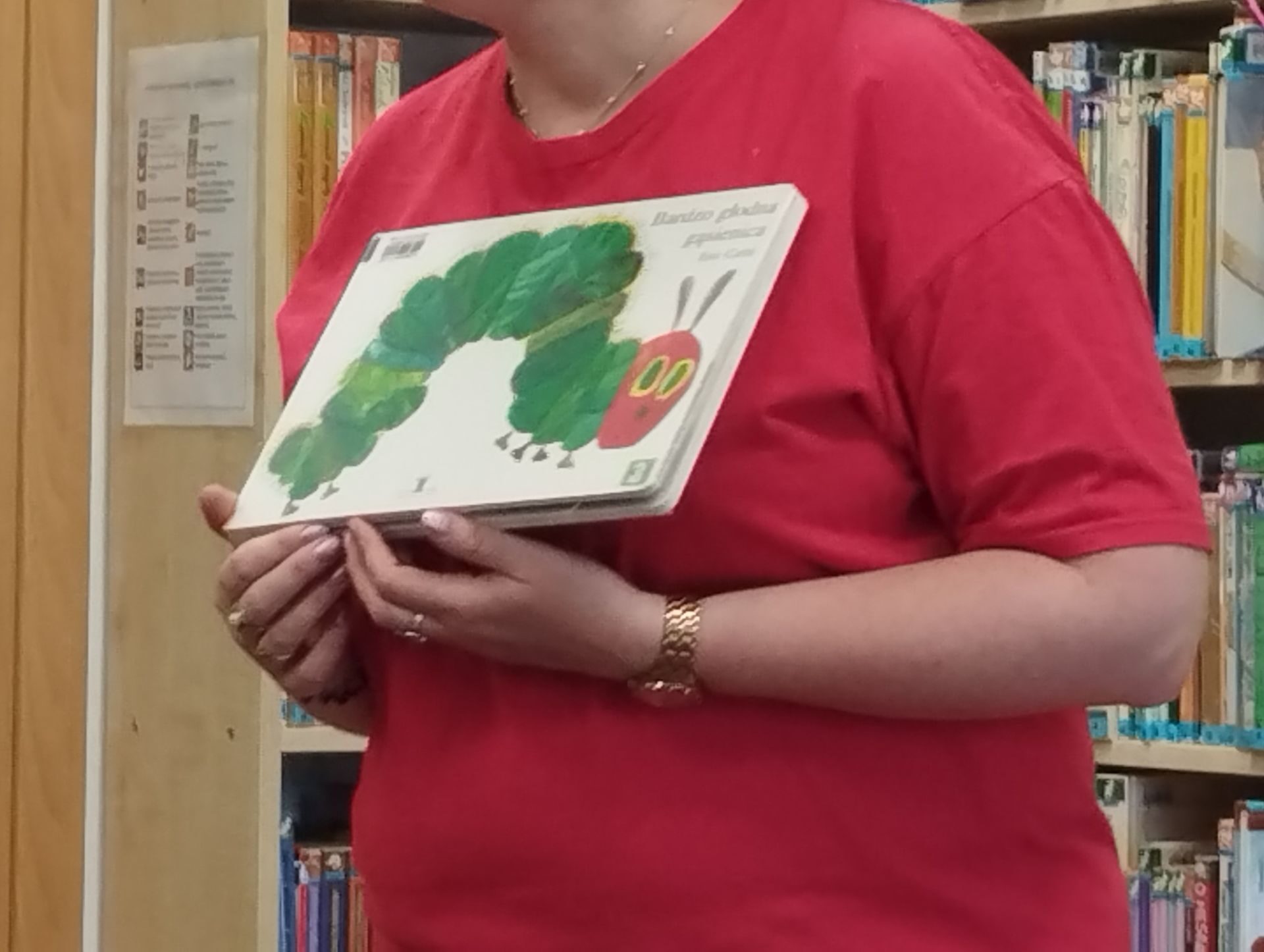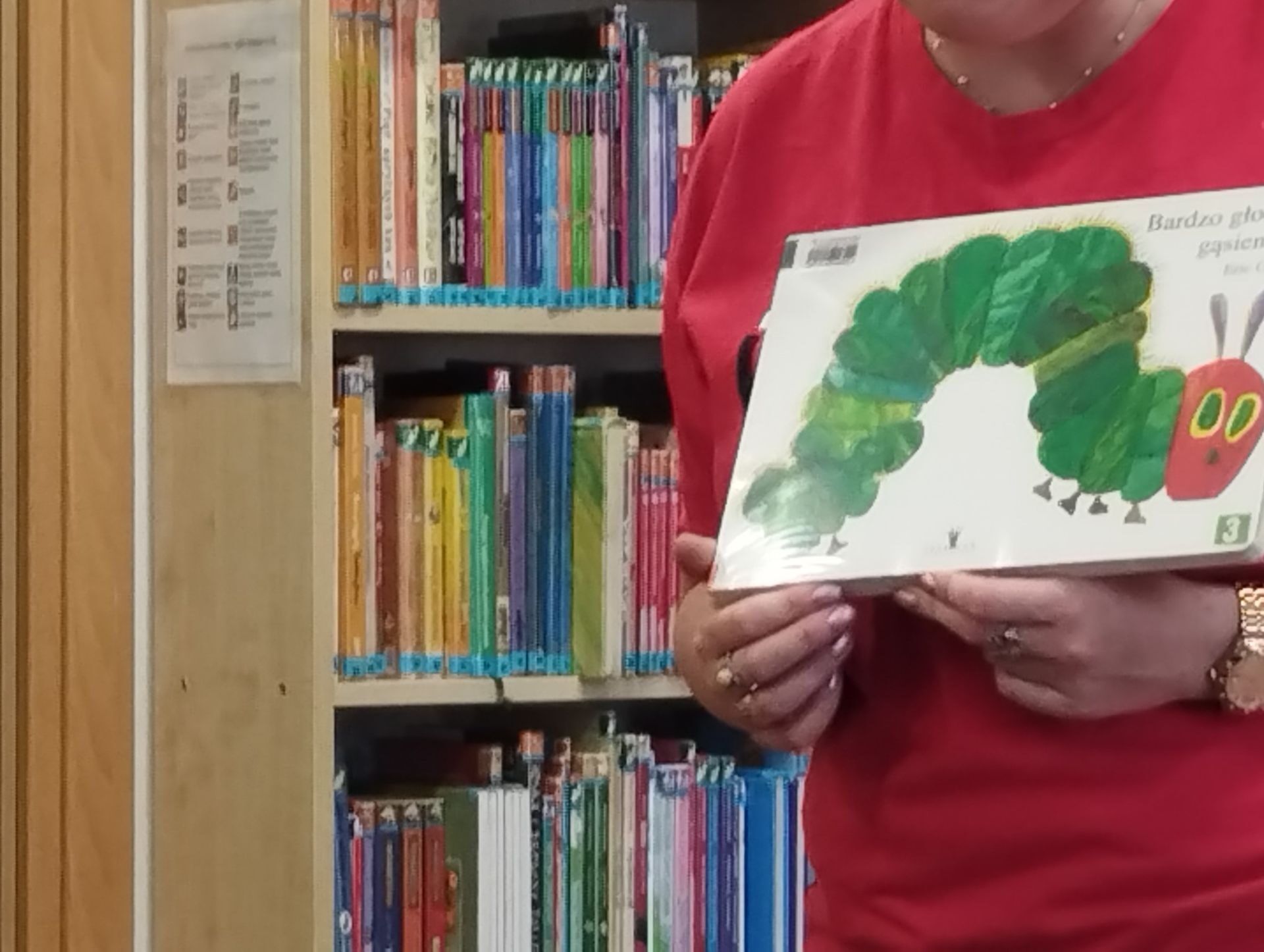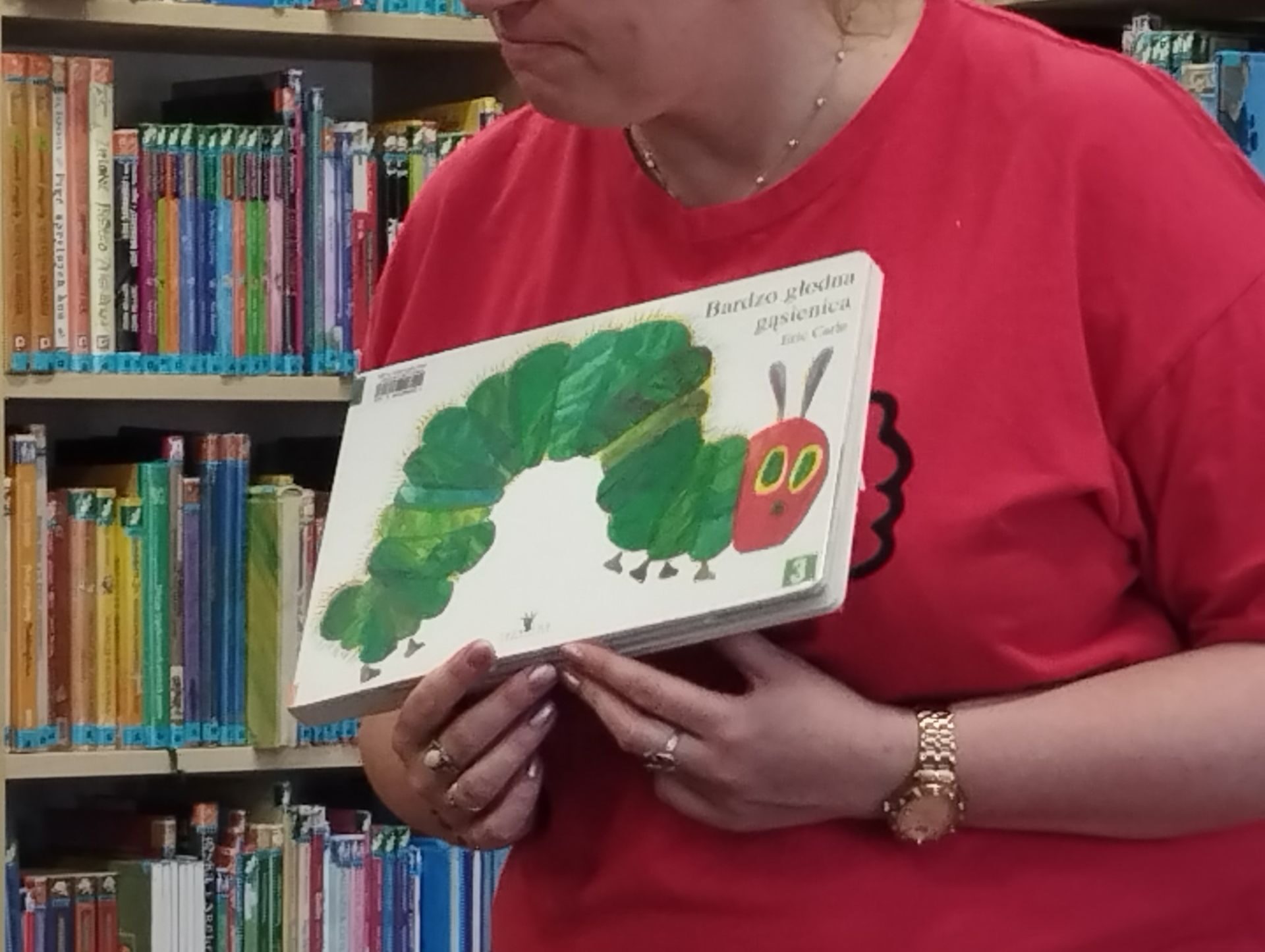 Dnia 17 maja w dzieci z grupy I wzięły udział w zajęciach w Bibliotece Publicznej w Józefowie. Pani oprowadziła przeczytała dzieciom opowiadanie pt.: “Bardzo głodna gąsienica” E. Carle, następnie dzieci wykonały wspólnie wielką gąsienicę.