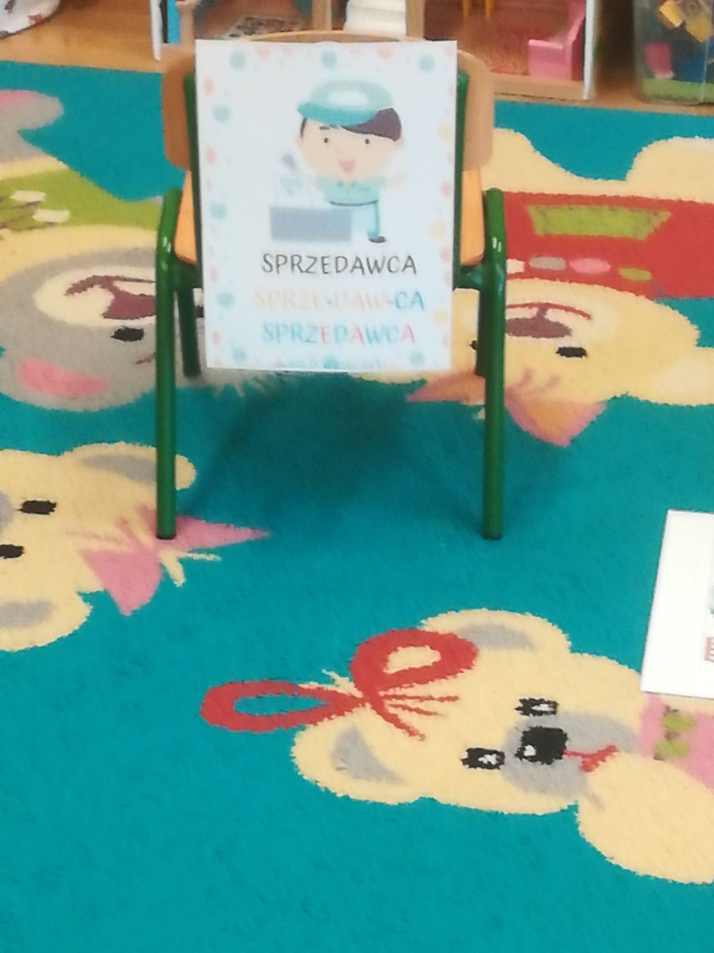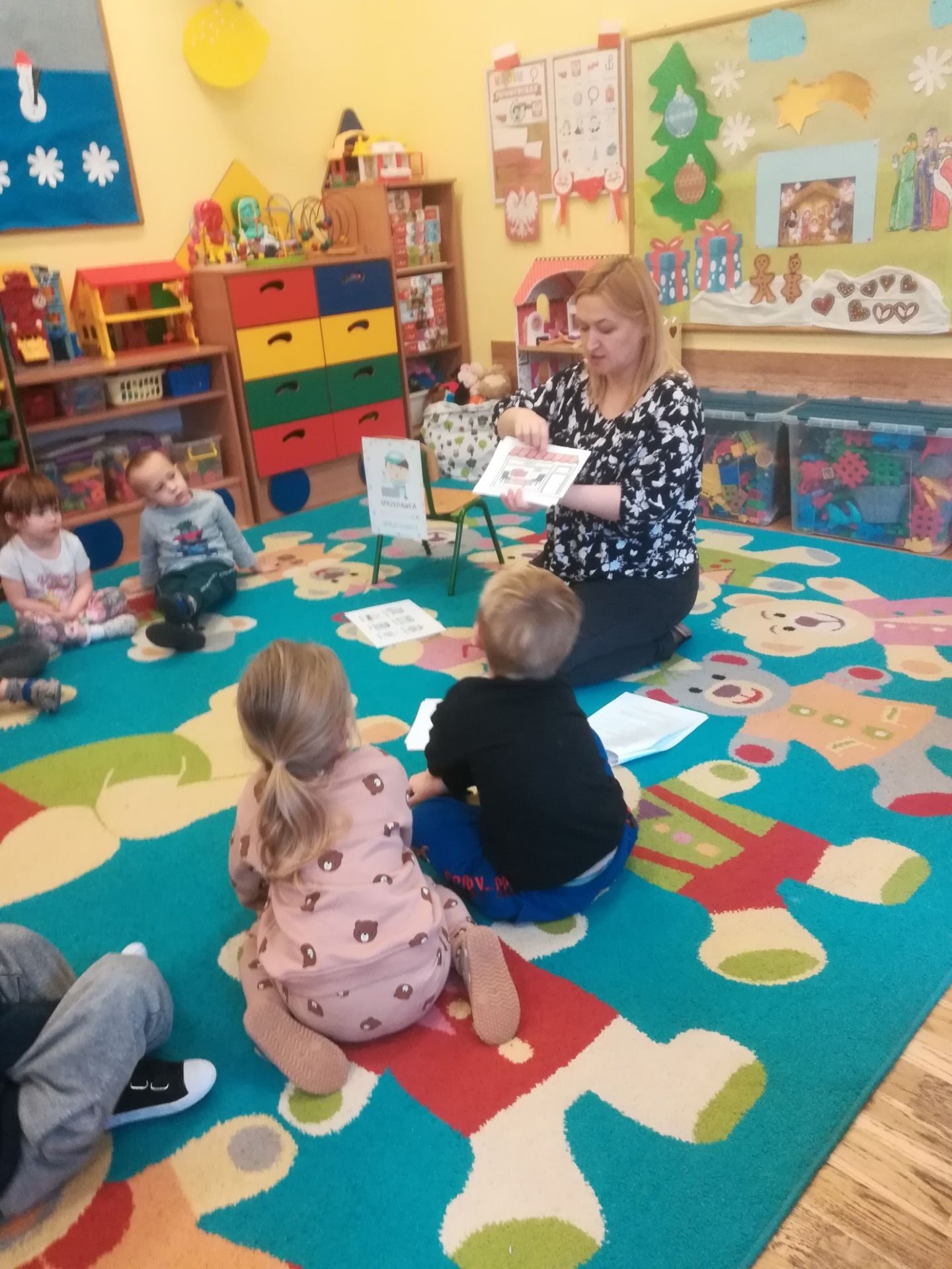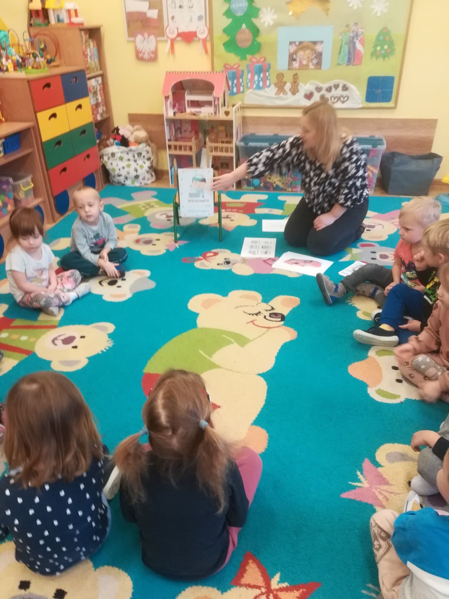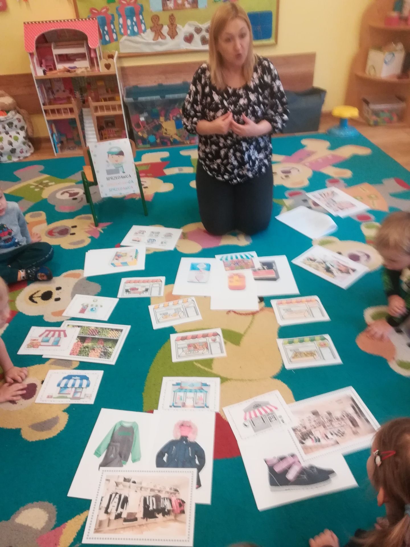 W grudniu we wszystkich grupach wiekowych przeprowadzono zajęcia na temat zawodu sprzedawcy. dzieci dowiedziały się na czym polega praca sprzedawcy. Poznały różne rodzaje sklepów. W czasie zabawy w sklep segregowały różne przedmioty, doskonaliły umiejętność liczenia. Na zakończenie wykonały pracę plastyczną.