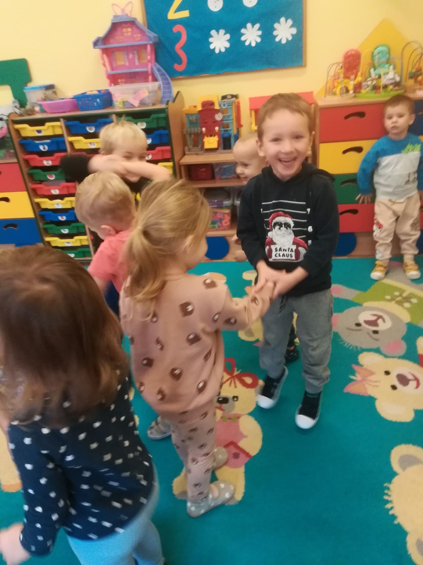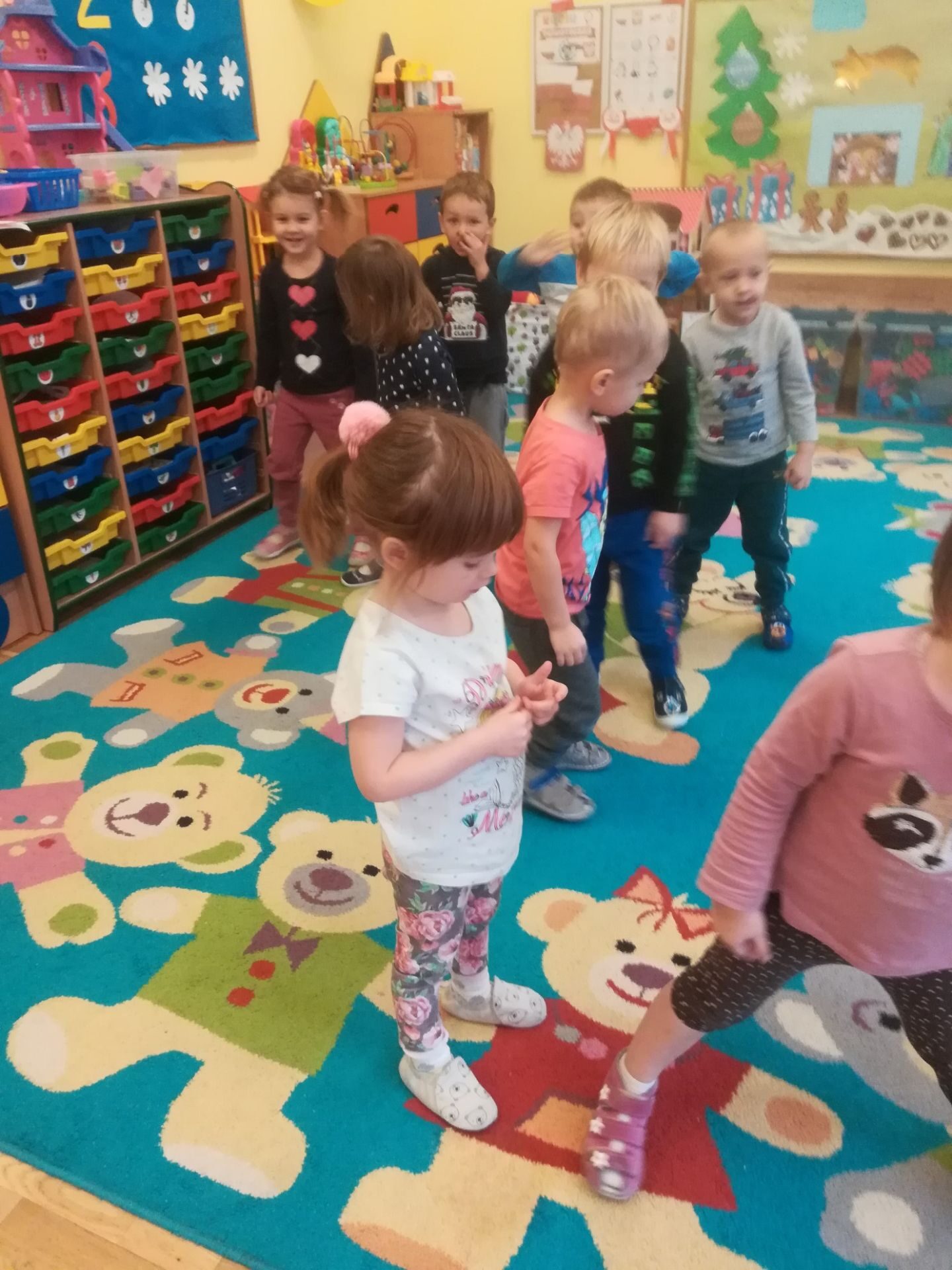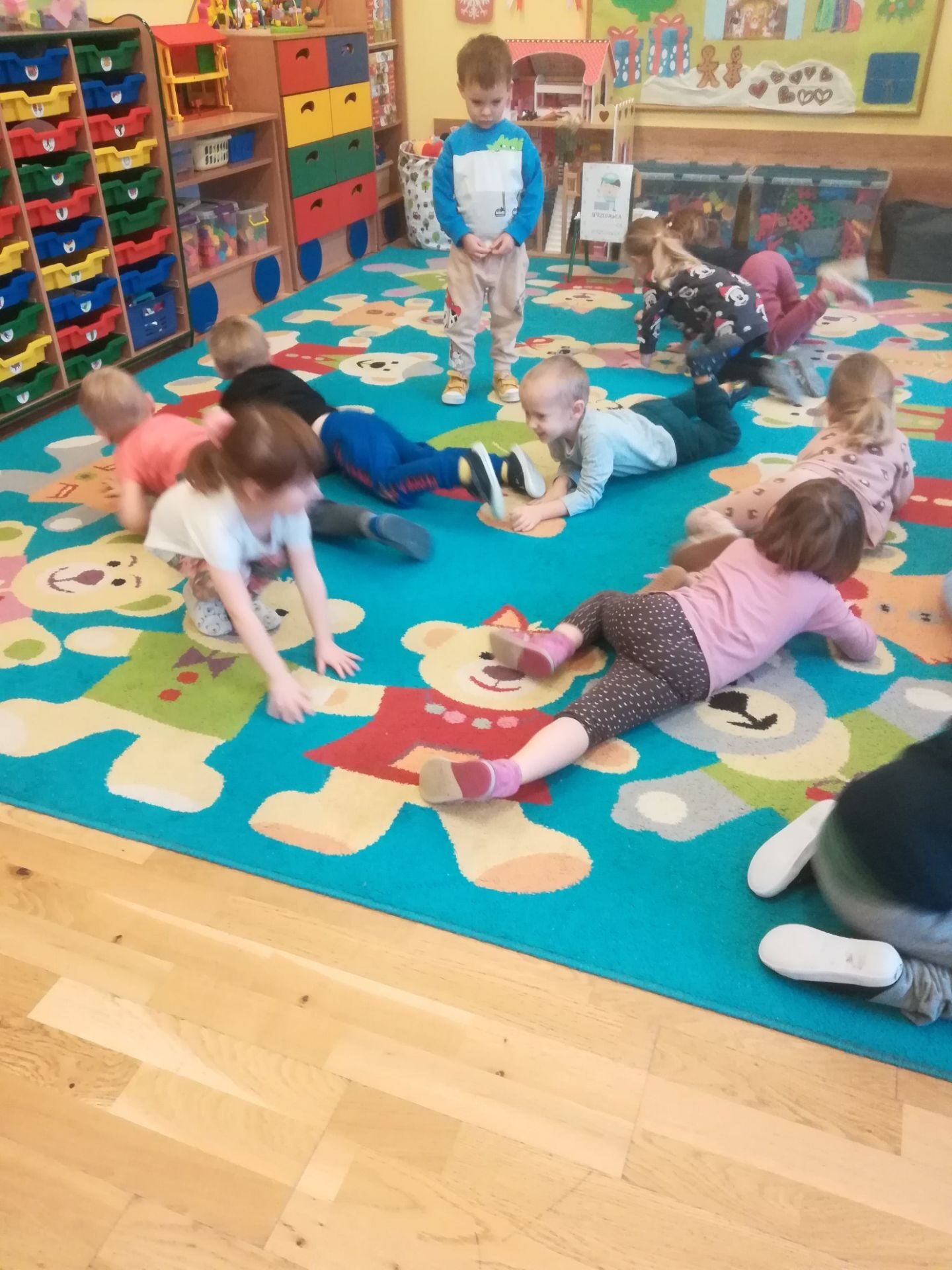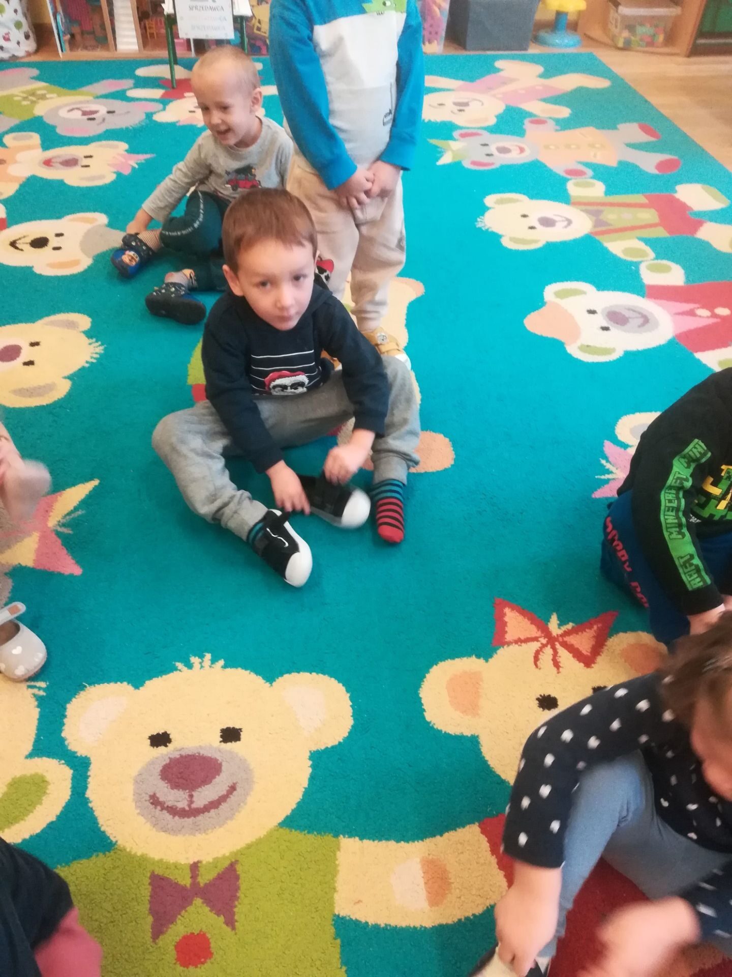 W grudniu we wszystkich grupach wiekowych przeprowadzono zajęcia na temat zawodu sprzedawcy. dzieci dowiedziały się na czym polega praca sprzedawcy. Poznały różne rodzaje sklepów. W czasie zabawy w sklep segregowały różne przedmioty, doskonaliły umiejętność liczenia. Na zakończenie wykonały pracę plastyczną.